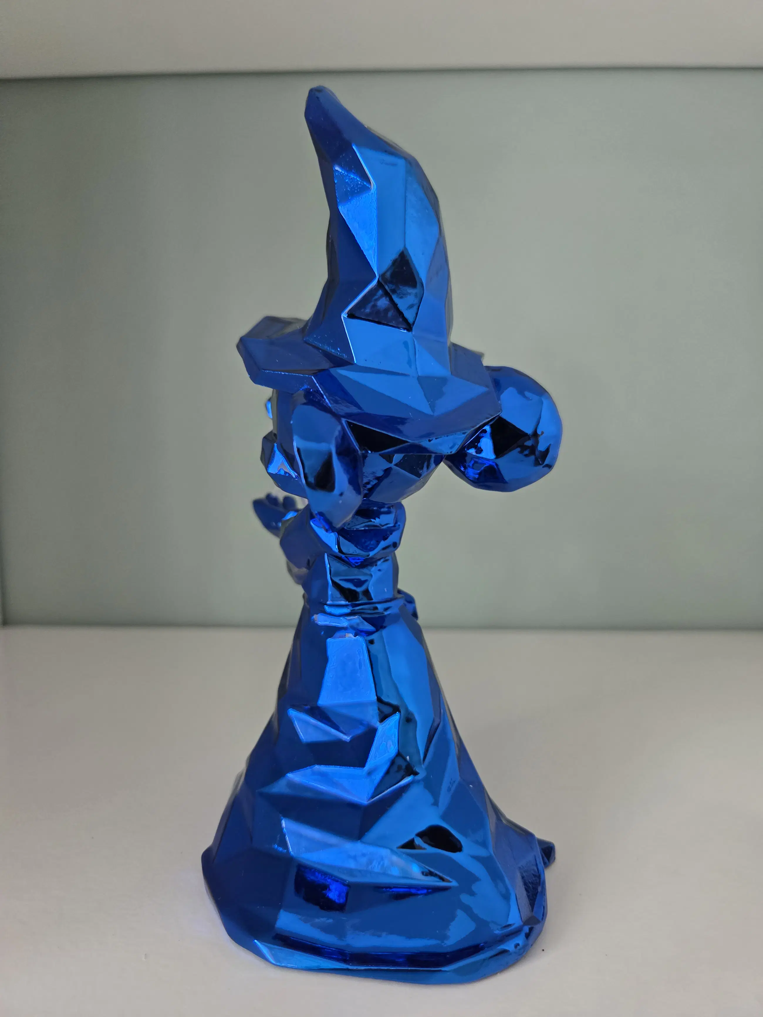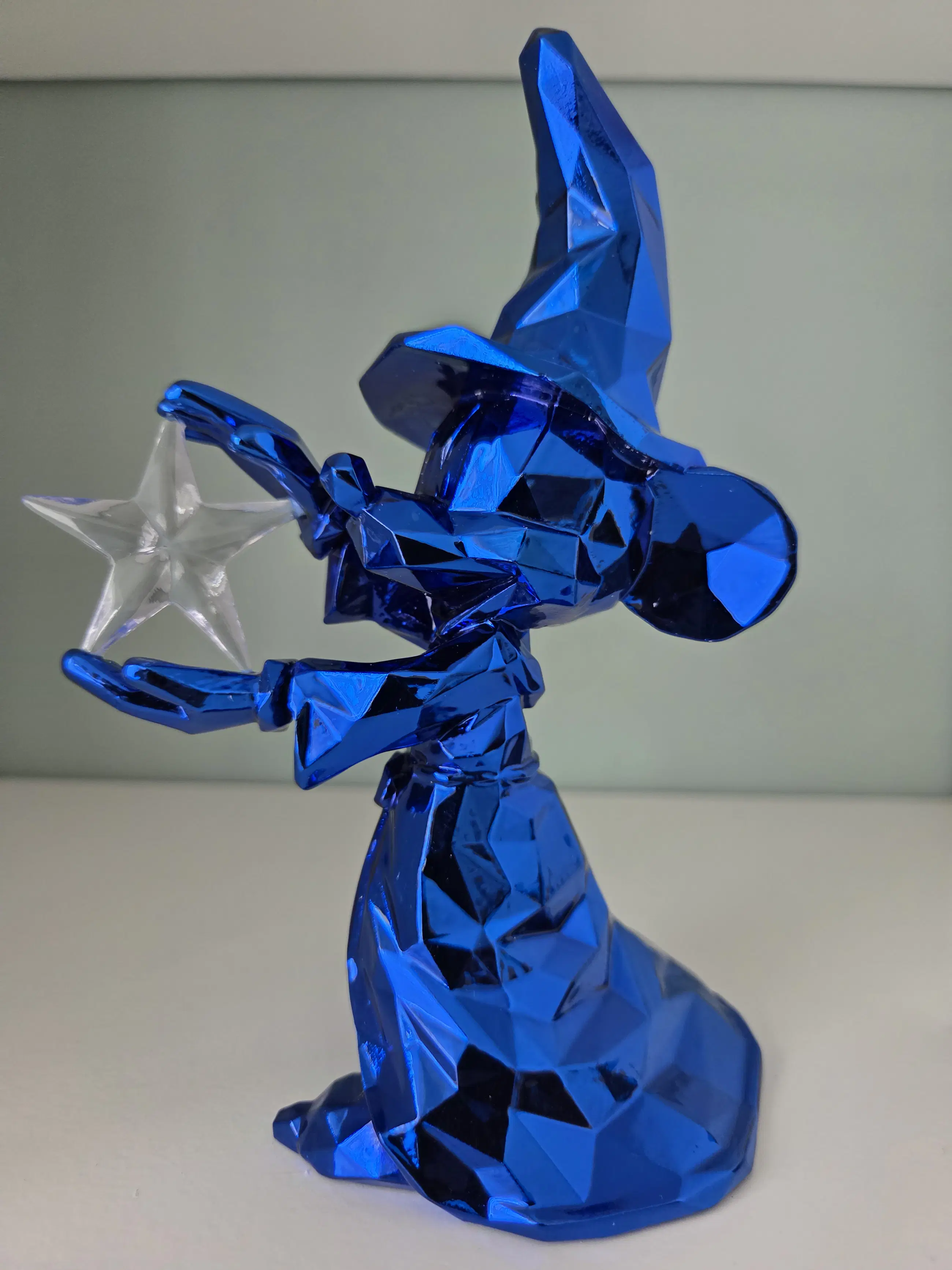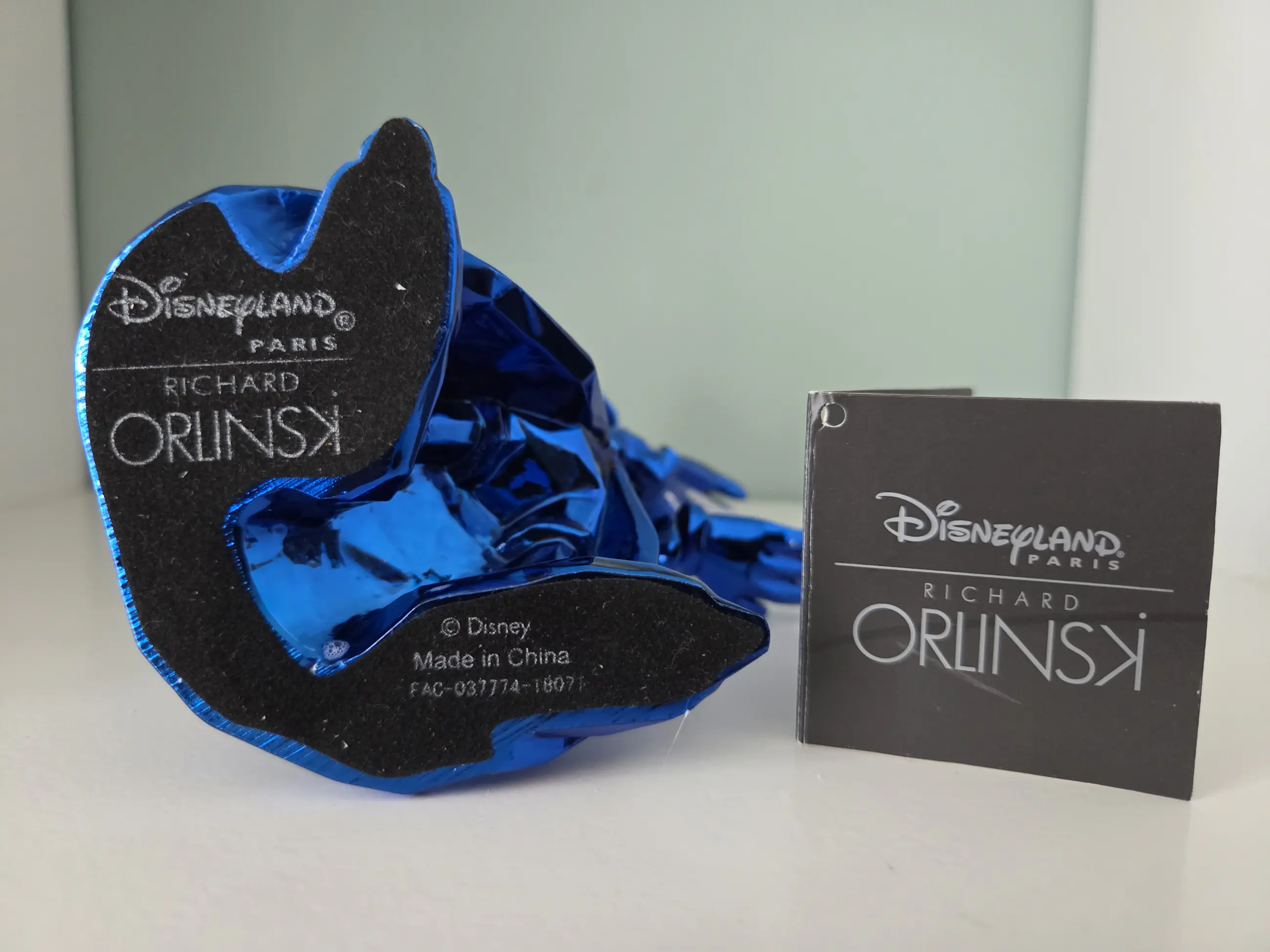 Dit verzamelobject is een gelimiteerd Mickey Mouse beeldje als "De Tovenaarsleerling", ontworpen door de Franse kunstenaar Richard Orlinski in samenwerking met Disneyland Paris. Inclusief bijbehorende Disney label. Materiaal: Glanzende blauwe hars (resin). Afmetingen: Ongeveer 17 cm hoog. Design: Facetgeslepen, moderne pop-art stijl. Op één vinger zit een lichte beschadiging, zie foto. Wordt verpakt in piepschuim en wit doosje.
