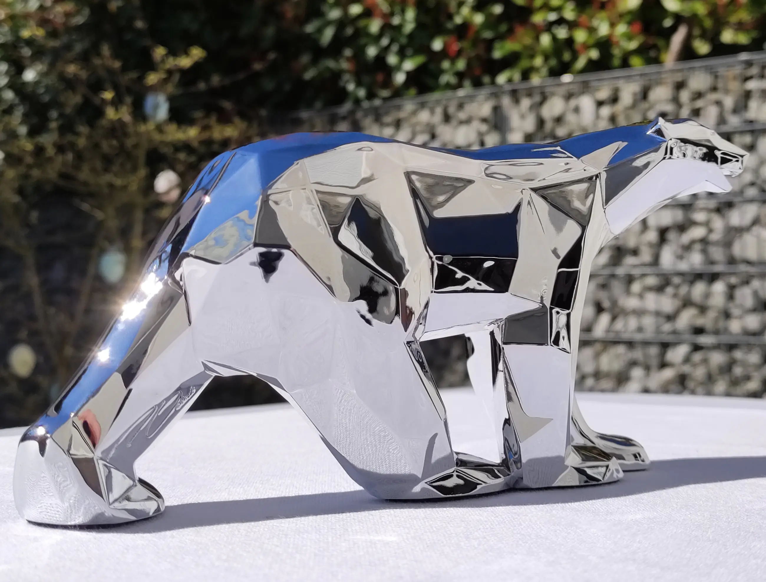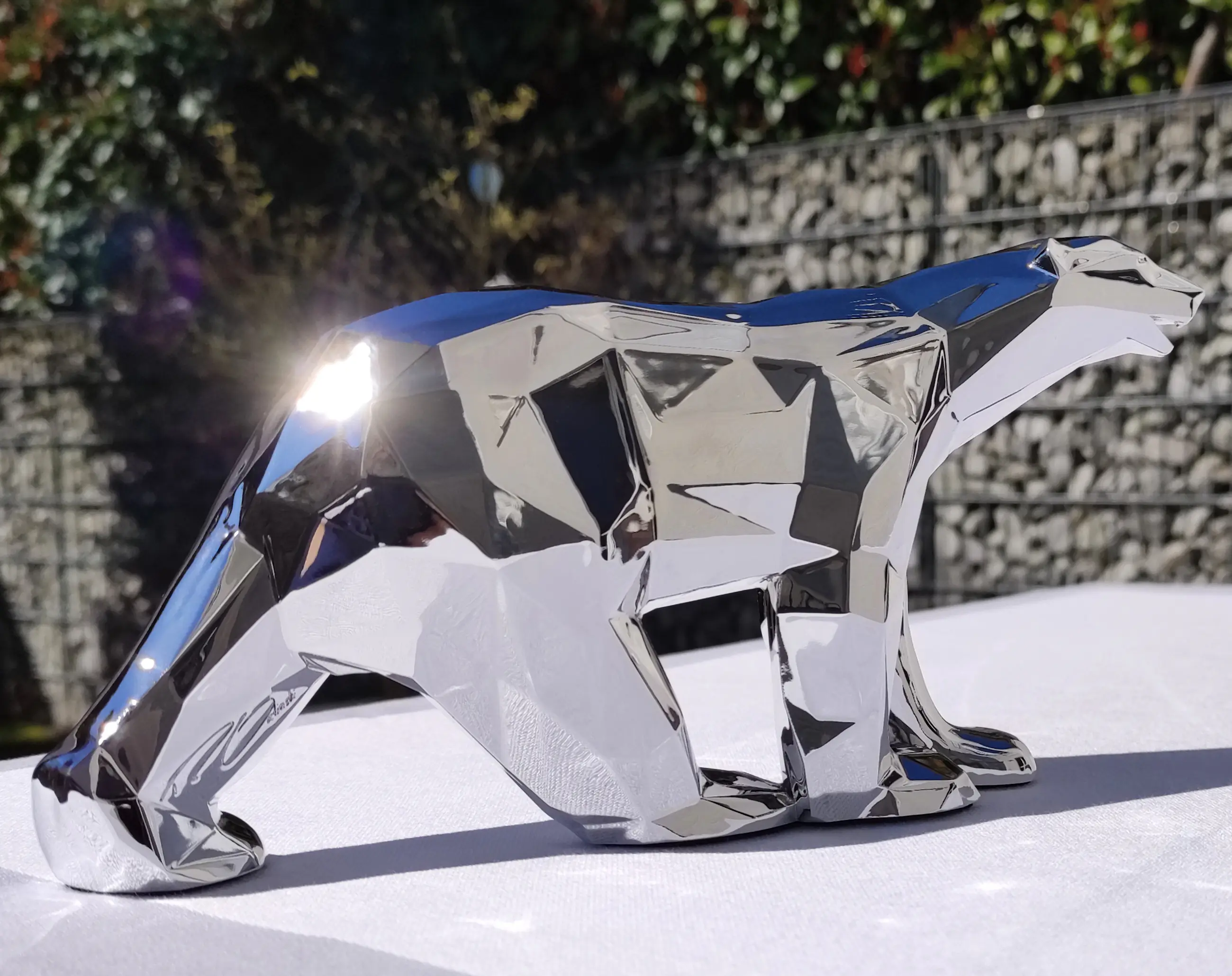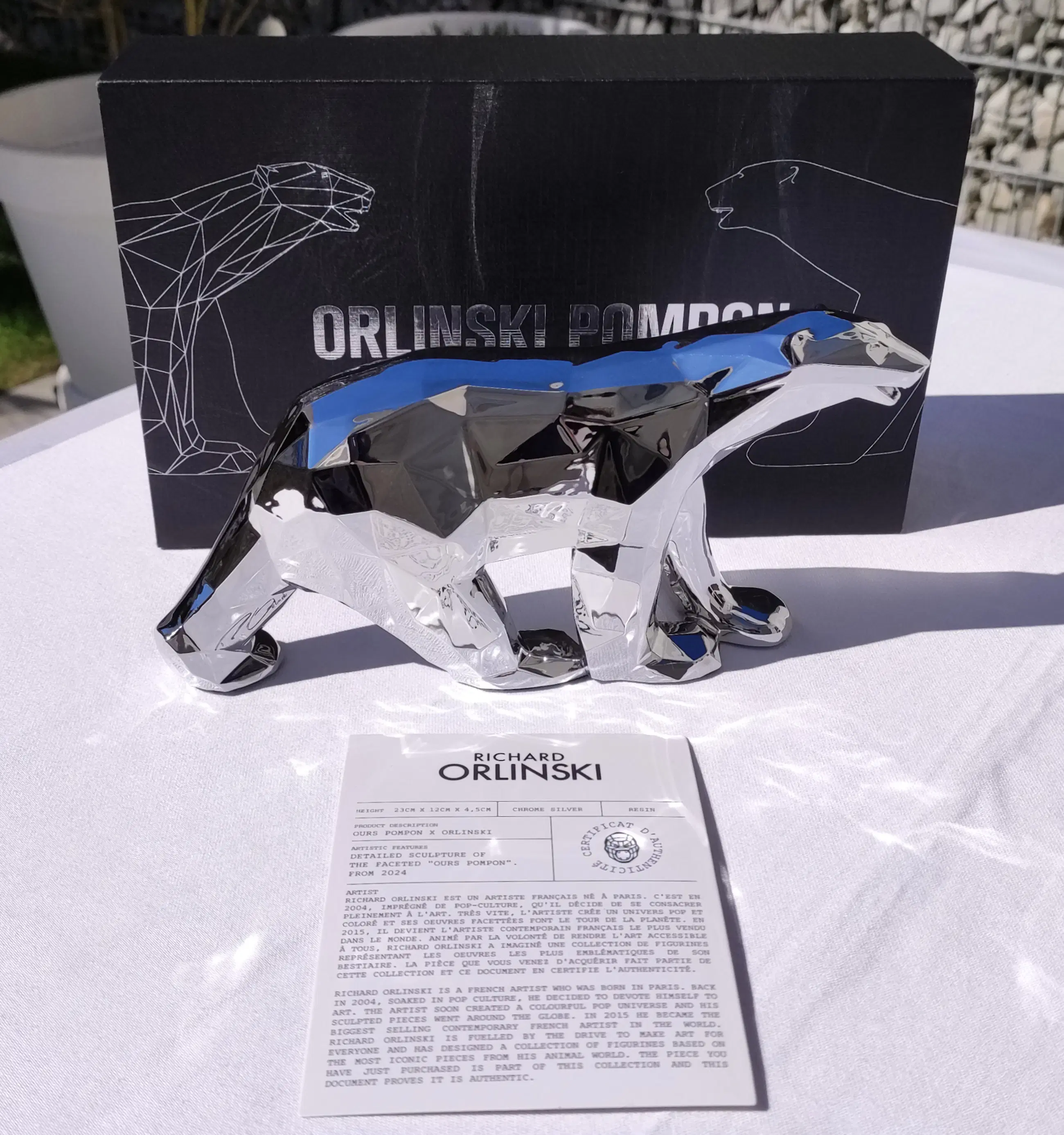 Het OURS POMPON X ORLINSKI (SILVER EDITION) sculptuur van Richard Orlinski. Het beeld in de vorm van een ijsbeer werd in deze maat en kleur als unieke editie uitgebracht in 2024/2025.