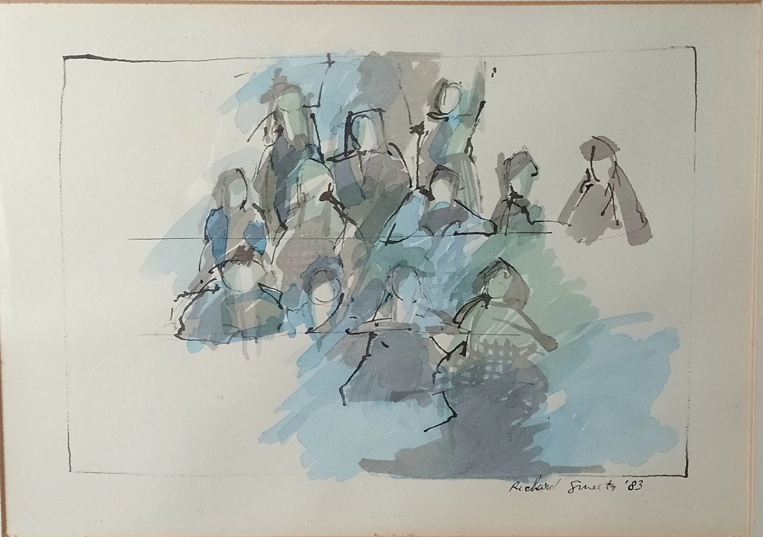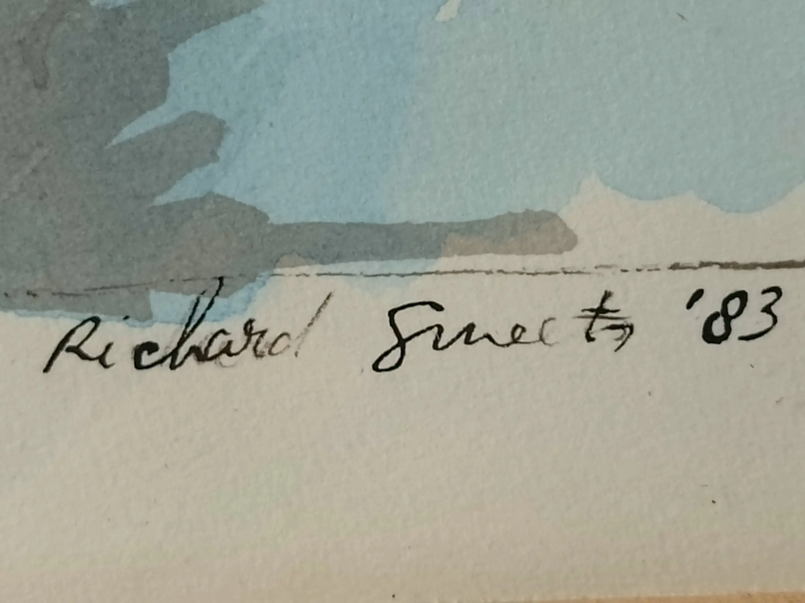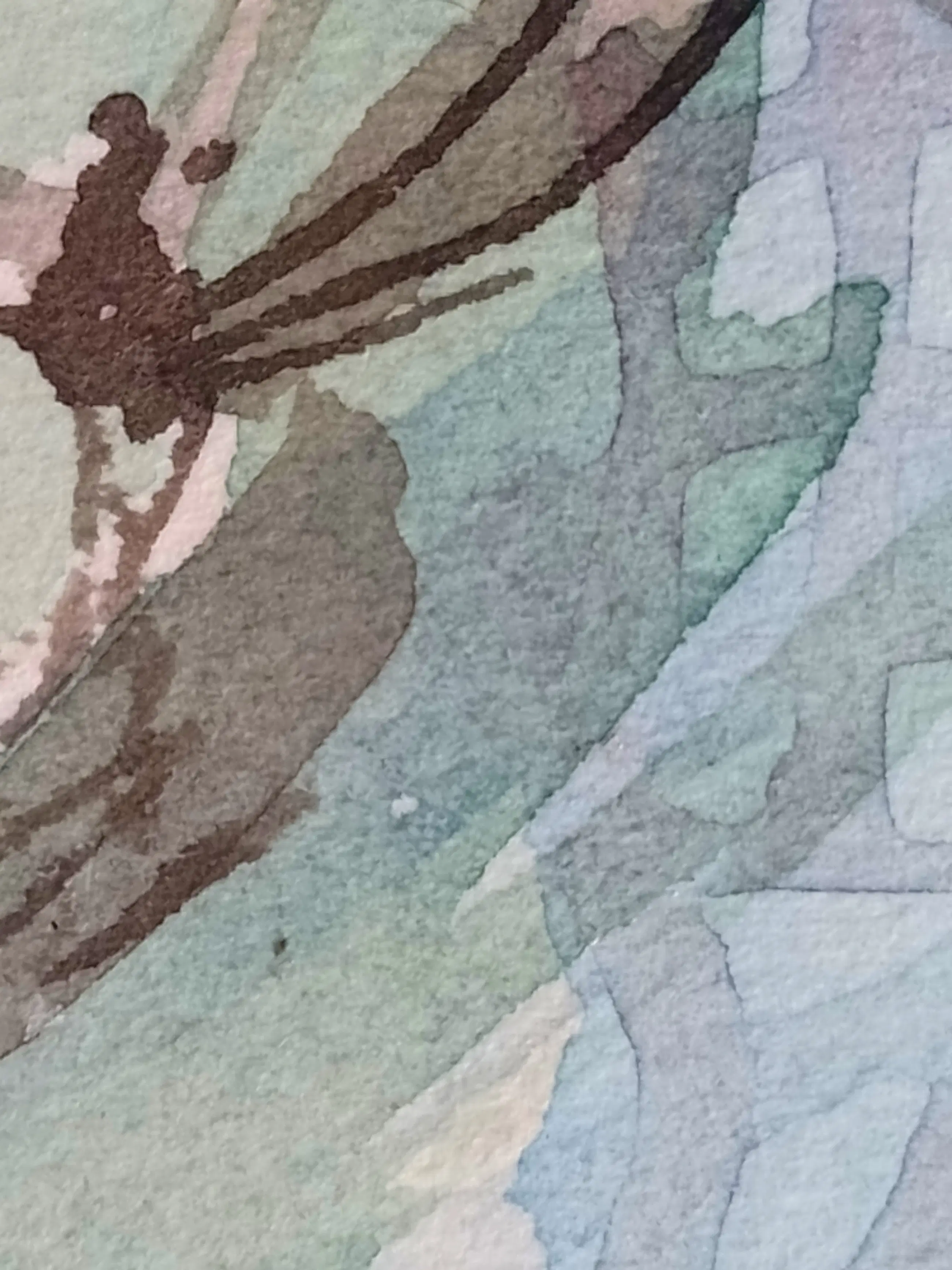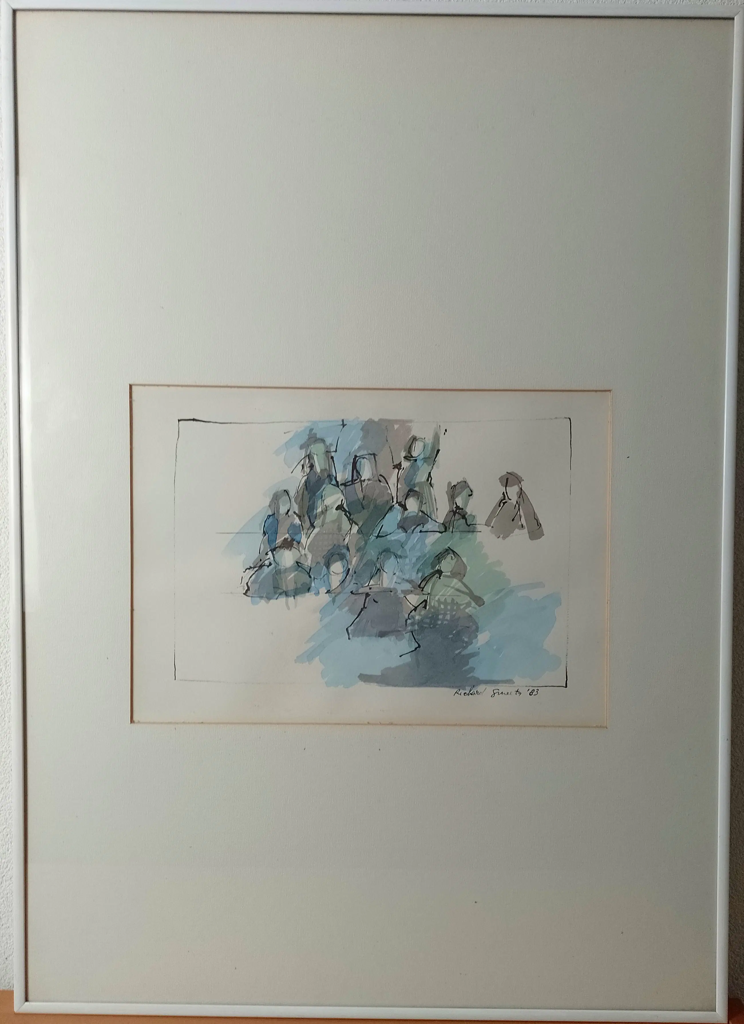 Het werk is gemaakt met inkt en drie kleuren aquarelverf. (lichtblauw, lichtgroen en grijs) Het werk verkeert in een goede staat. Aan de achterzijde ontbreekt een klem