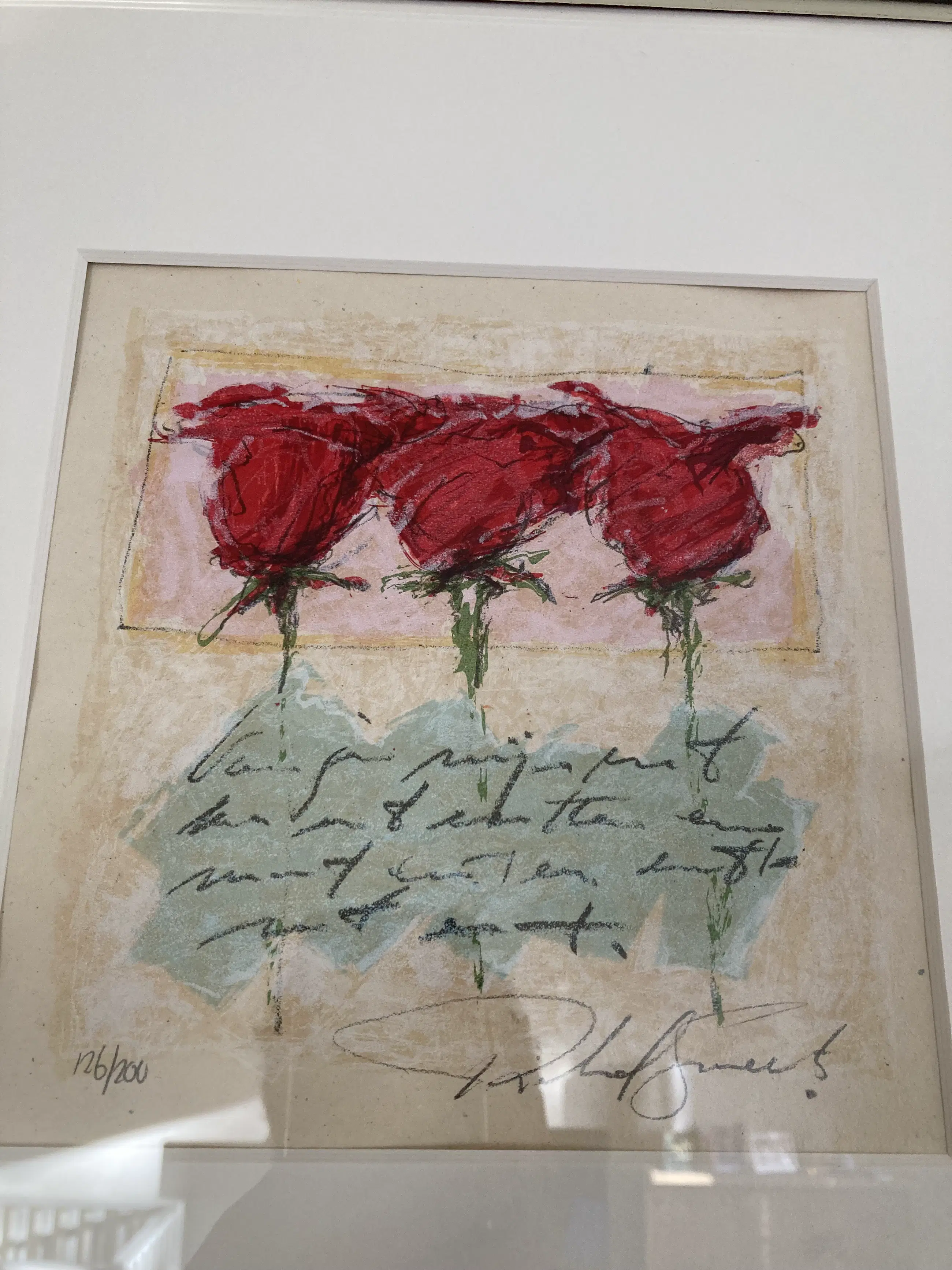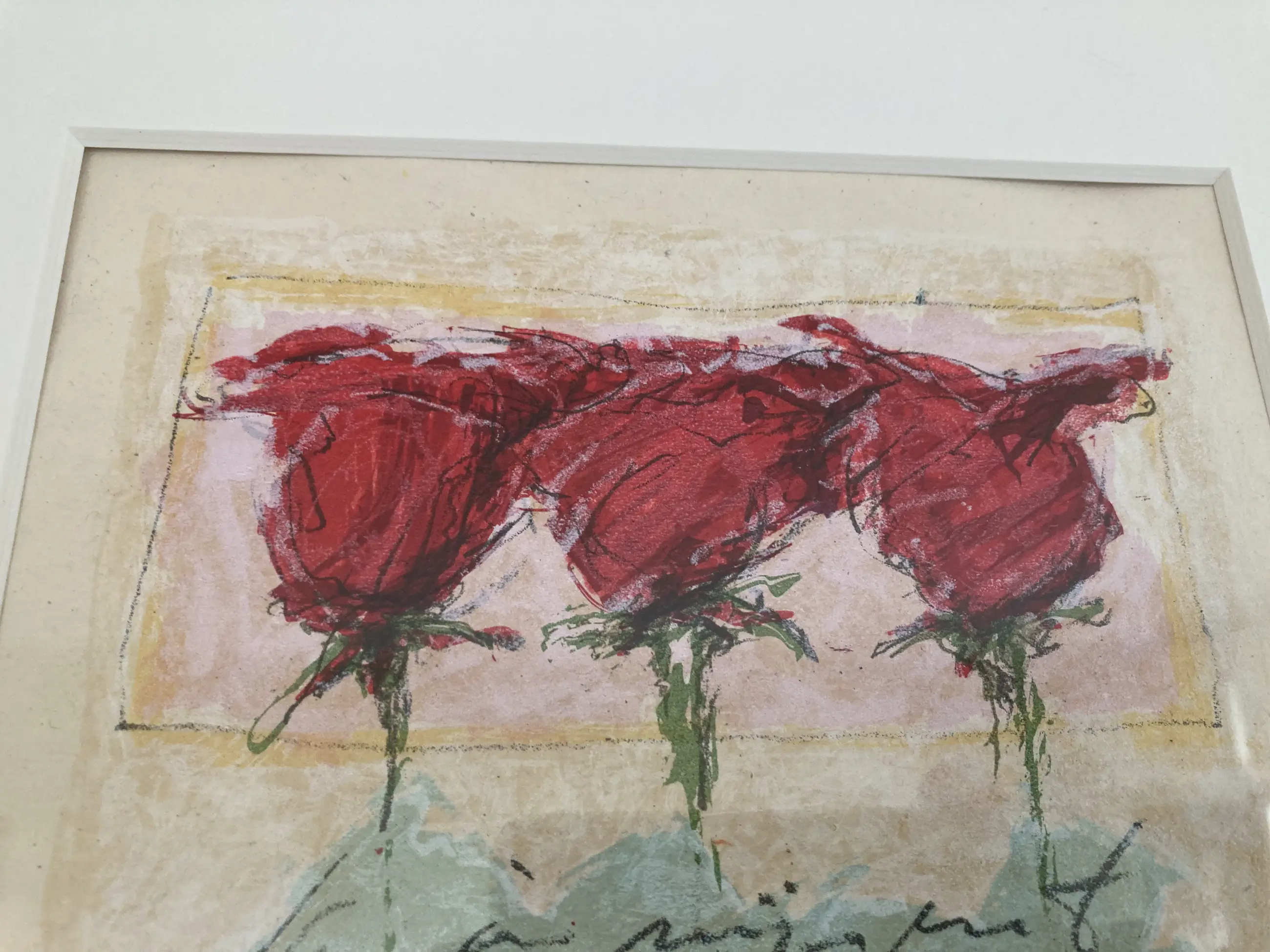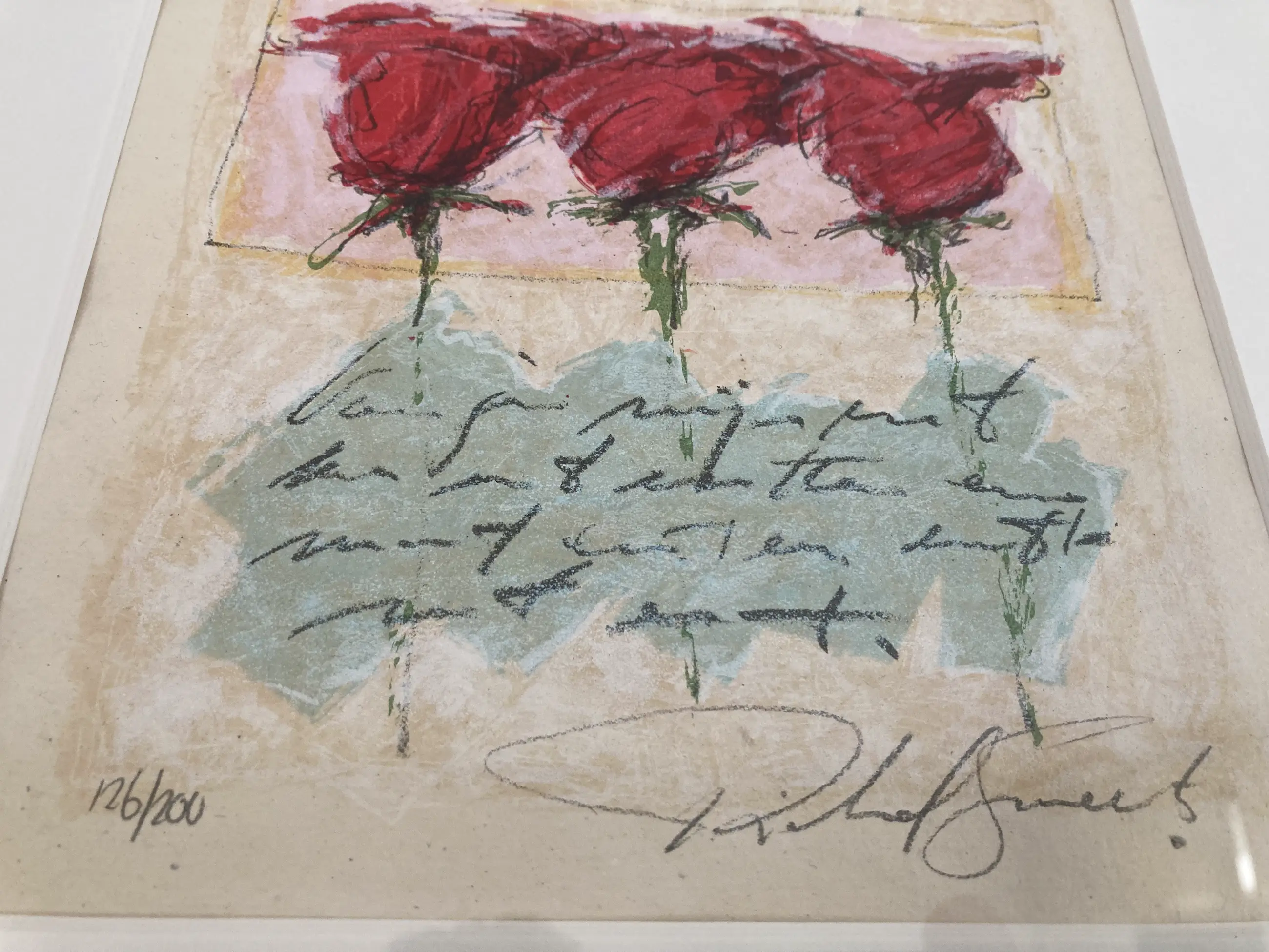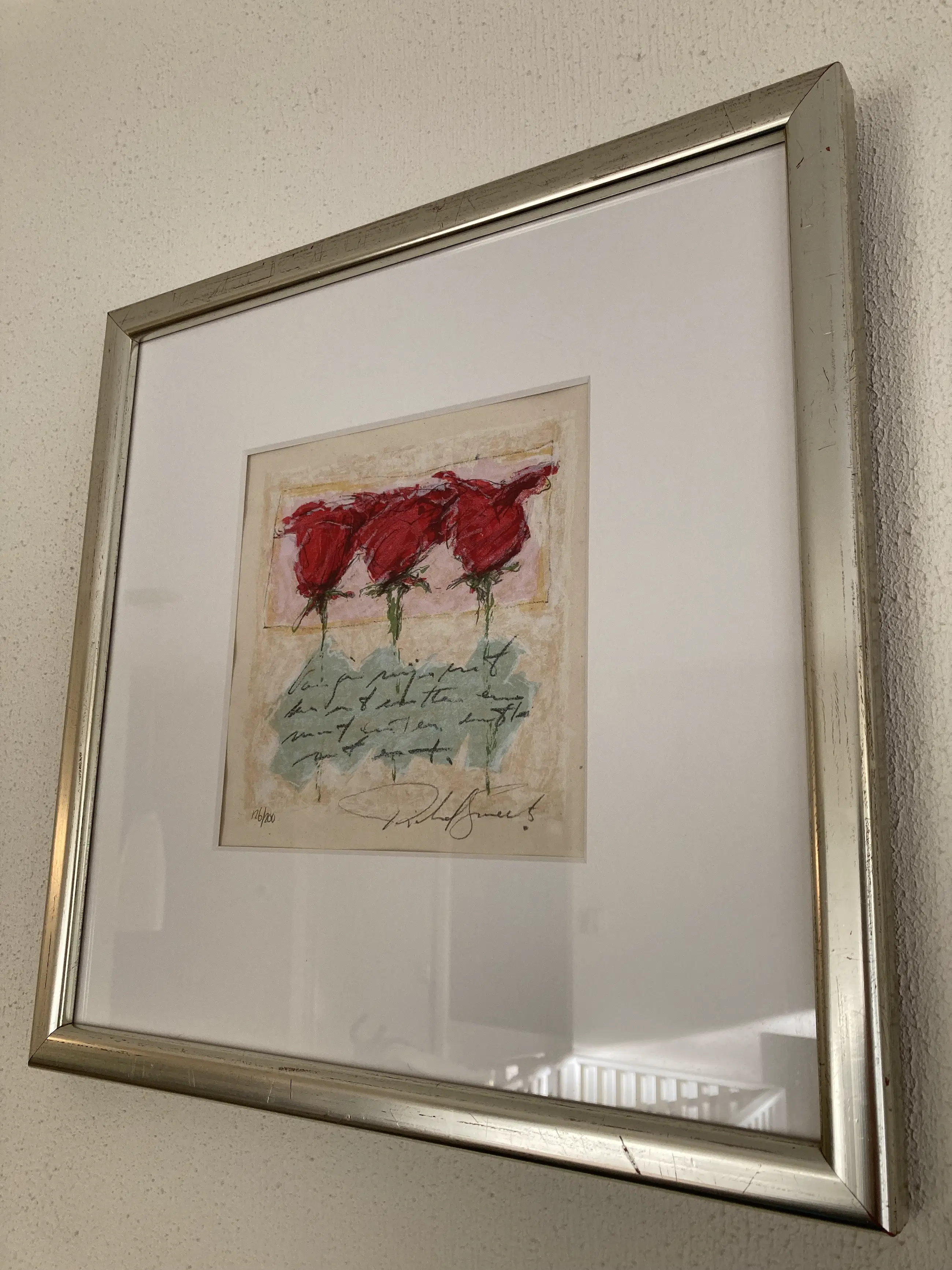 Mooie zeefdruk met in totaal 3 rozen van de serie "Over Rozen" met eronder tekst wat lijkt op een gedicht wat is gemaakt in de periode tussen 1997 en 2002, zeefdruk is ingelijst in een zilverkleurige lijst met passe-partout en kan meteen opgehangen worden.