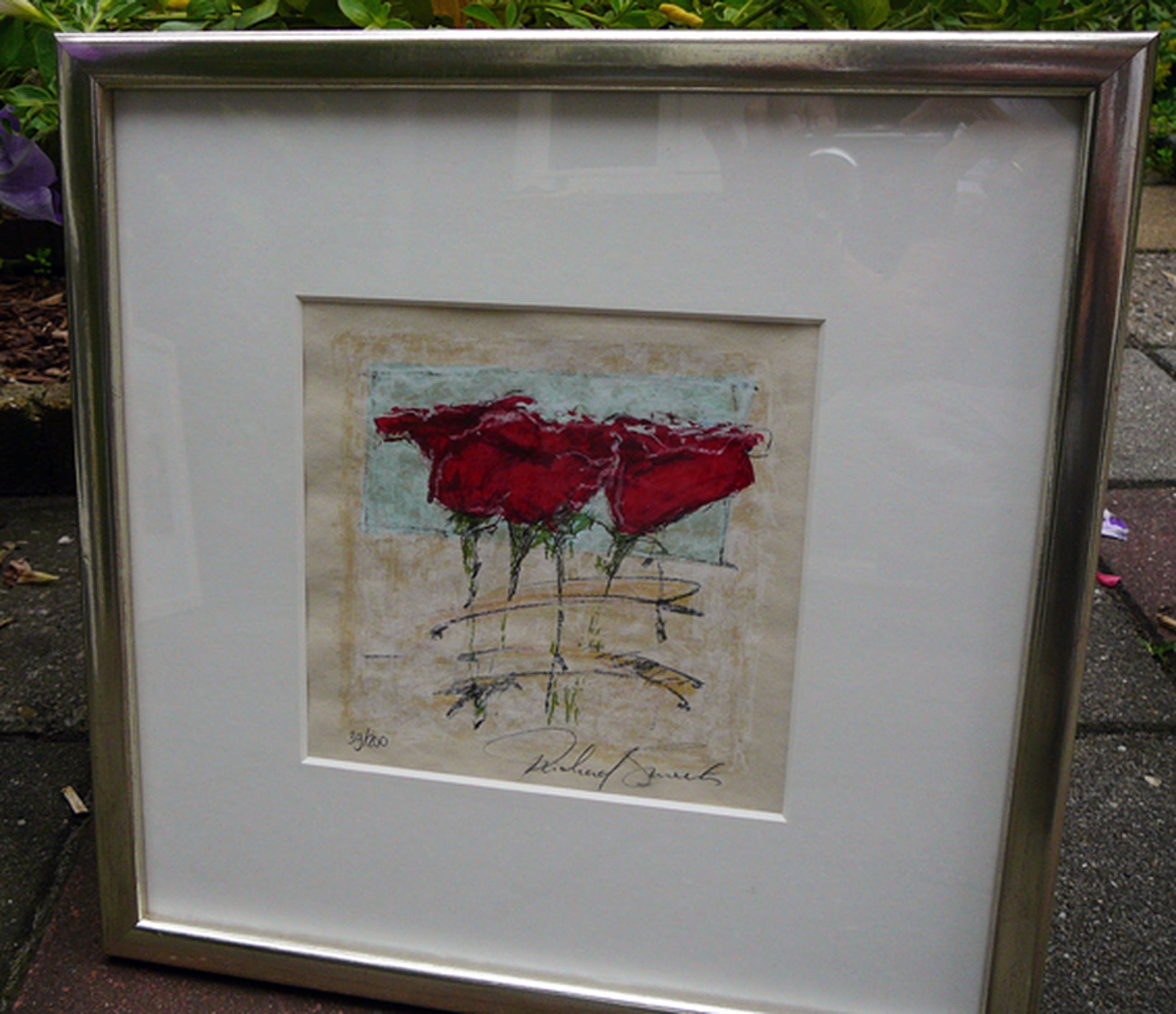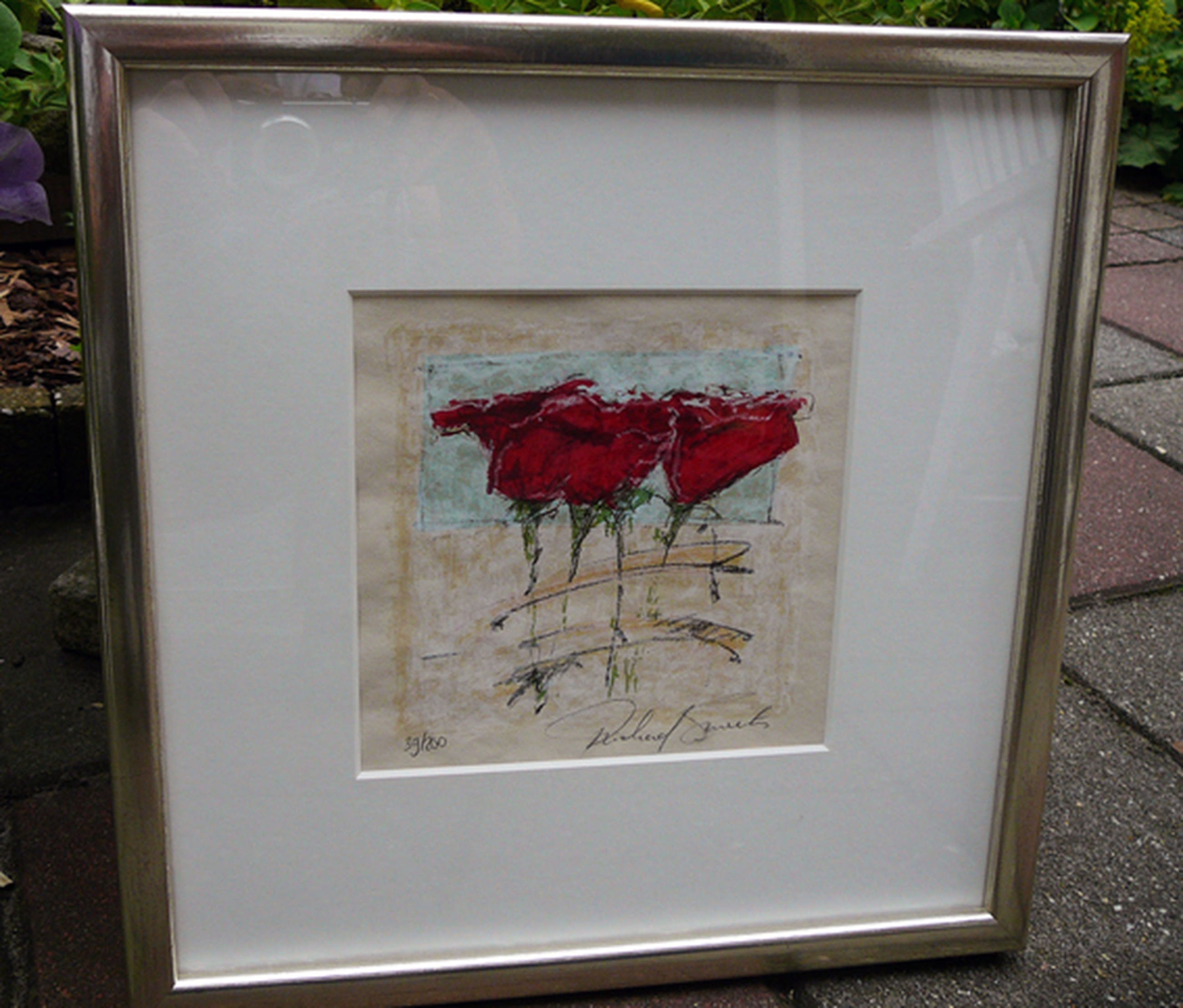 Gelijste en met potlood gesigneerde zeefdruk van Richard Smeets uit de serie 'Over Rozen'. Genummerd 39/200. Conditie: als nieuw. Beeldformaat: 18 x 18 cm. Lijst: 38 x 38 cm. Jaartal: onbekend. Achter glas en passepartout.