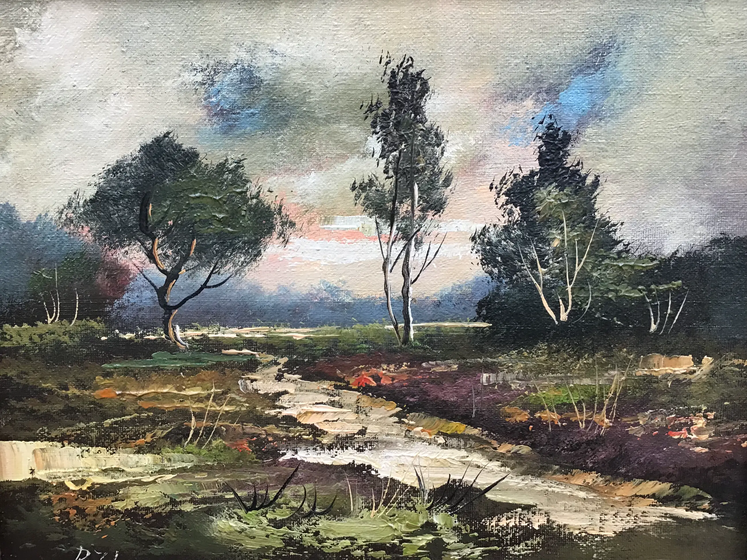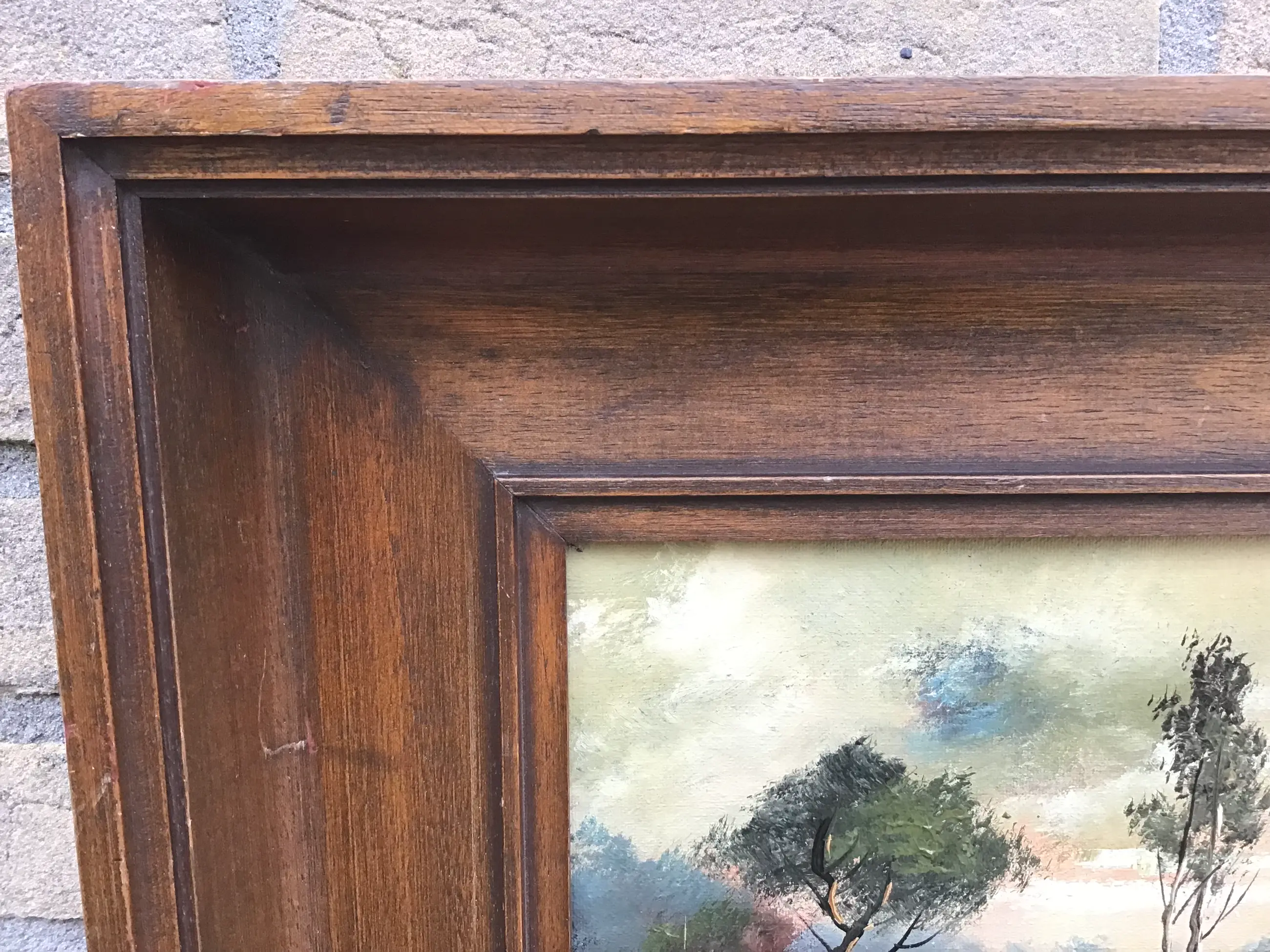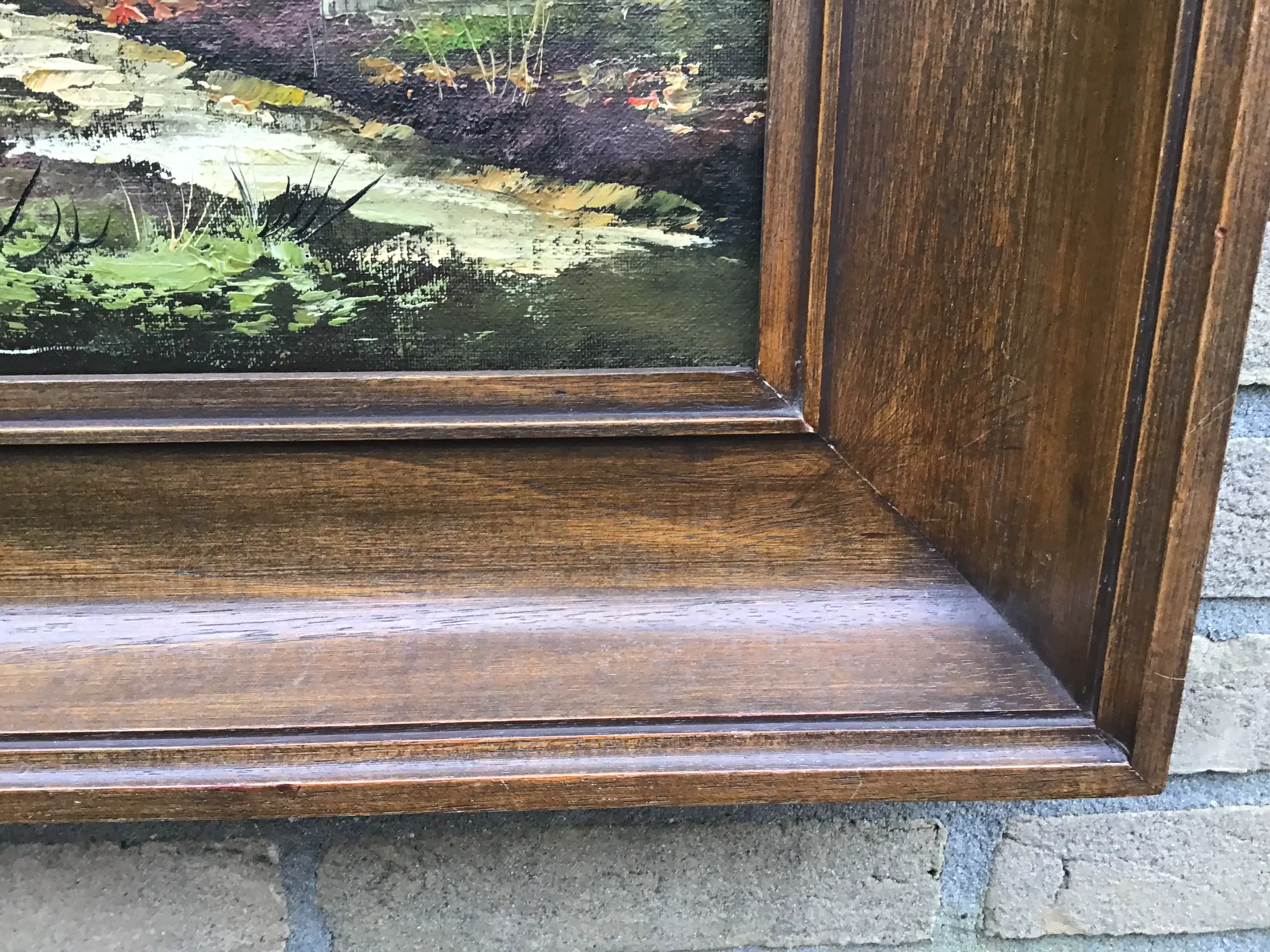 Landschap van Rick Theunissen in een hele brede massief houten lijst. Perfect in orde. Rick Theunissen(1928-nu) is een Belgische schilder. Vooral landschappen met hoeves in kenmerkende stijl. Ik vind deze qua kleurgebruik net wat afwijkend.