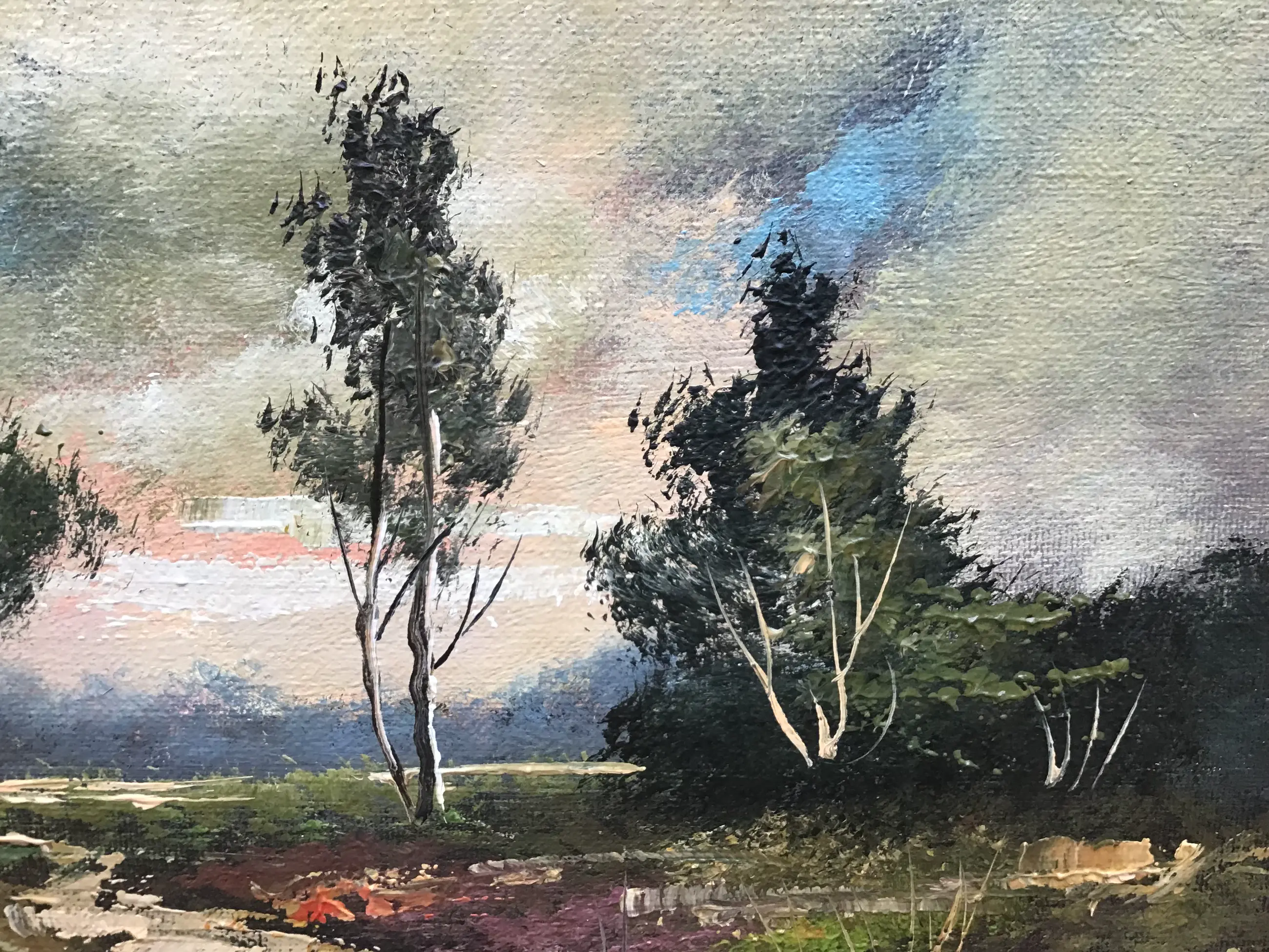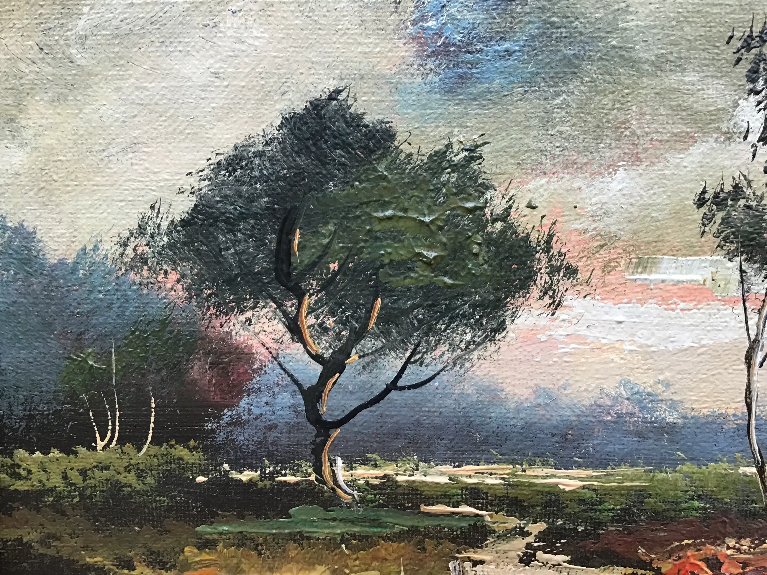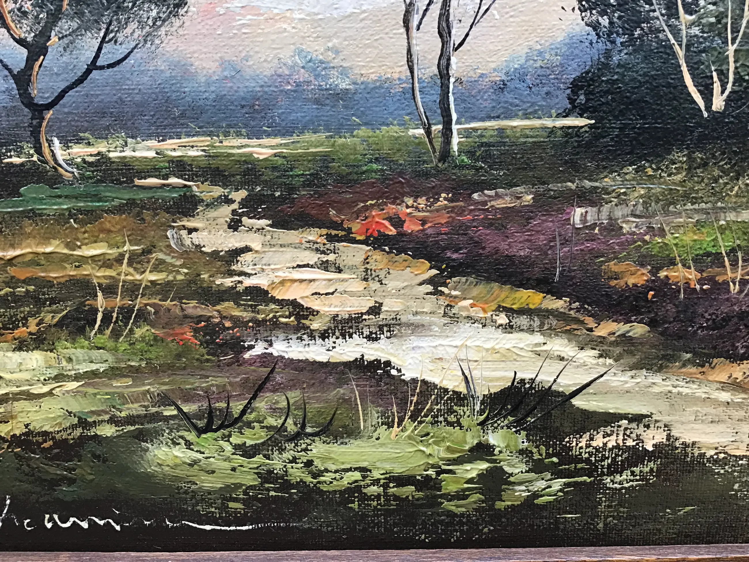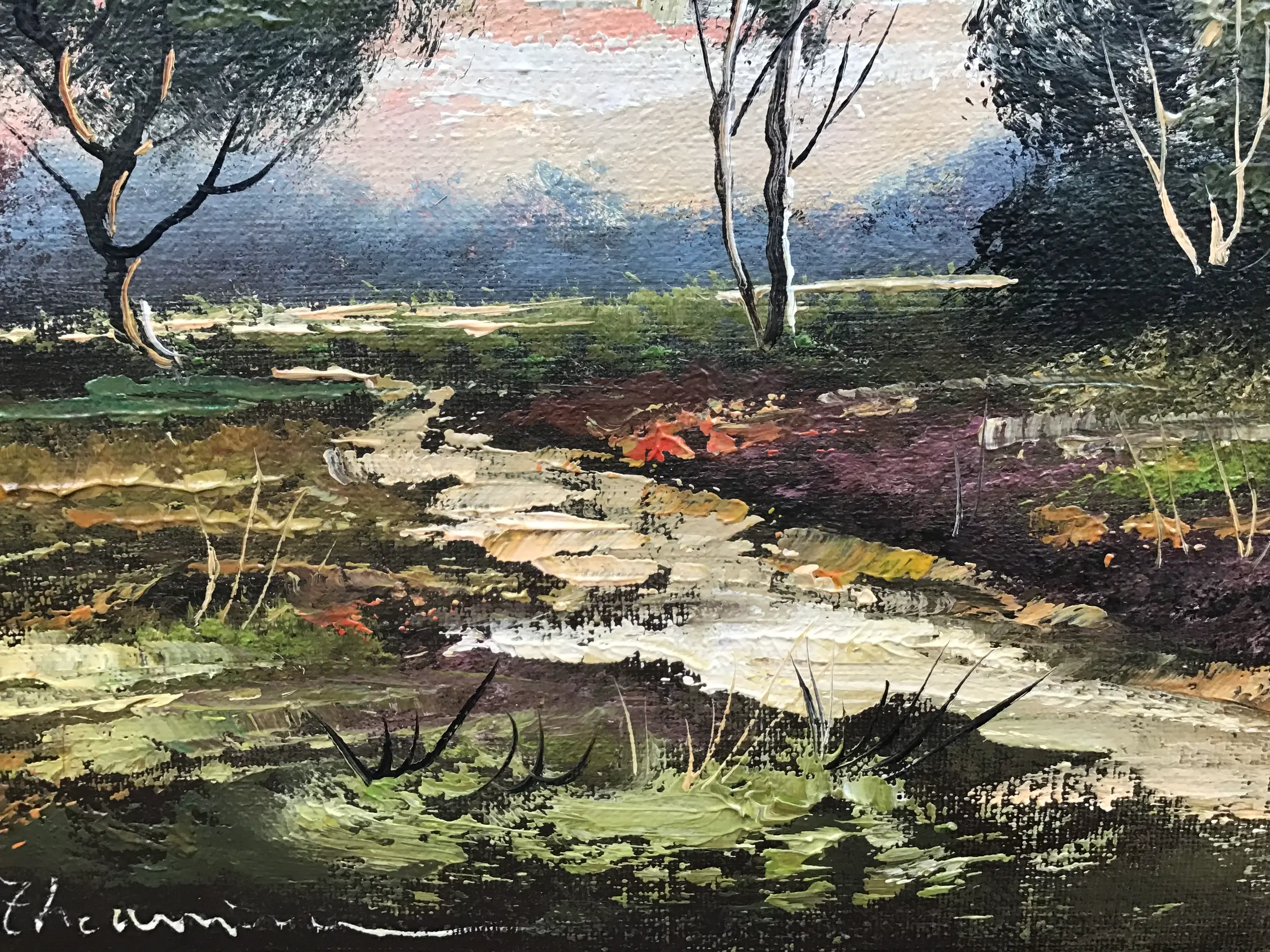 Landschap van Rick Theunissen in een hele brede massief houten lijst. Perfect in orde. Rick Theunissen(1928-nu) is een Belgische schilder. Vooral landschappen met hoeves in kenmerkende stijl. Ik vind deze qua kleurgebruik net wat afwijkend.