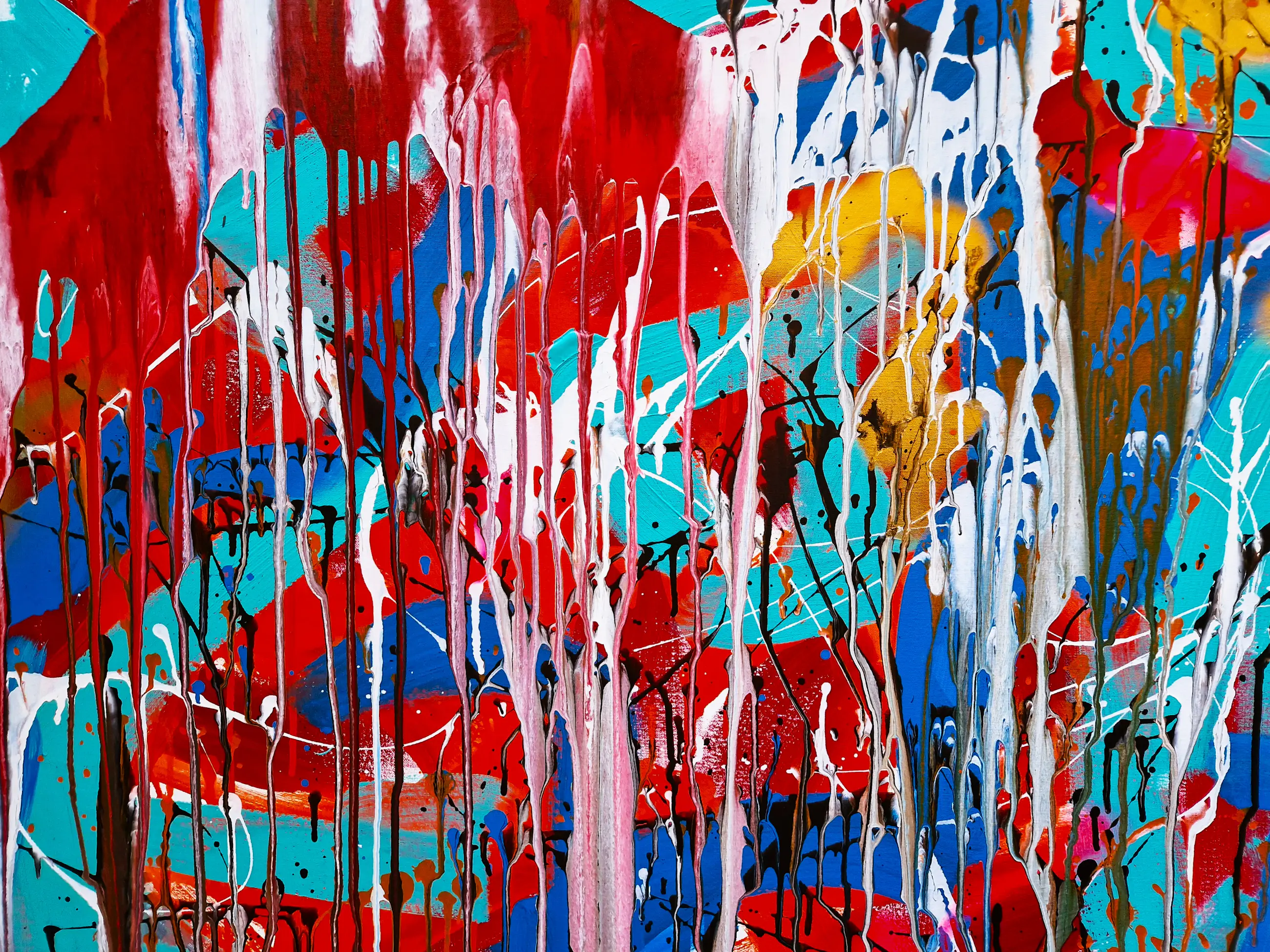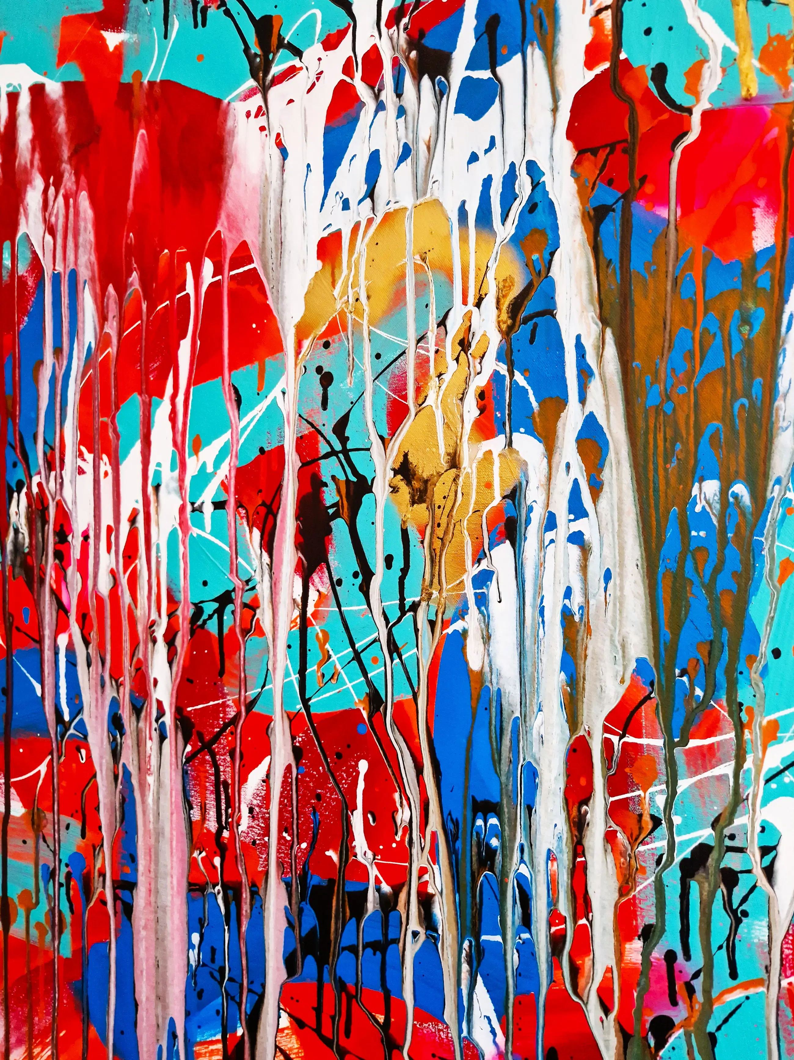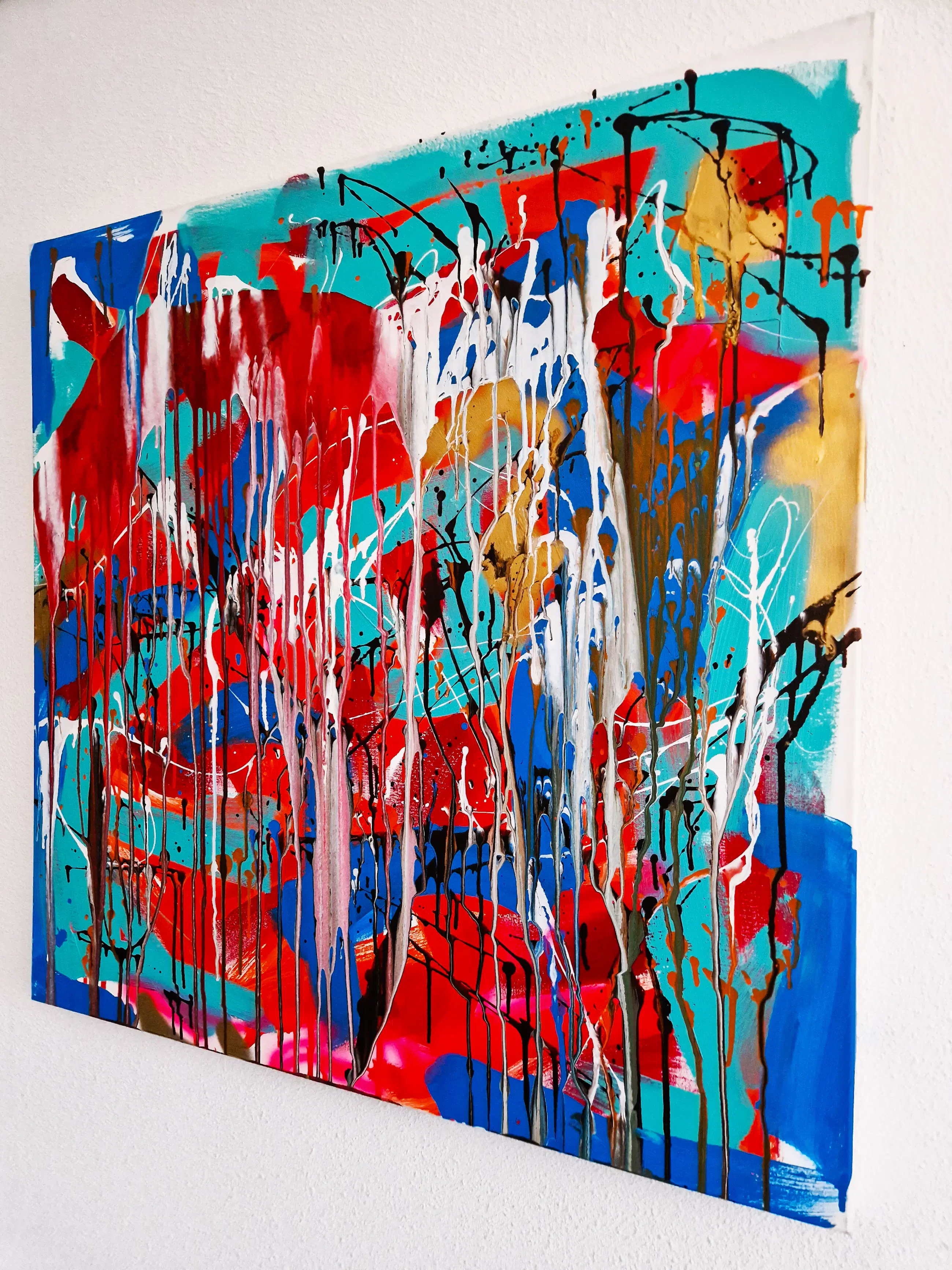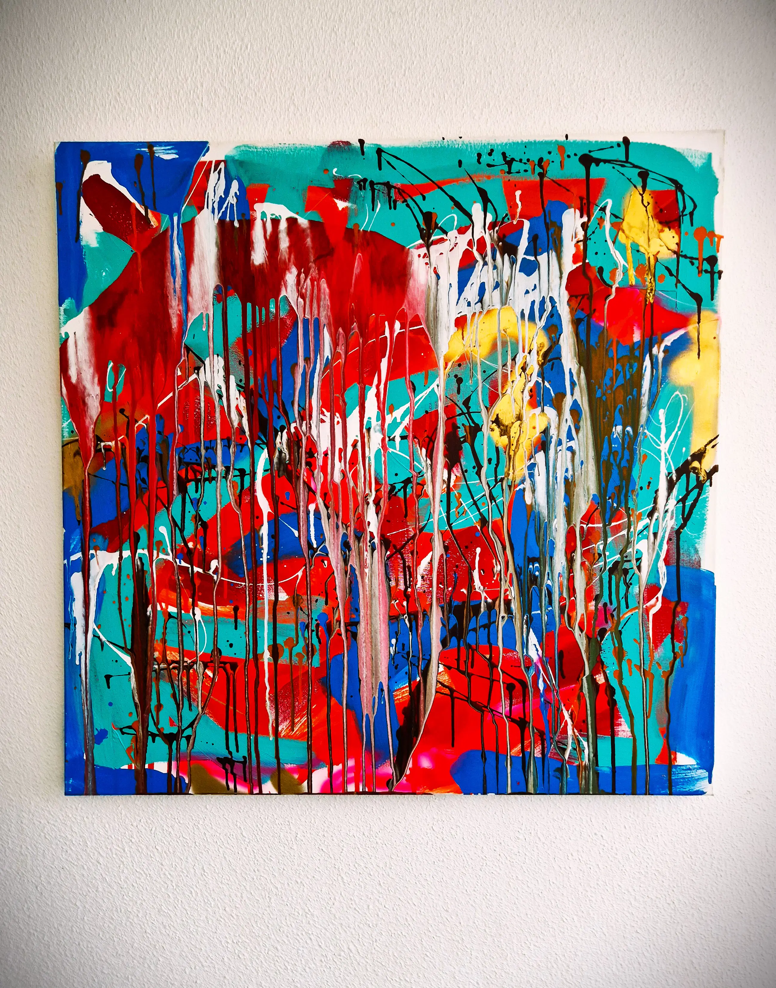 Groot expressionistisch gemengde techniek op doek schilderij in 2015 geschilderd door de Amsterdamse beeldend kunstenaar rick Triest. Afmetingen 120 x 120cm. Het doek verkeert in absolute nieuwstaat. Door de huidige eigenaar bij van Schaik Gallery/Kunstuitleen in 2015 gekocht voor 2100€.