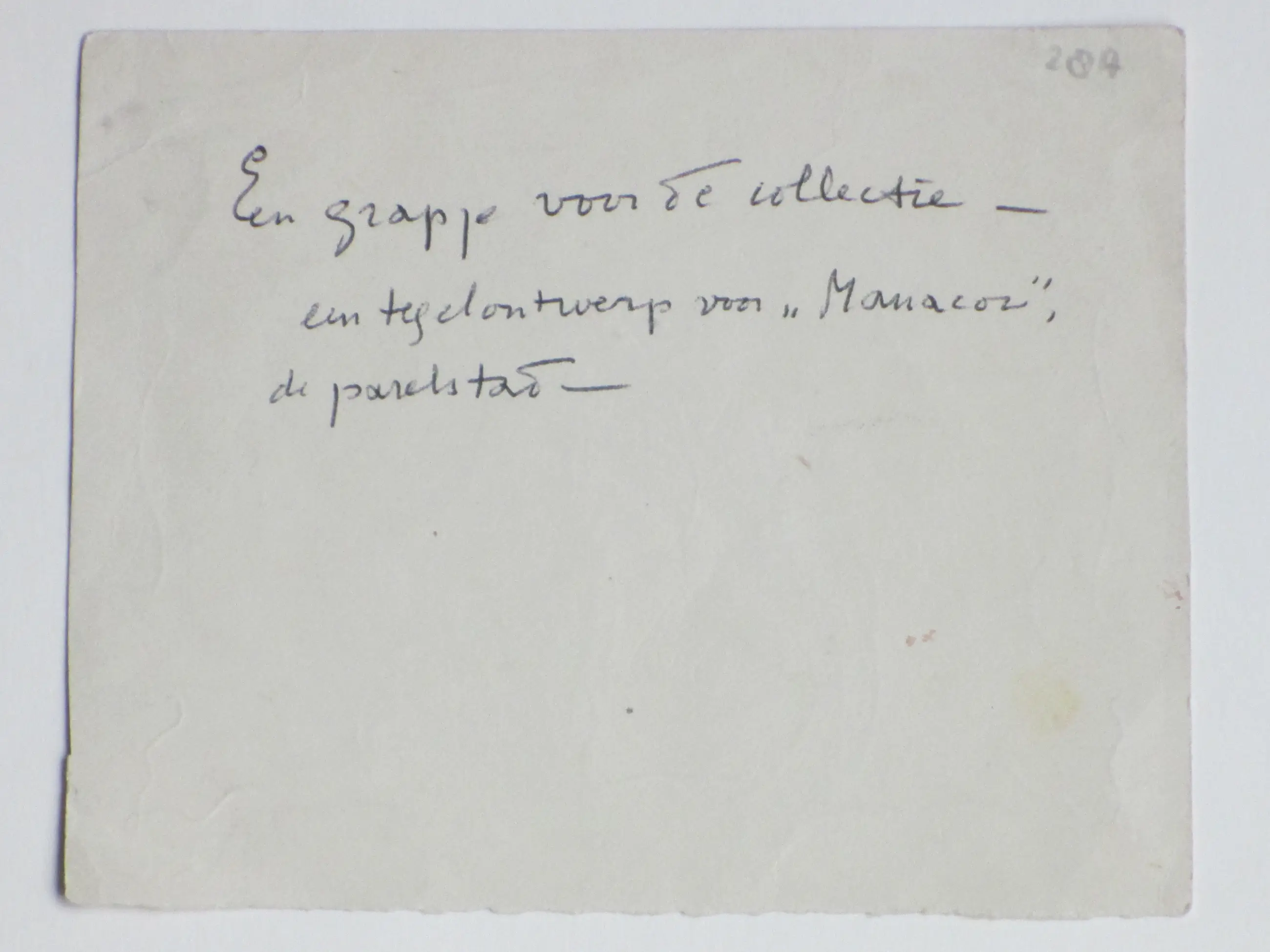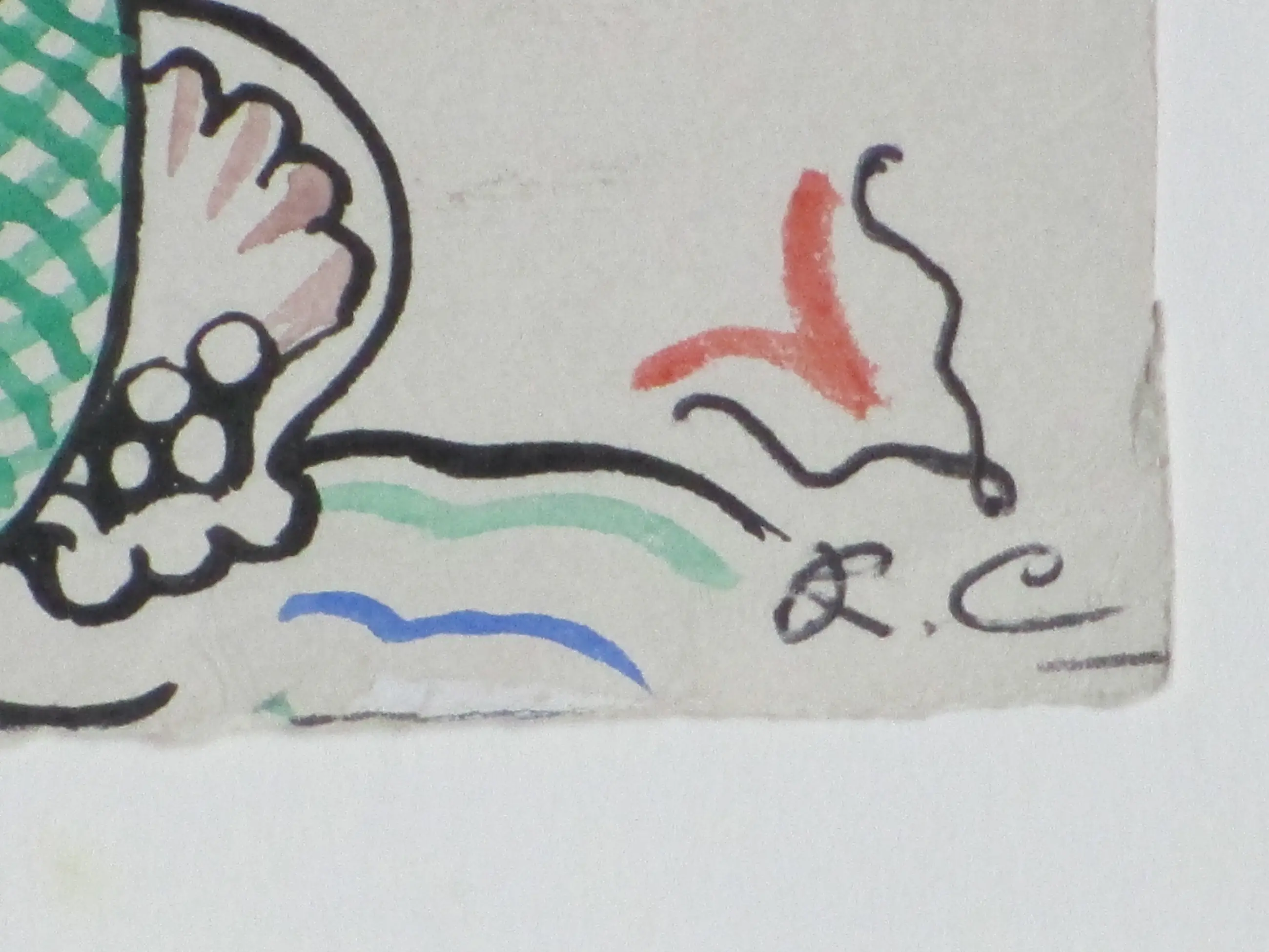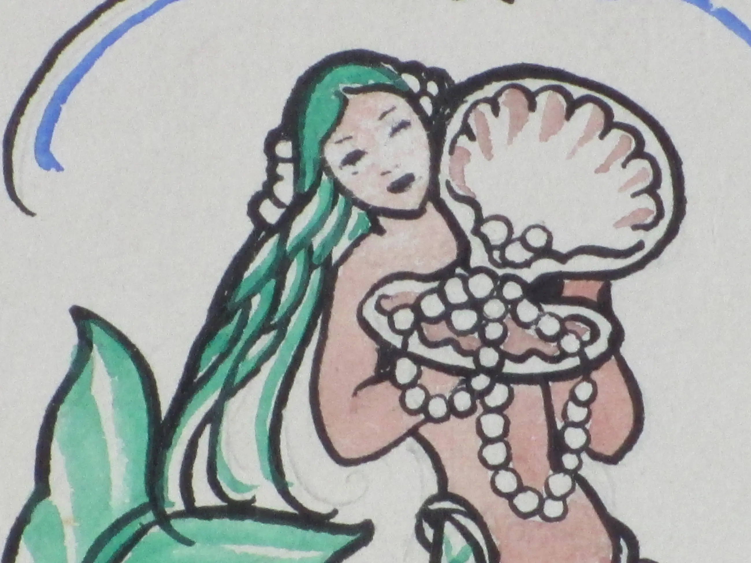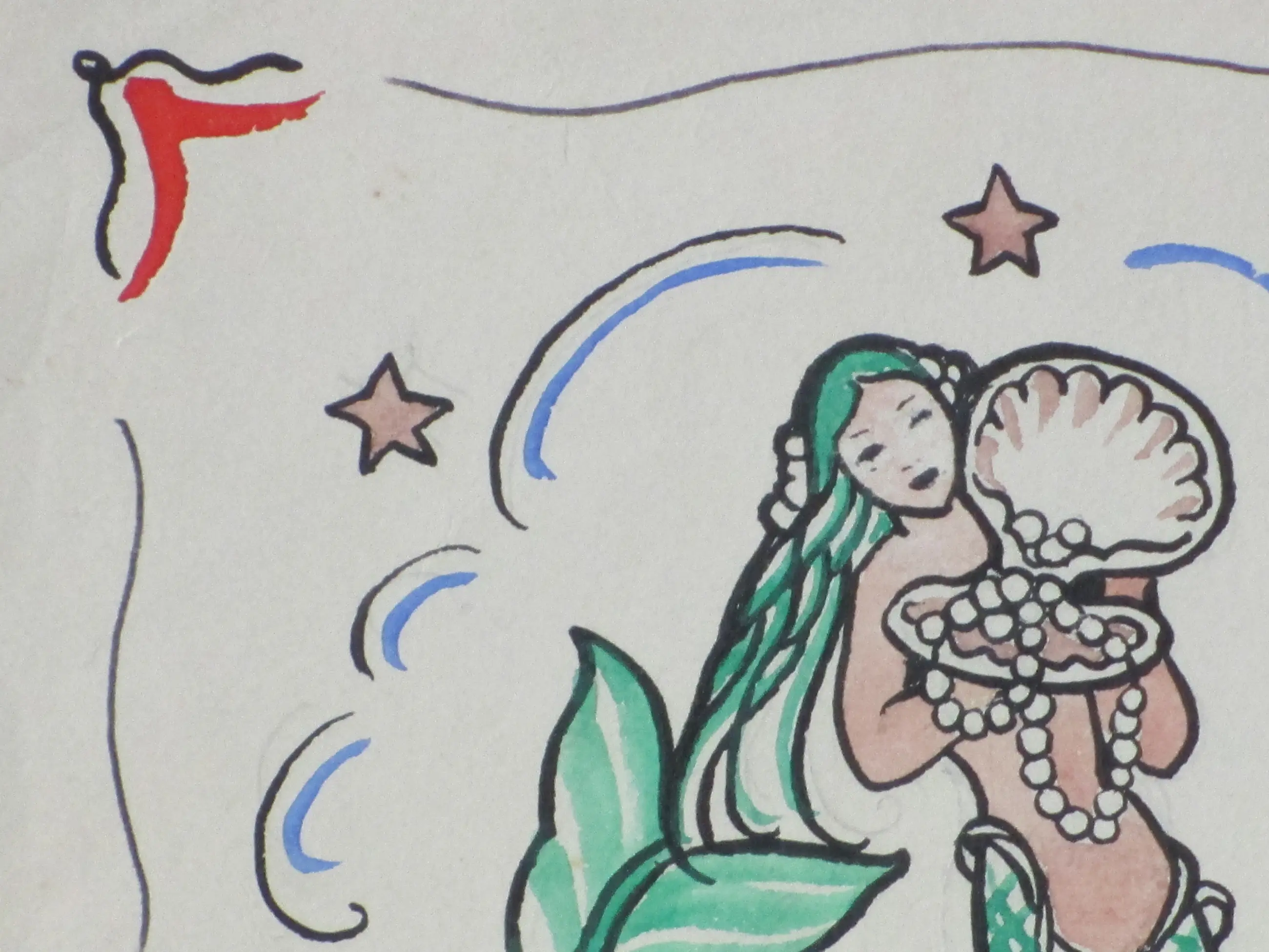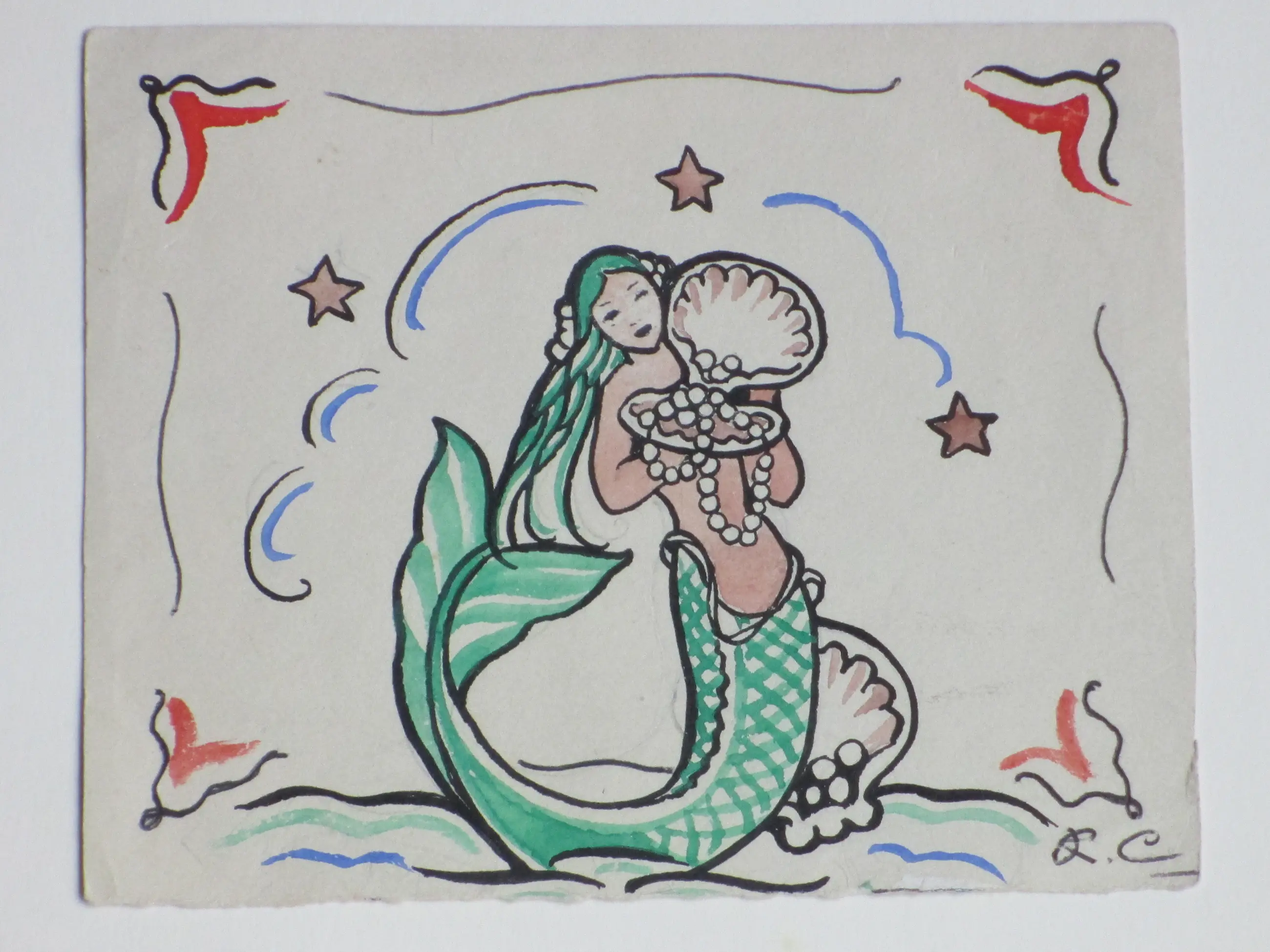 Gemengde techniek door Rie Cramer Voorstelling van een zeemeermin met een geopende oester met daarin een parelketting Losbladig, beeldmaat 11x14 Gemonogrammeerd in pen r.o.: 'R.C.' Annotatie op achetrzijde: 'een tegelontwerp voor "Manacor" de parelstad Manacor is de tweede stad van het eiland Mallorca, beter bekend als de Parelstad