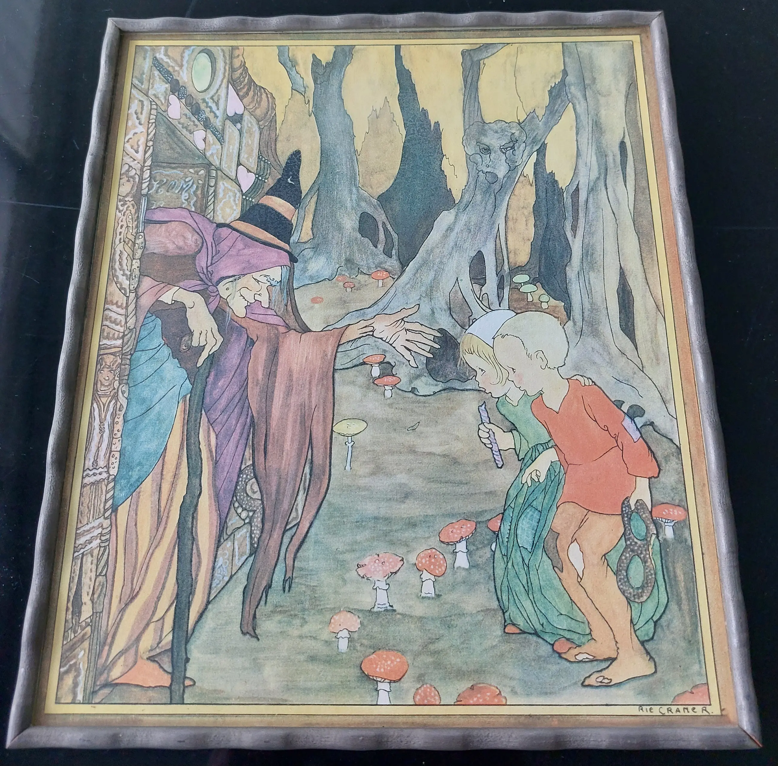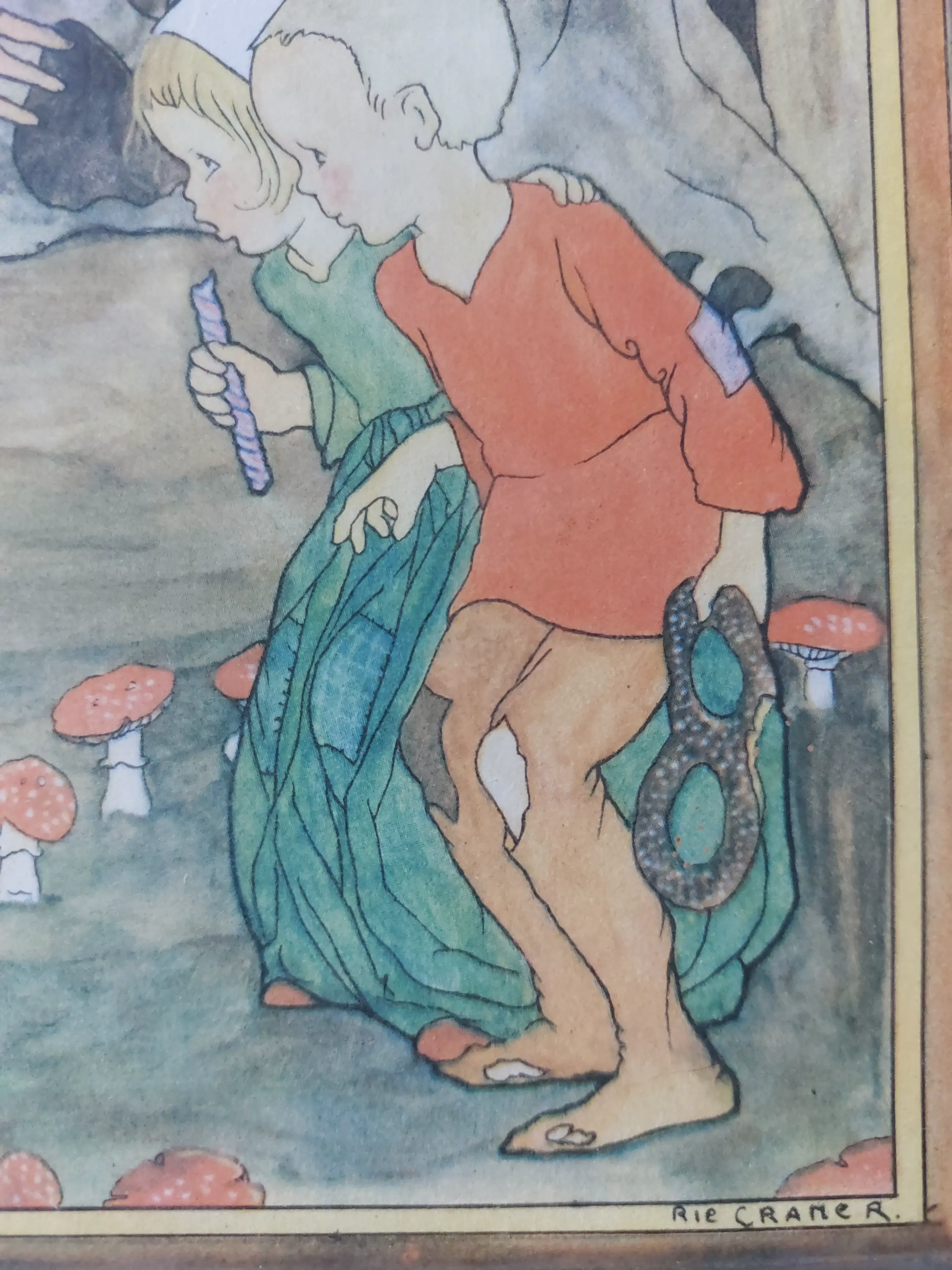Lithografische prent van Rie Cramer in het originele antieke lijstje van lijstenmakerij De Vij Mestdagh. Betreft een illustratie van een sprookje, namelijk Hans en Grietje. Rie Cramer staat bekend als een van de beste illustratoren van kinderboeken uit de eerste helft van de 20e eeuw.