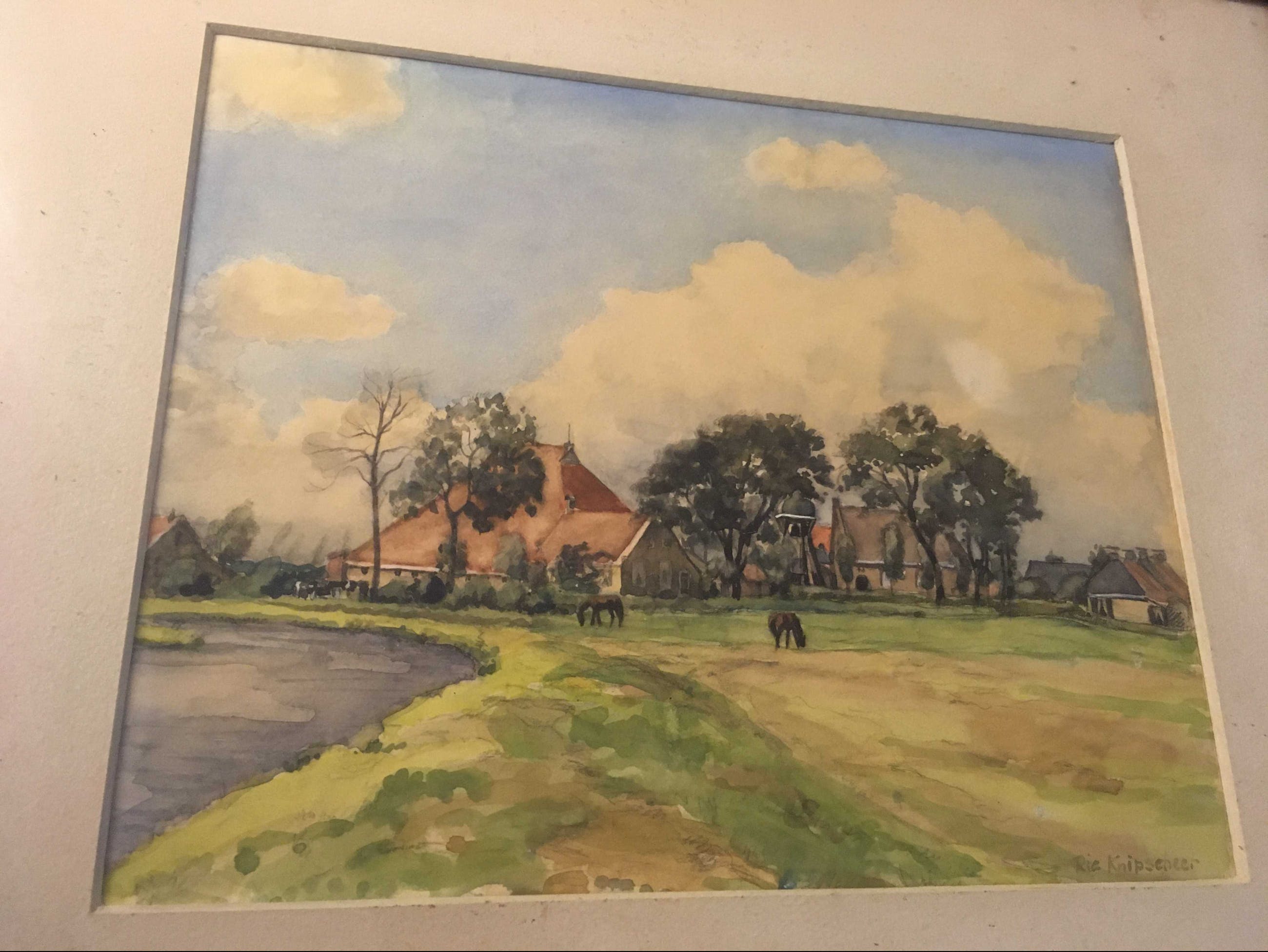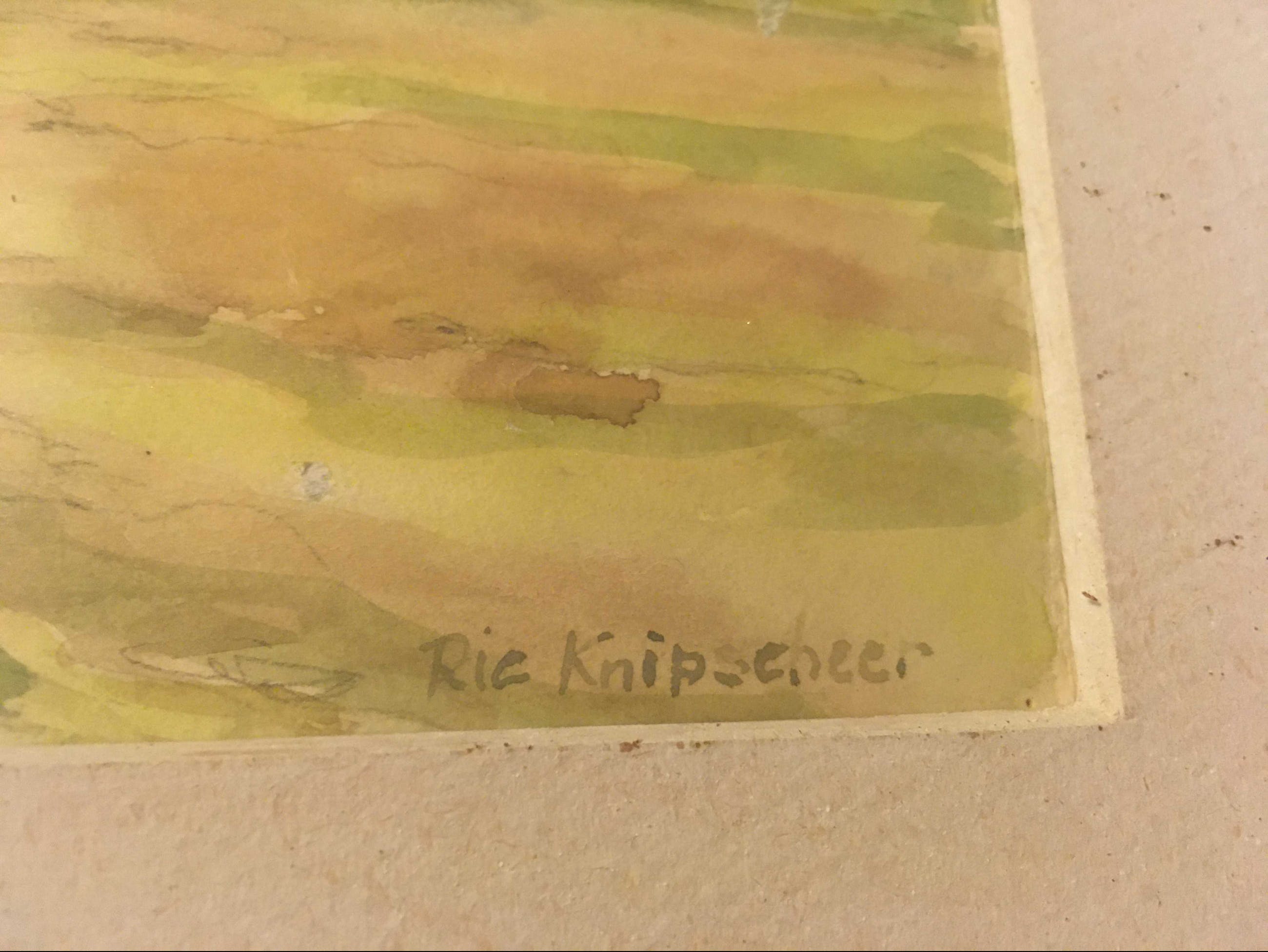 Aquarel van Rie Knipscheer, beeldmaat 23 x 28 cm, gesigneerd Rie Knipscheer r.o., verso tekst Klokkenstoel in Goingarijp Friesland/3 Nov.1946, in glaslijst met passe-partout.