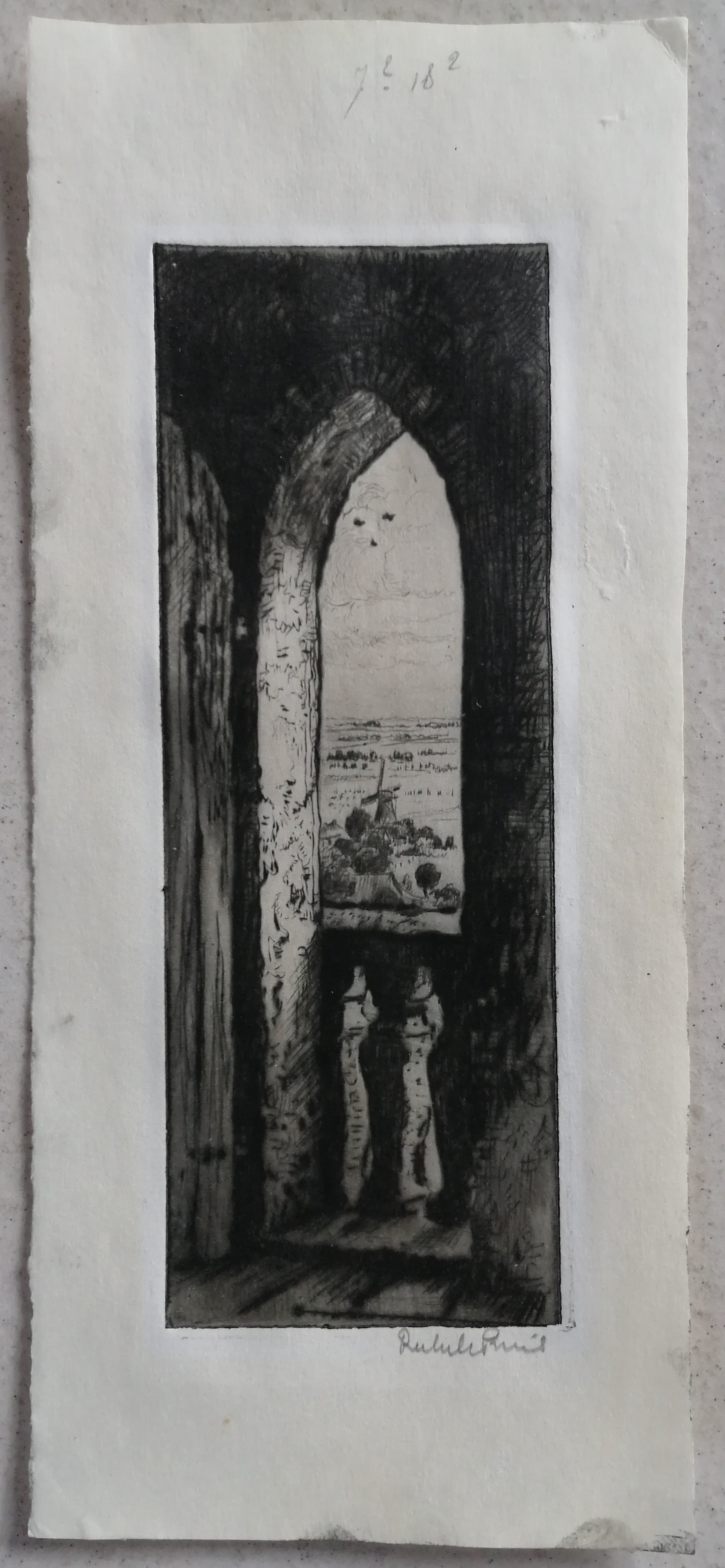 Potlood gesigneerd rechtsonder. Losbladig. Beeldmaat 17x6 cm. Bladmaat 23,5x10 cm. Riekele Prins werd geboren te Kollumerzwaag op 25 april 1905 en overleed te Groningen op 14 mei 1954. Was aanvankelijk machinist. Leerling van Jan Derksen Staats. Later leraar van Douwe van der Meulen. Wordt genoemd "de etser van het Groninger landschap". Lid van "De Grafische". Graficus, schilder en tekenaar.