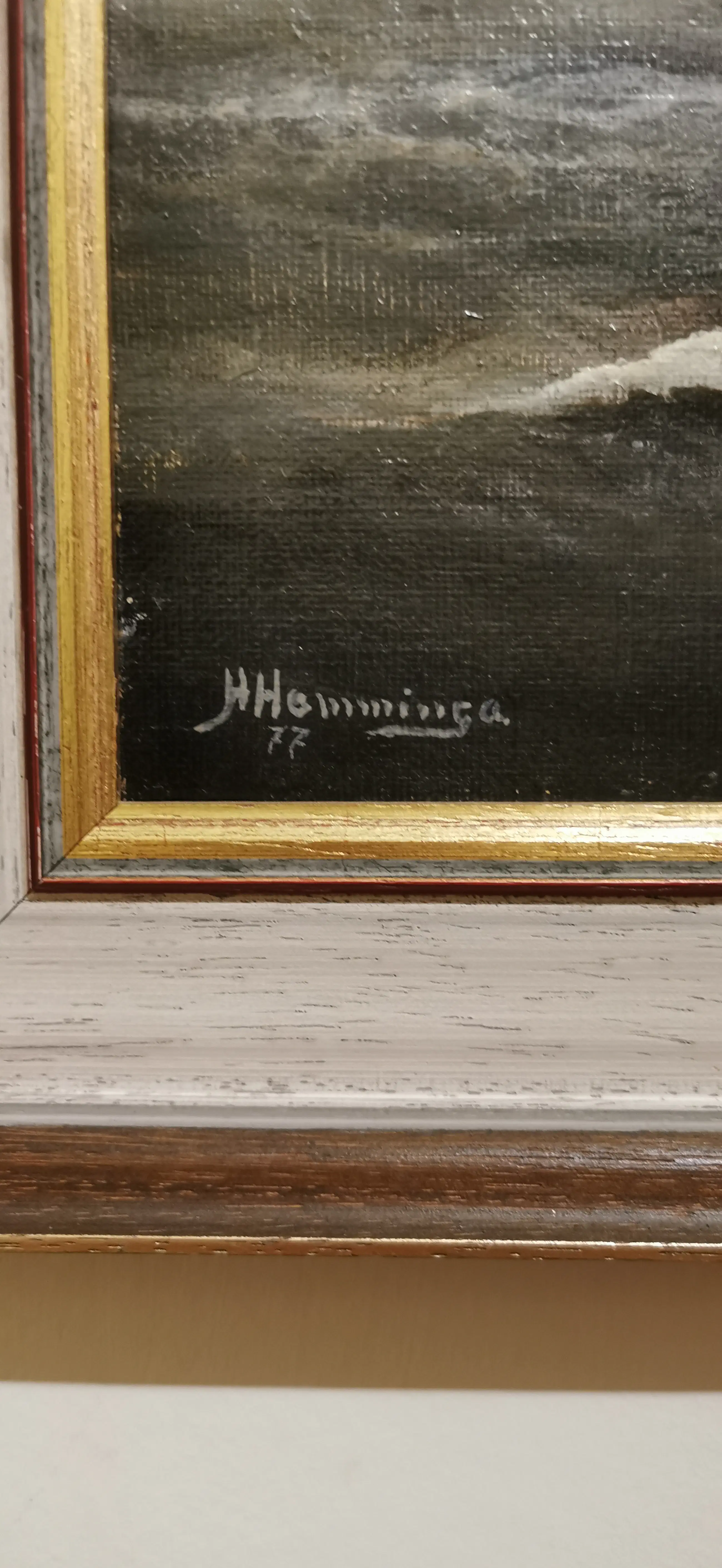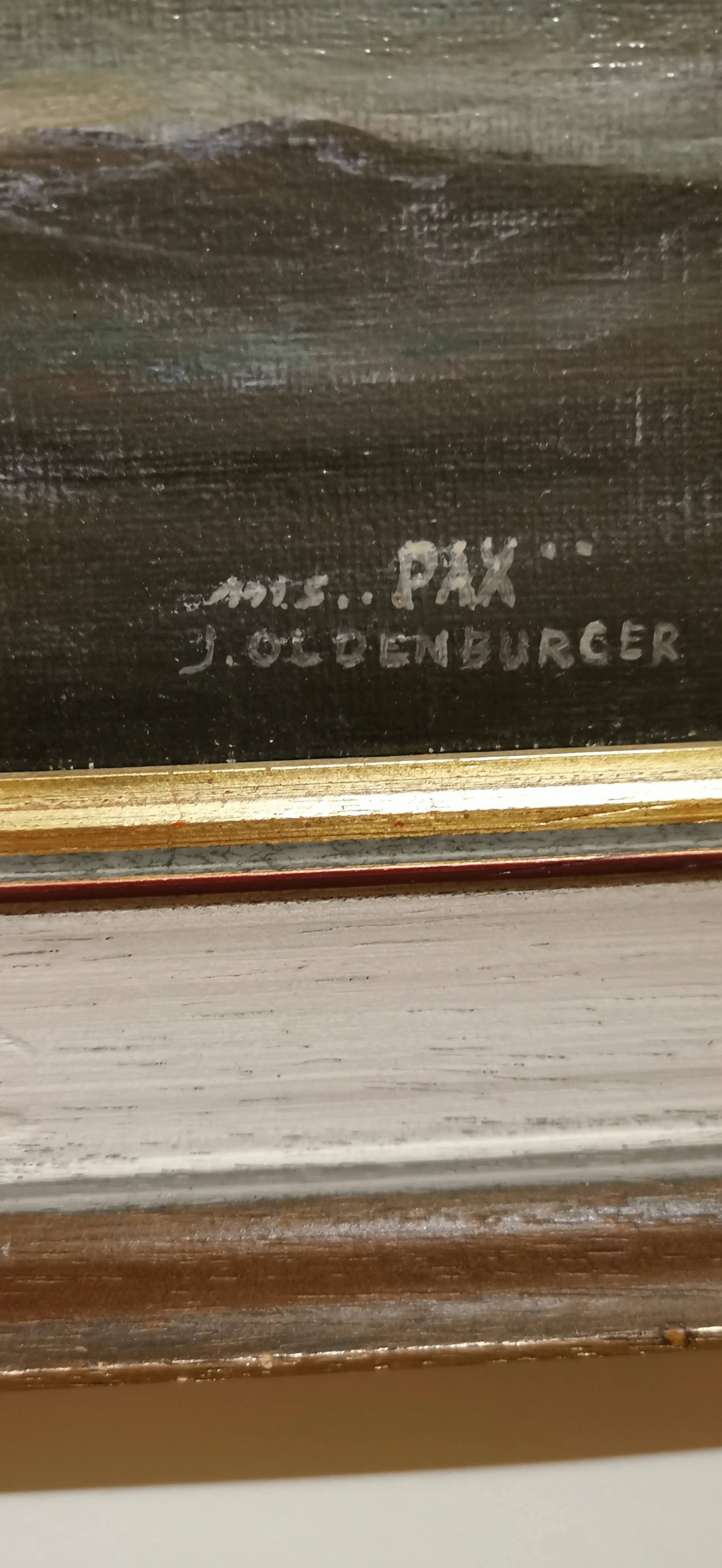 In opdracht van mijn ouders in 1977 door Rieks Hamminga geschilderd. Hun schip, het motorschip PAX is op volle zee afgebeeld.