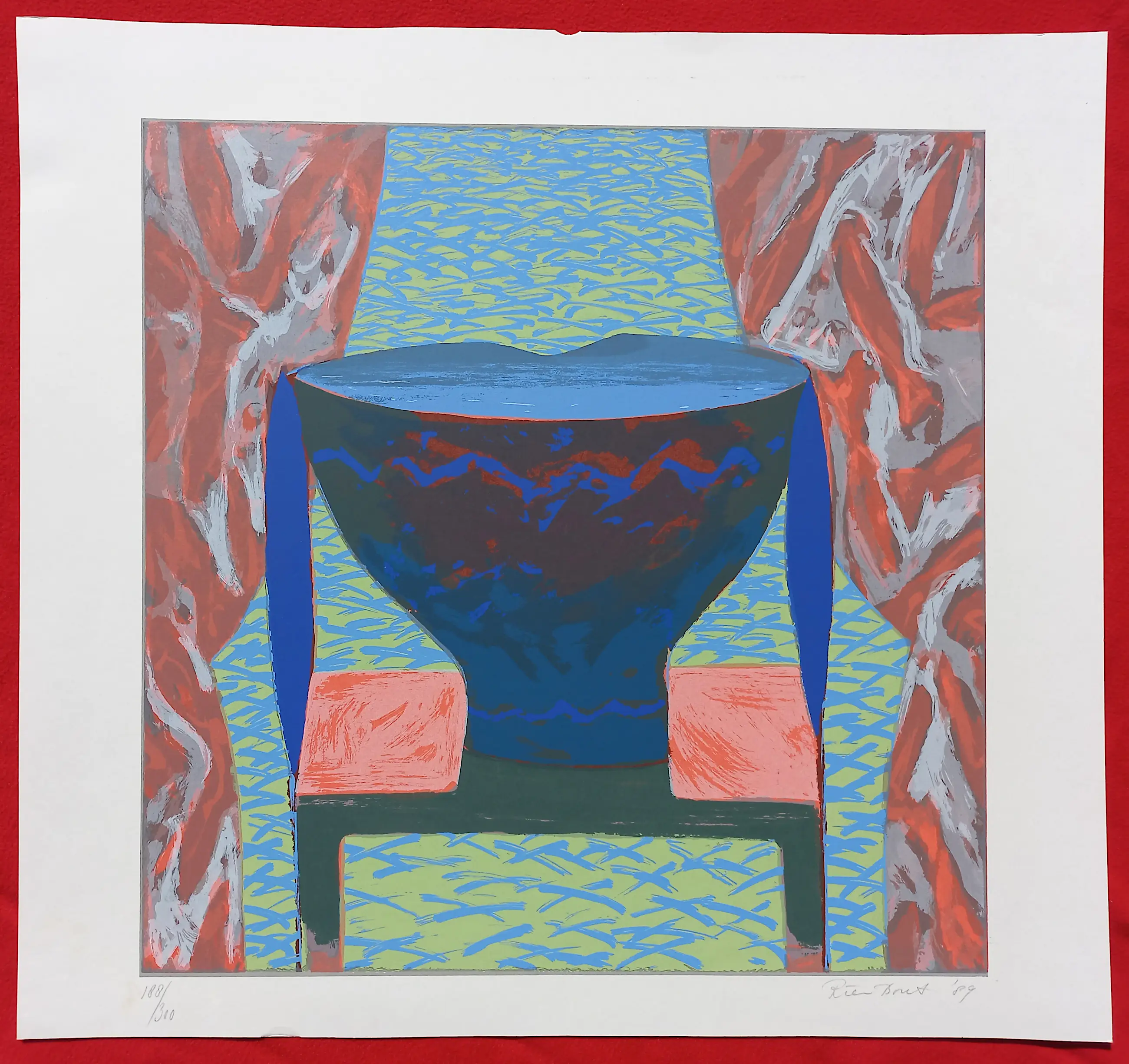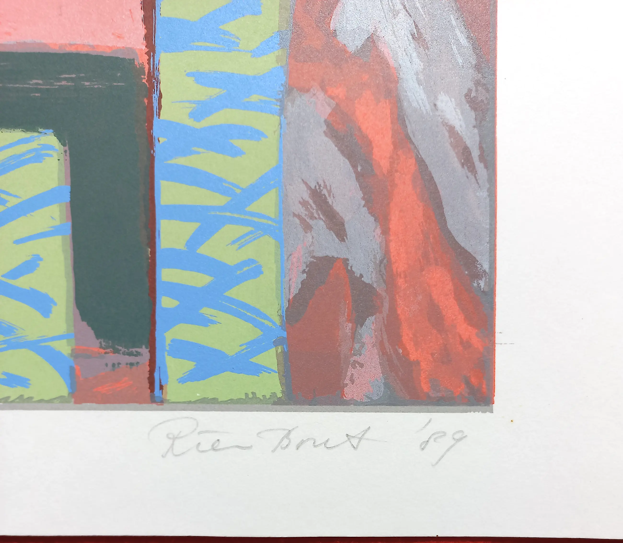 Kleurrijke compositie van Rien Bout. Zeefdruk op papier, met potlood gesigneerd, gedateerd (‘89) en genummerd (188/300). In goede conditie.