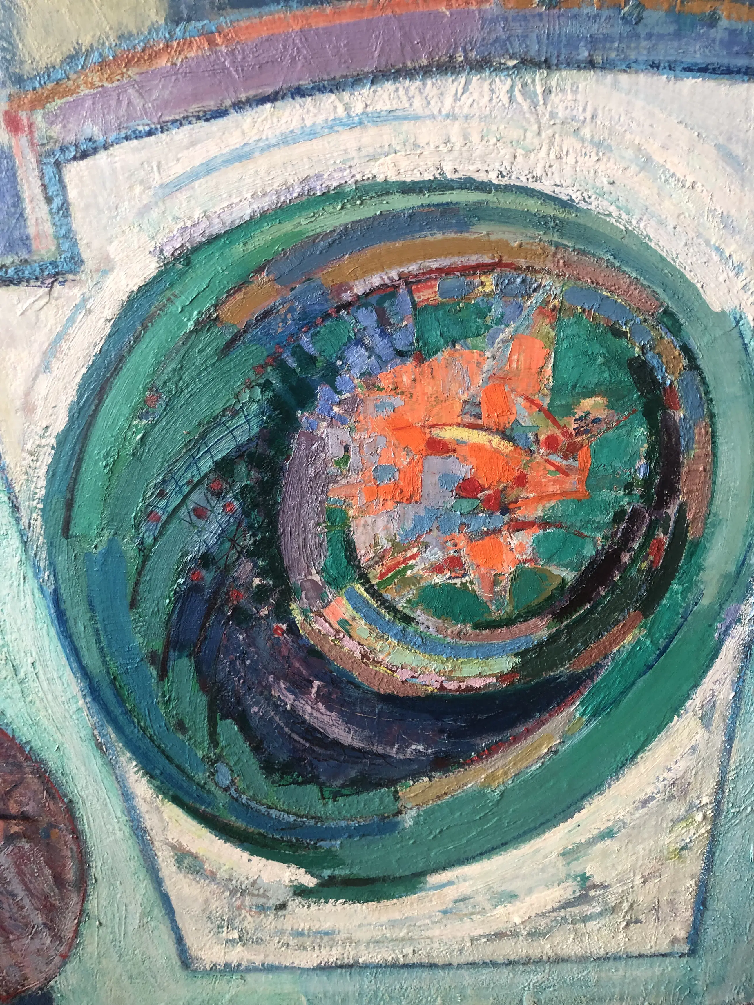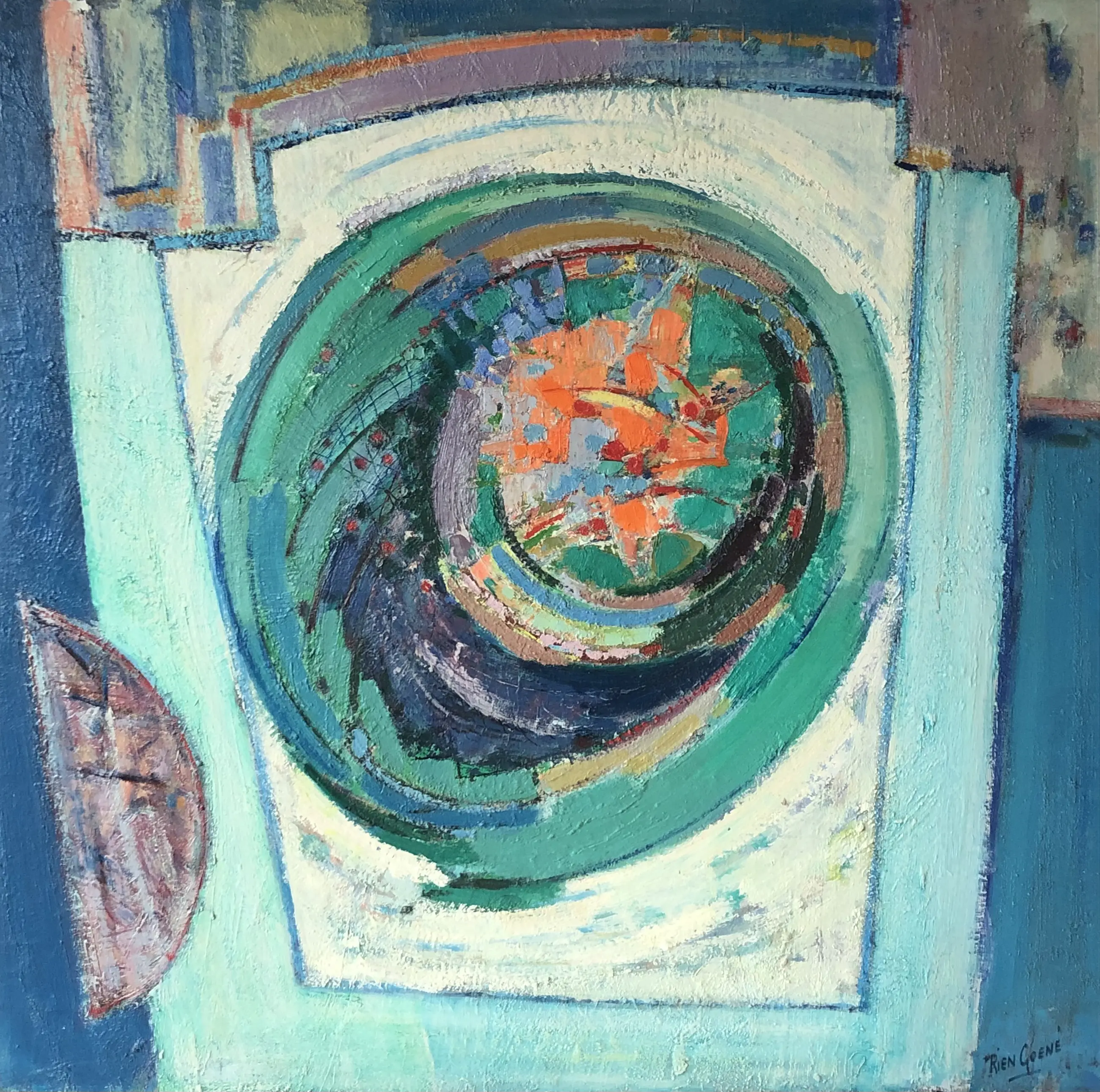 Energiek abstract olieverf schilderij van de veelzijdige Utrechtse kunstenaar Rien Goené. Opgezet met kwast en paletmes, rijk aan structuur en gevat in een nette lijst. Gedurende de veiling is het werk op afspraak te bezichtigen in het centrum van Utrecht.