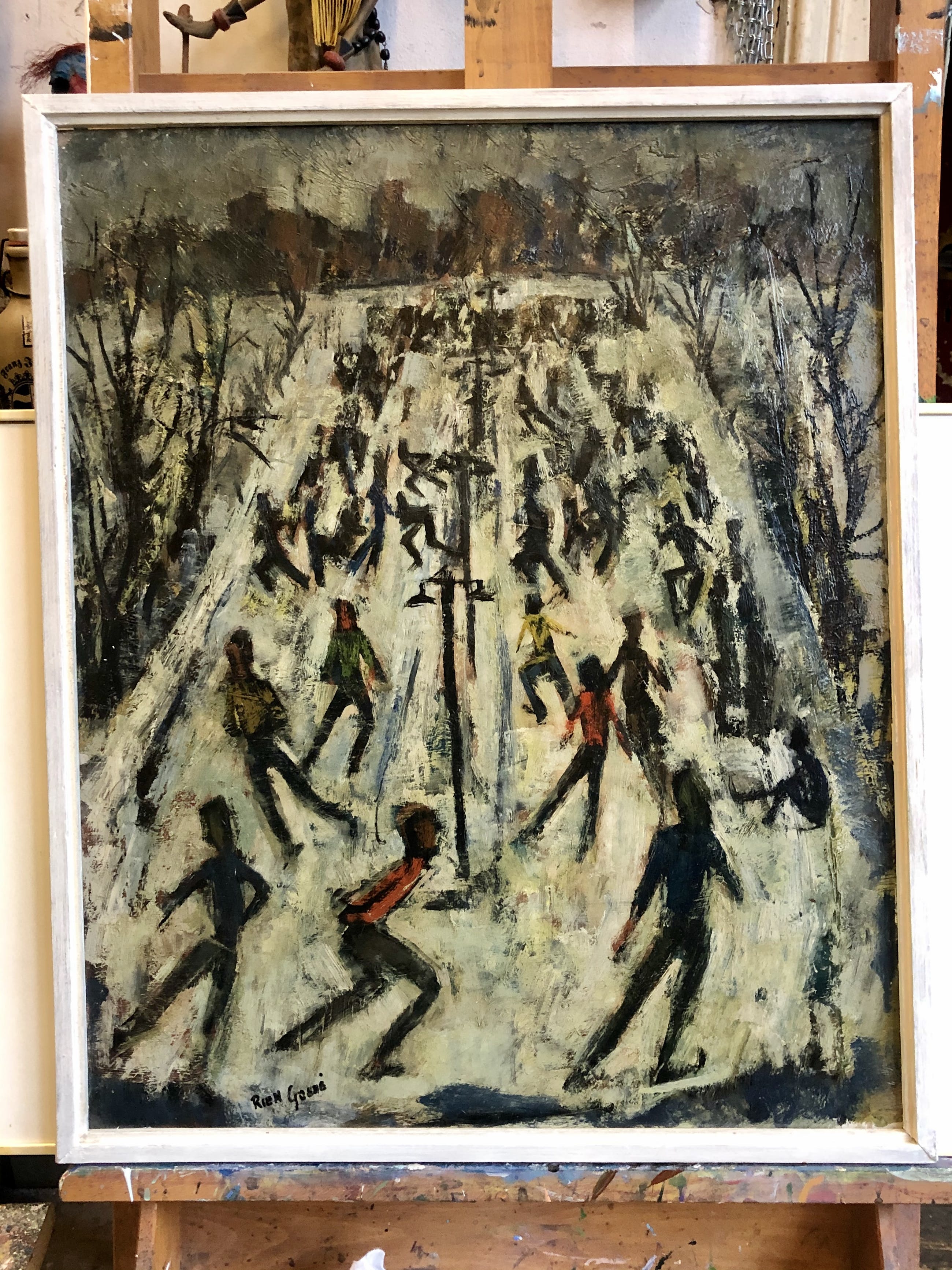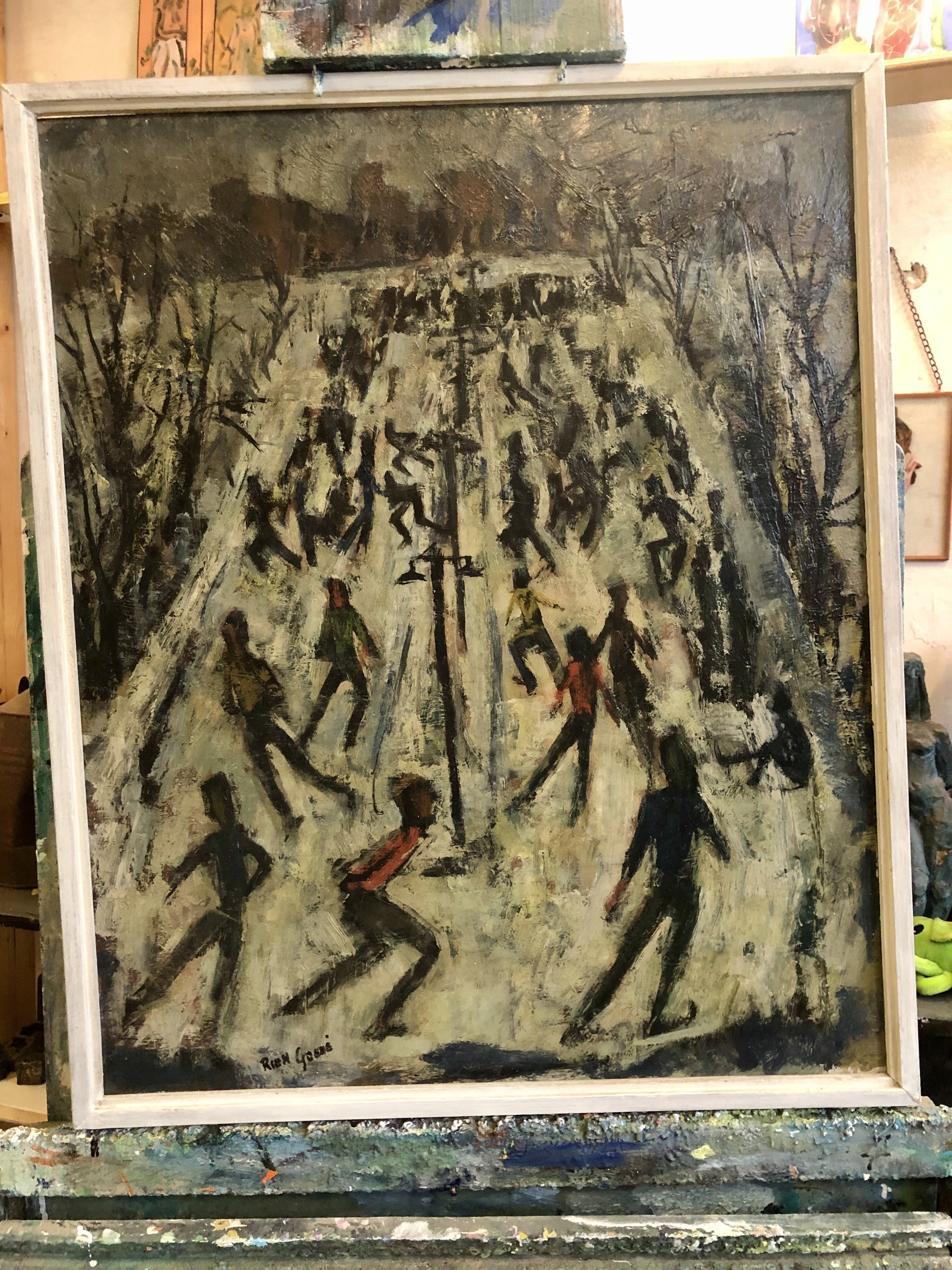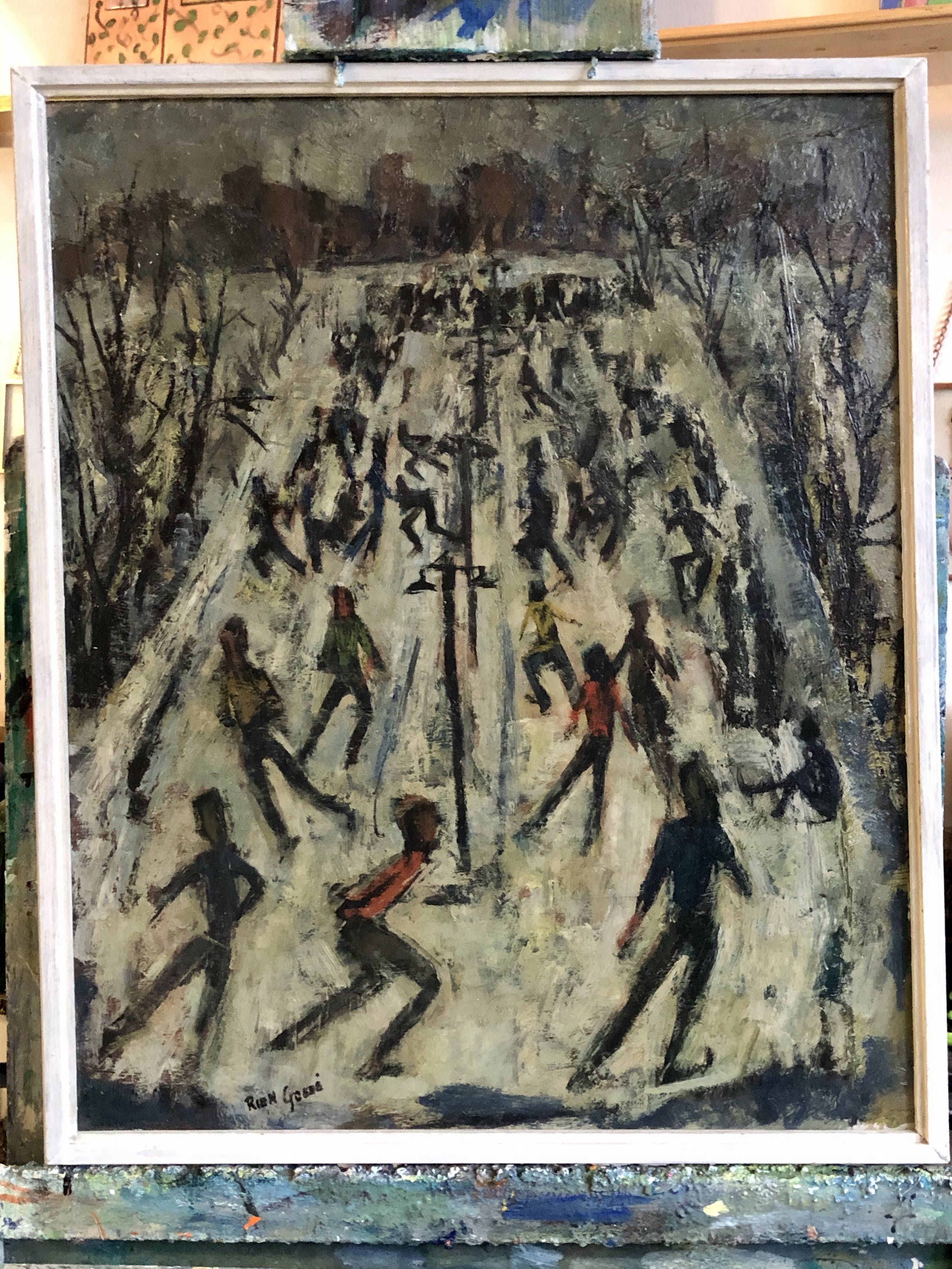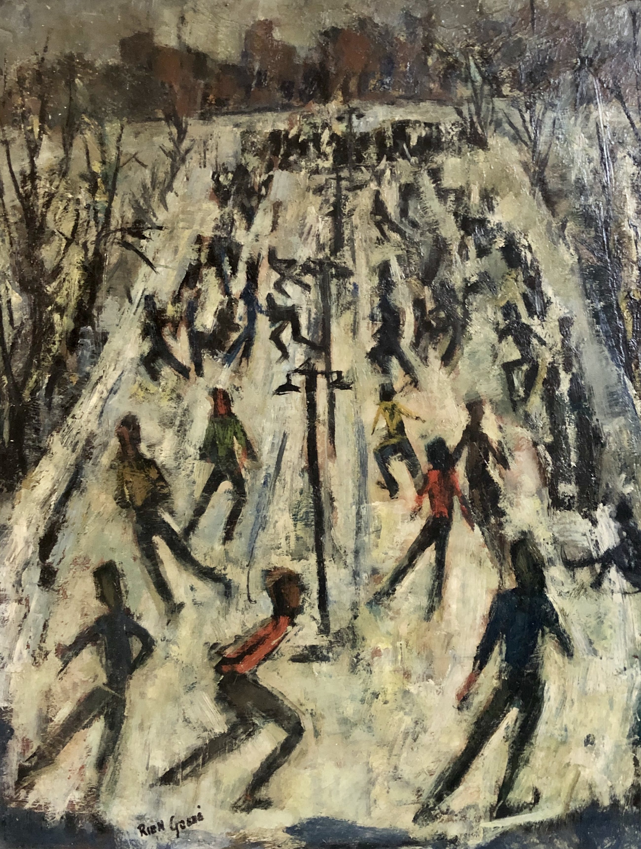 Olieverfschilderij van de bekende en veelzijdige Utrechtse kunstenaar Rien Goené uit de vroege jaren 50. Goené was een fervent watersporter, zomers zeilen en 's winters schaatsen.