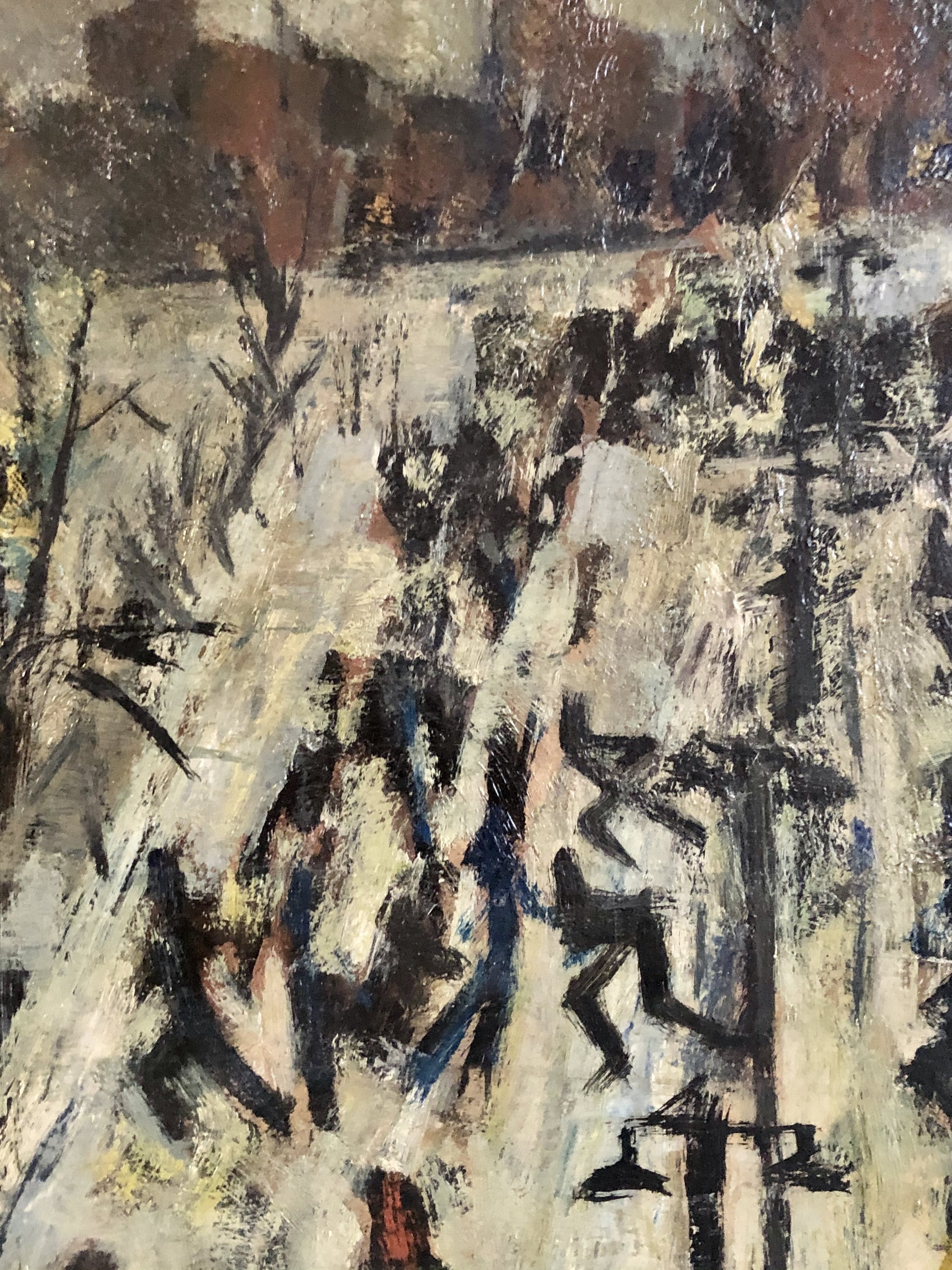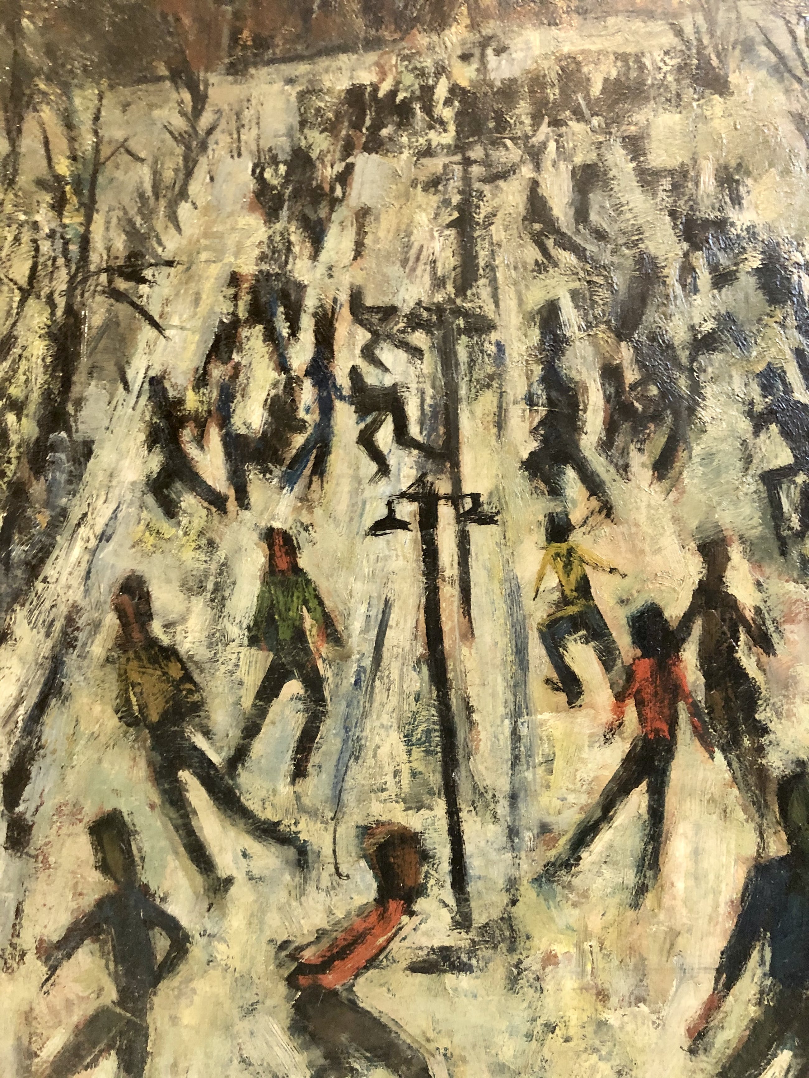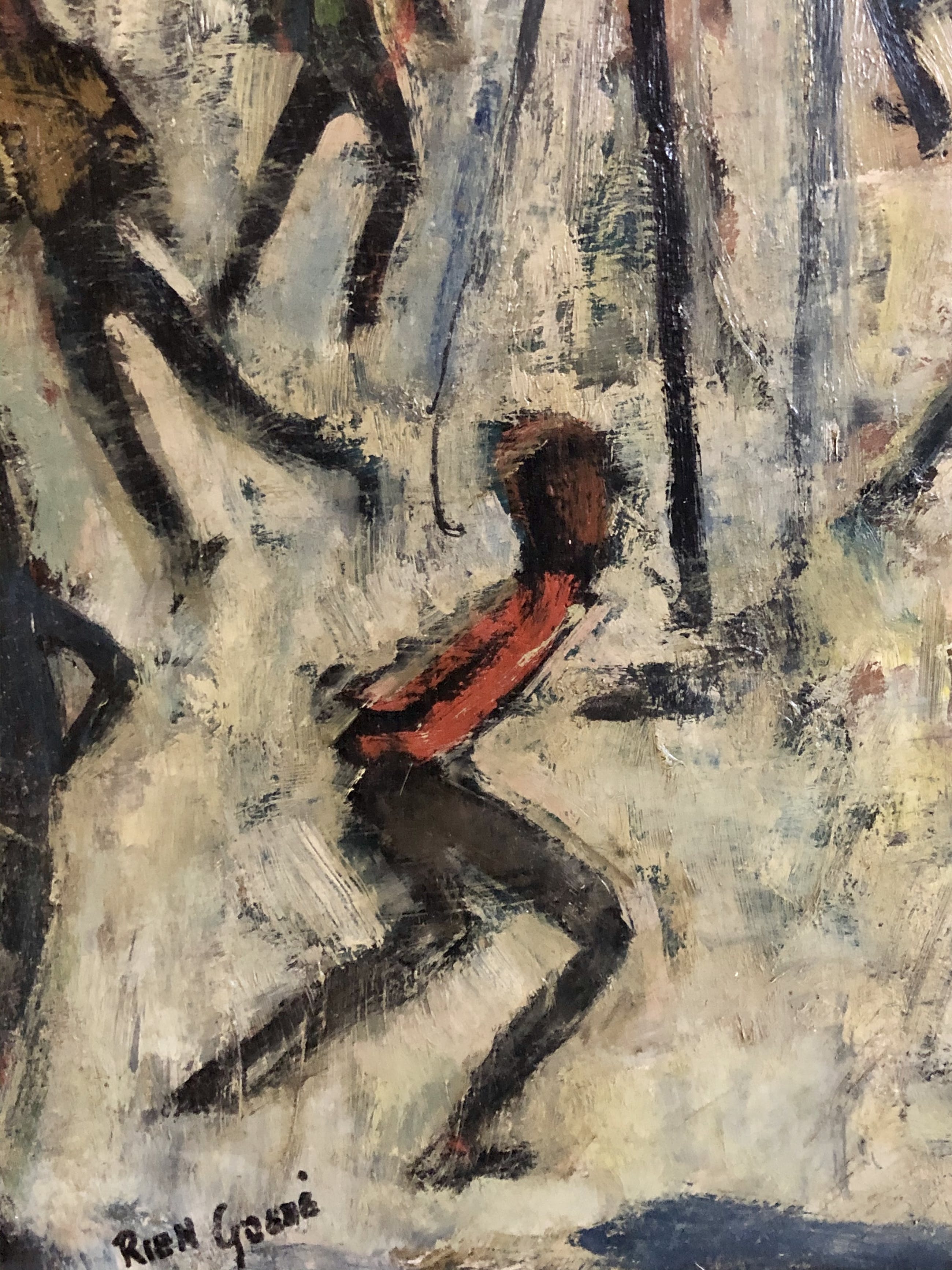 Olieverfschilderij van de bekende en veelzijdige Utrechtse kunstenaar Rien Goené uit de vroege jaren 50. Goené was een fervent watersporter, zomers zeilen en 's winters schaatsen.