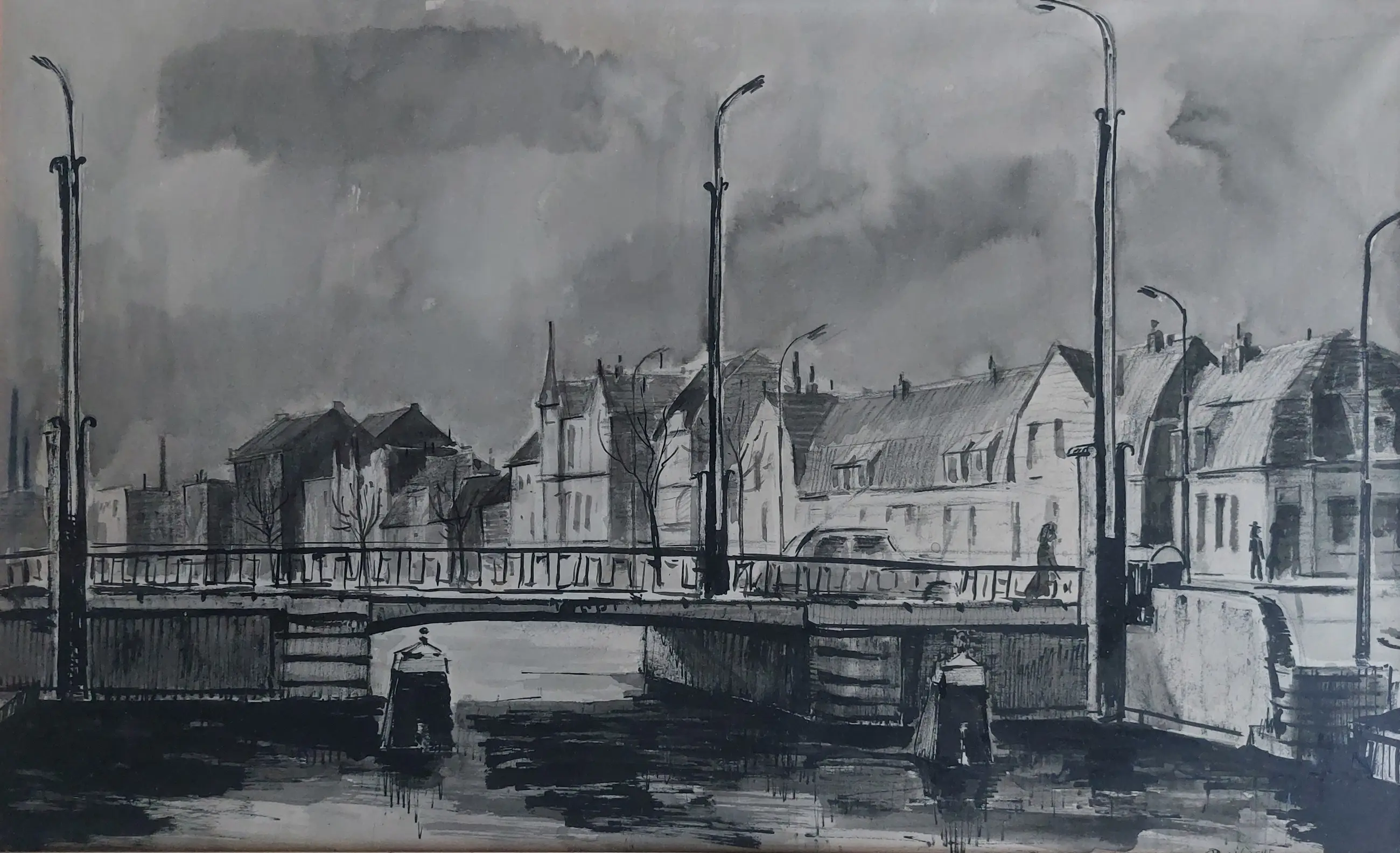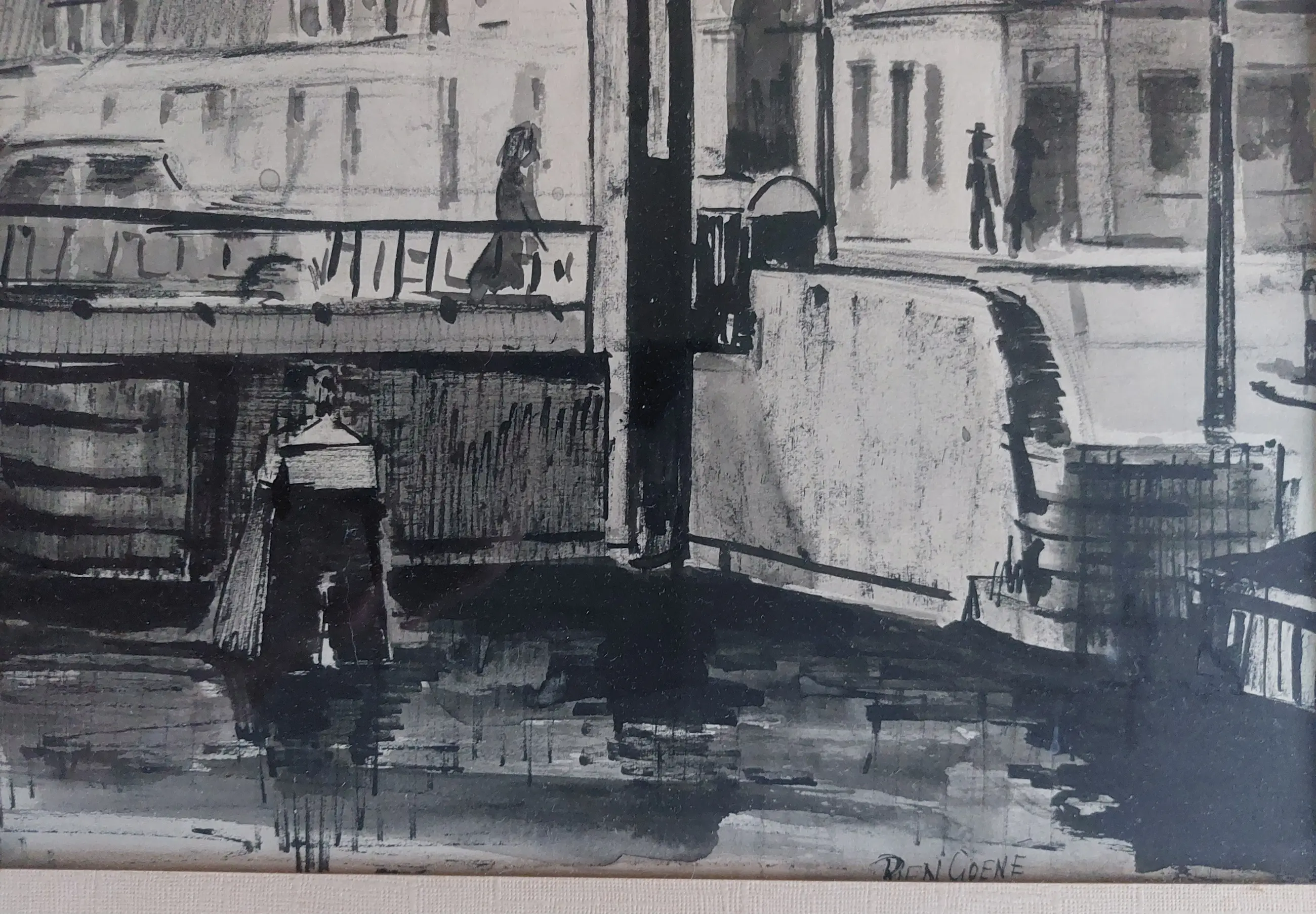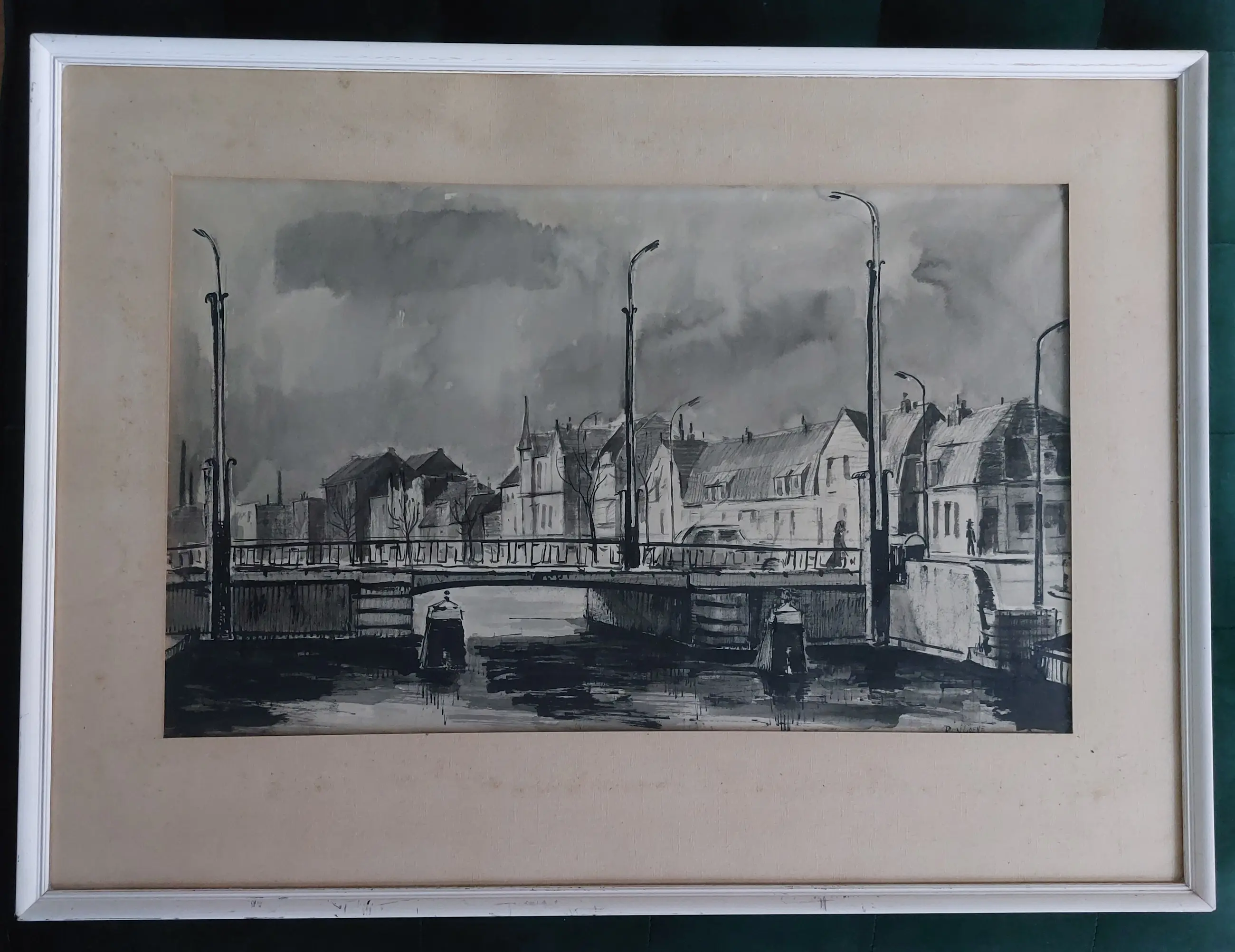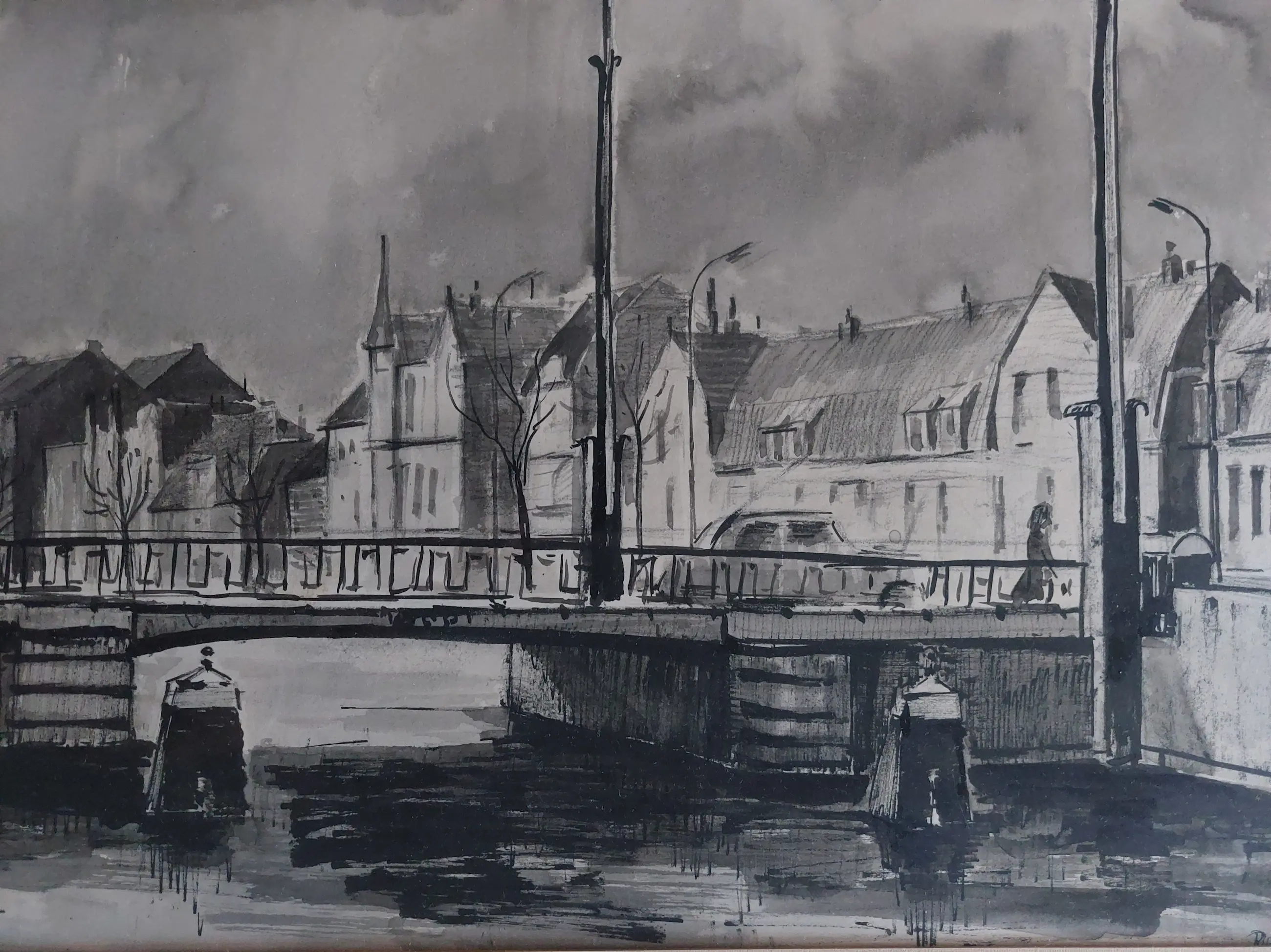 Grote gemengde techniek: inkttekening met zwarte waterverf van kunstenaar Rien Goené. Handgesigneerd rechtsonder. In de originele lijst. Betreft een stadsgezicht (Utrecht? ).