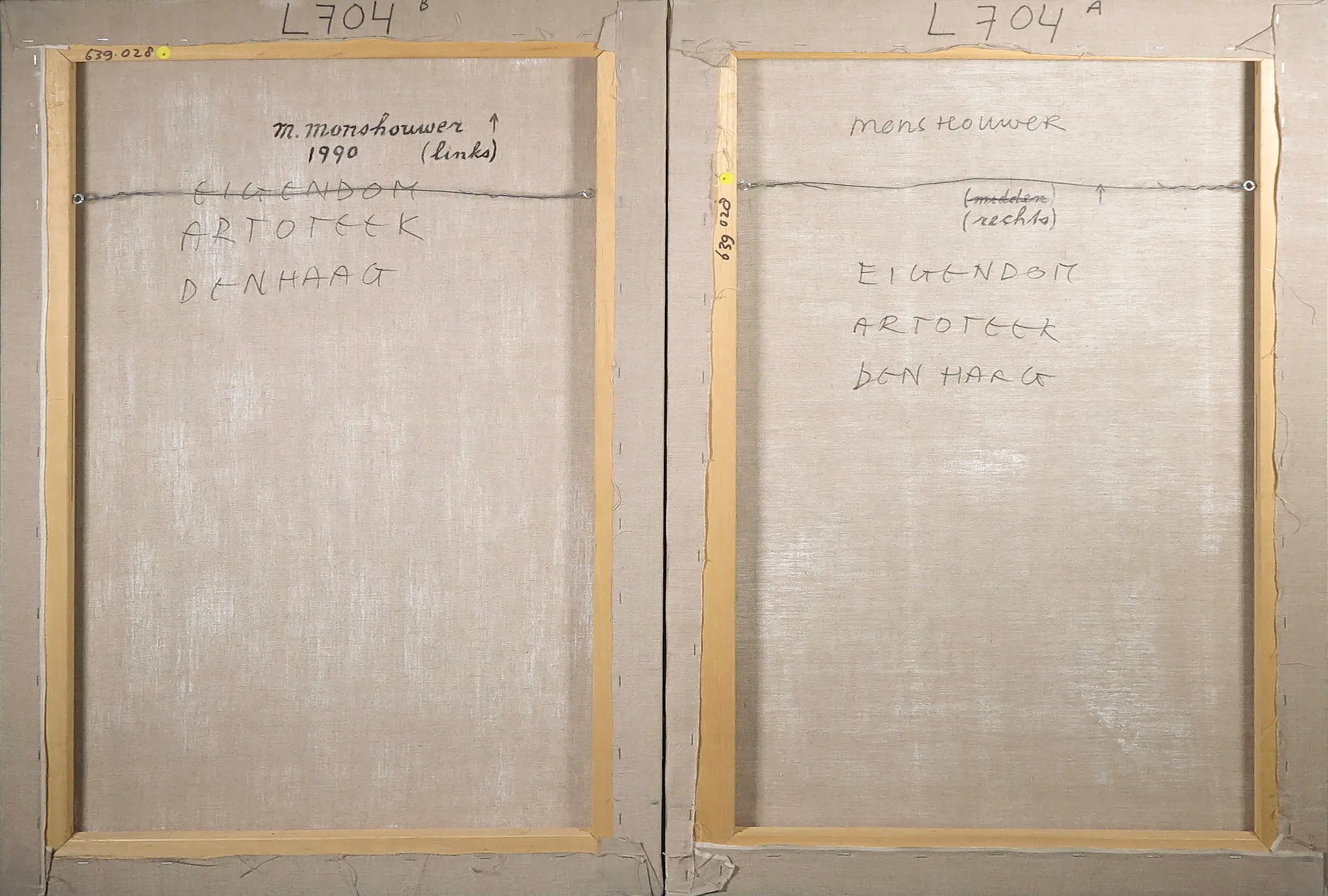 | De doeken zijn in goede staat, maar aan de randen (vooral bovenaan) vallen wel kleine plekjes verfschade te zien. Ook bevatten de doeken kleine deuken, vooral in de rechterhelft van het tweeluik. | |
