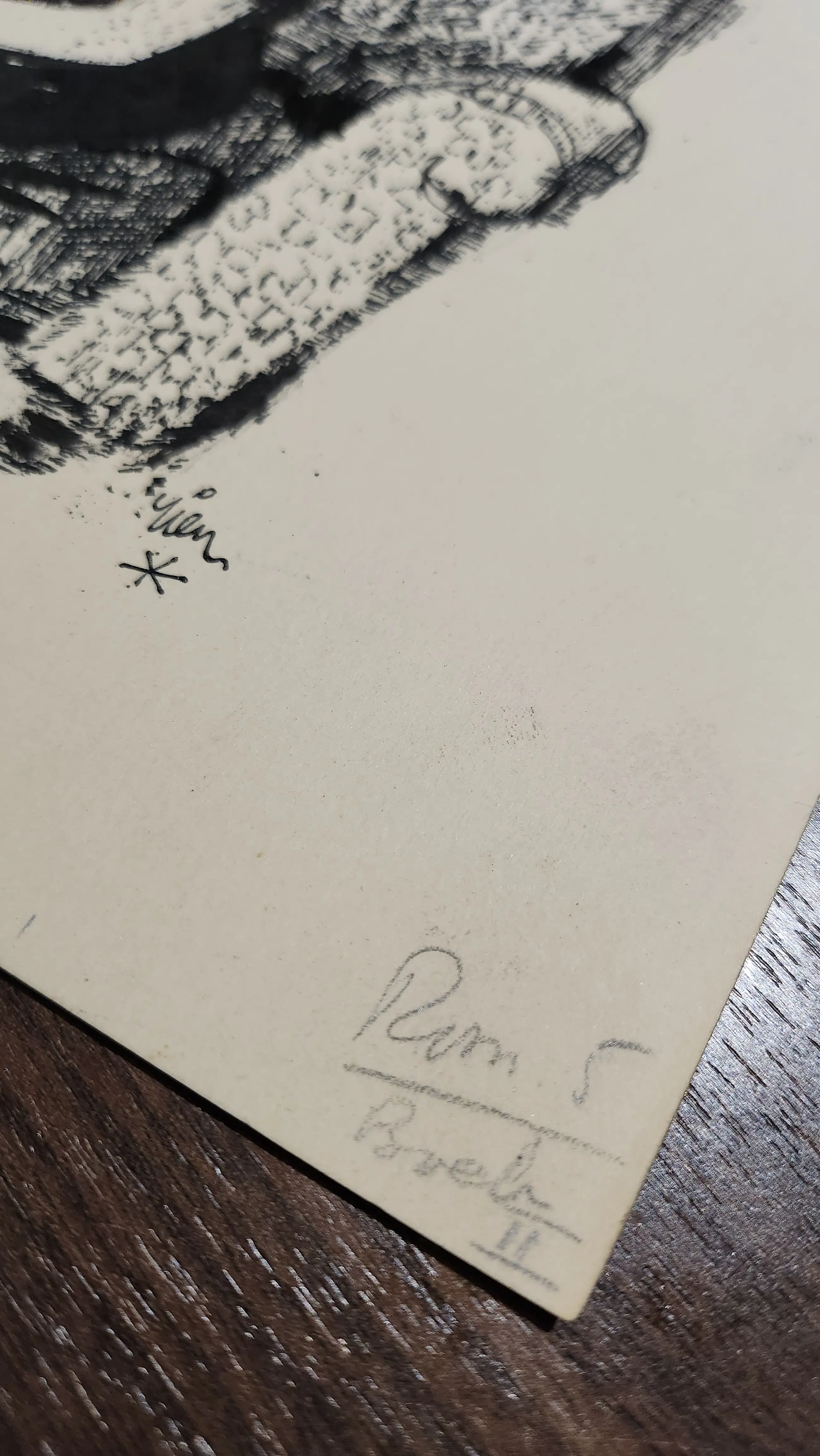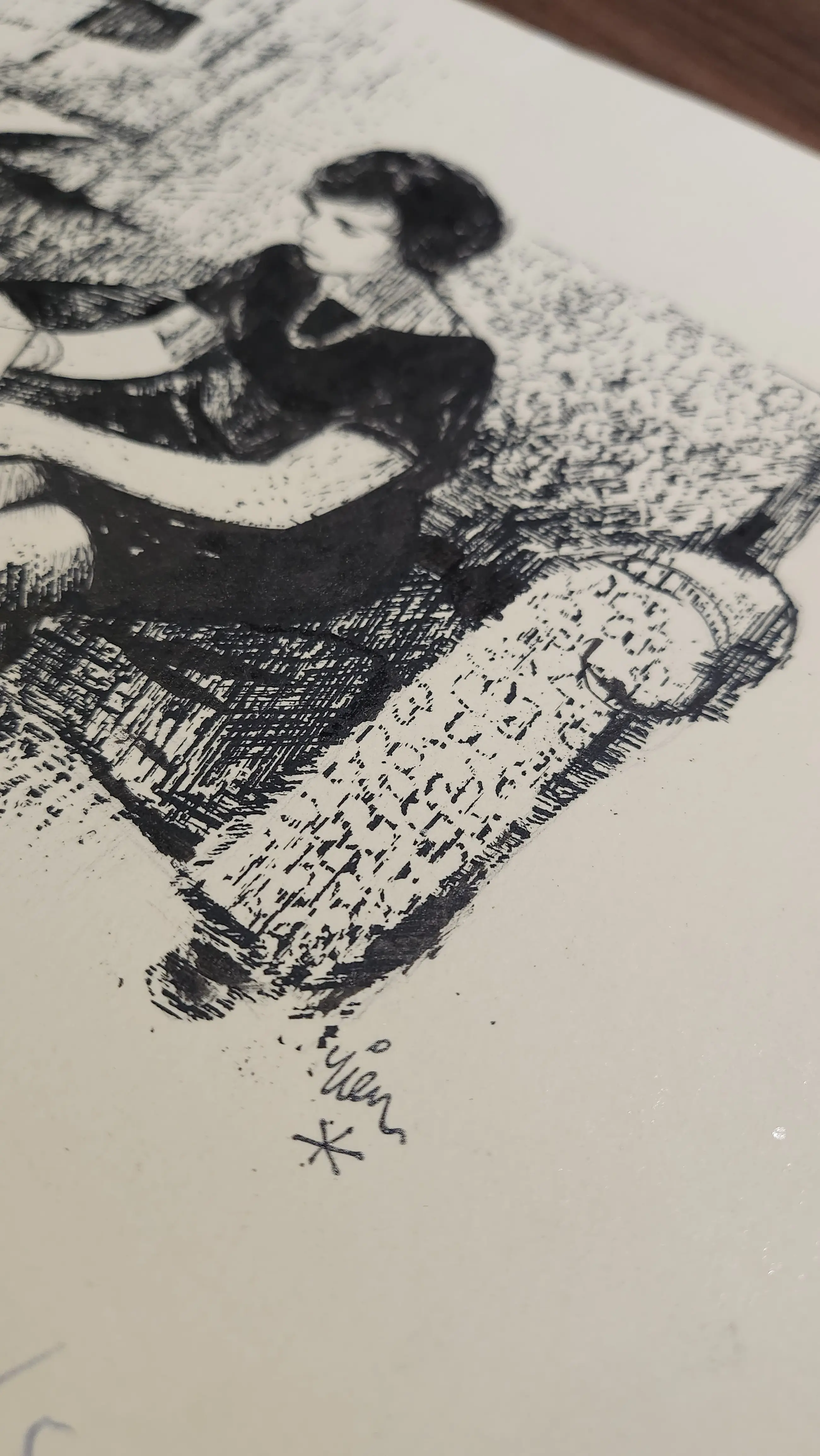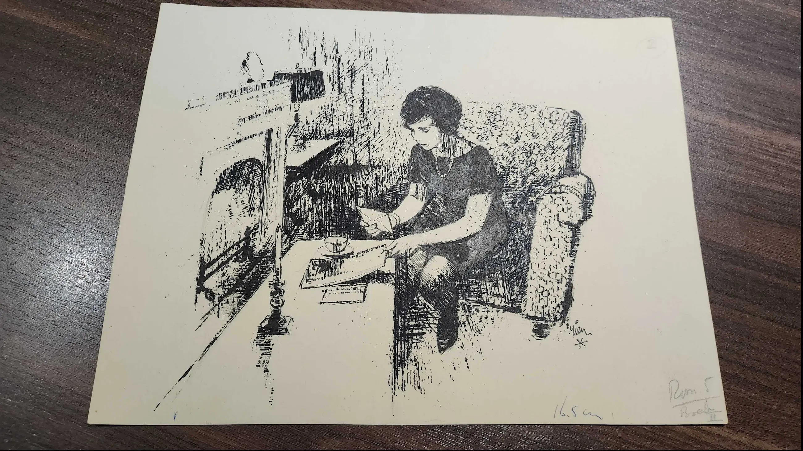 Originele tekening van Rien Poortvliet, dame met brief bij haard. Gesigneerd.