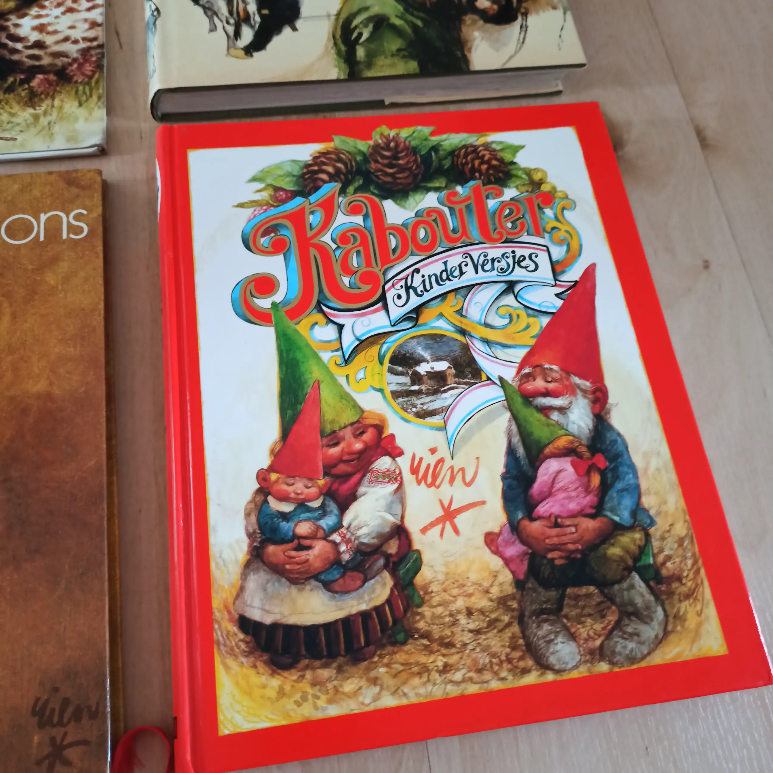 Kavel met 6 boeken van Rien Poortvliet, 2 aardewerk schoteltjes en een mapje met tekeningen om zelf te kleuren (pencil art)