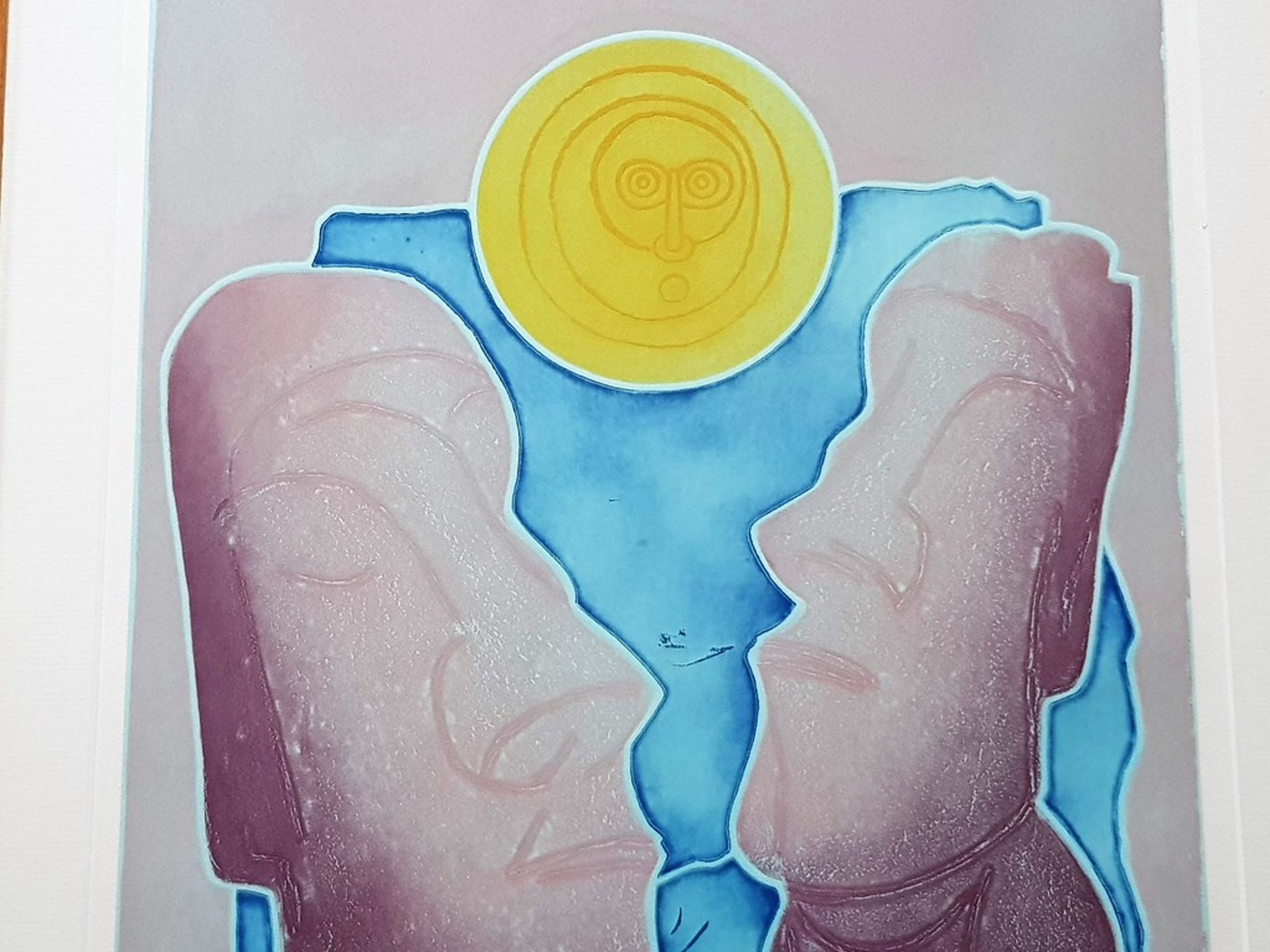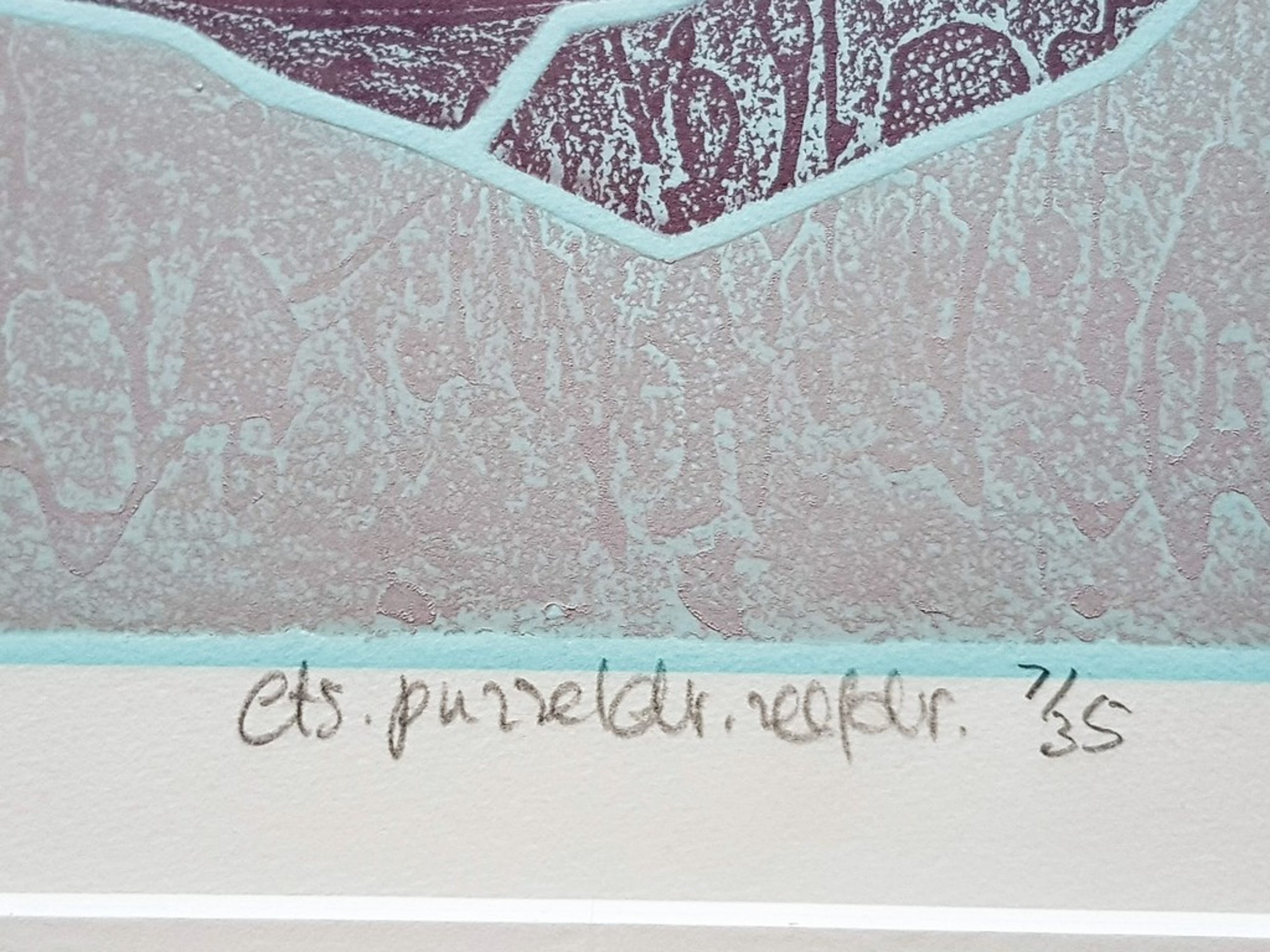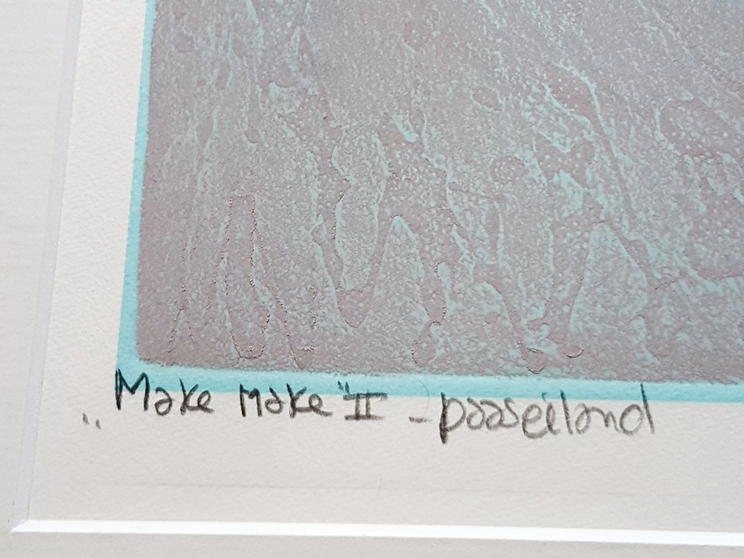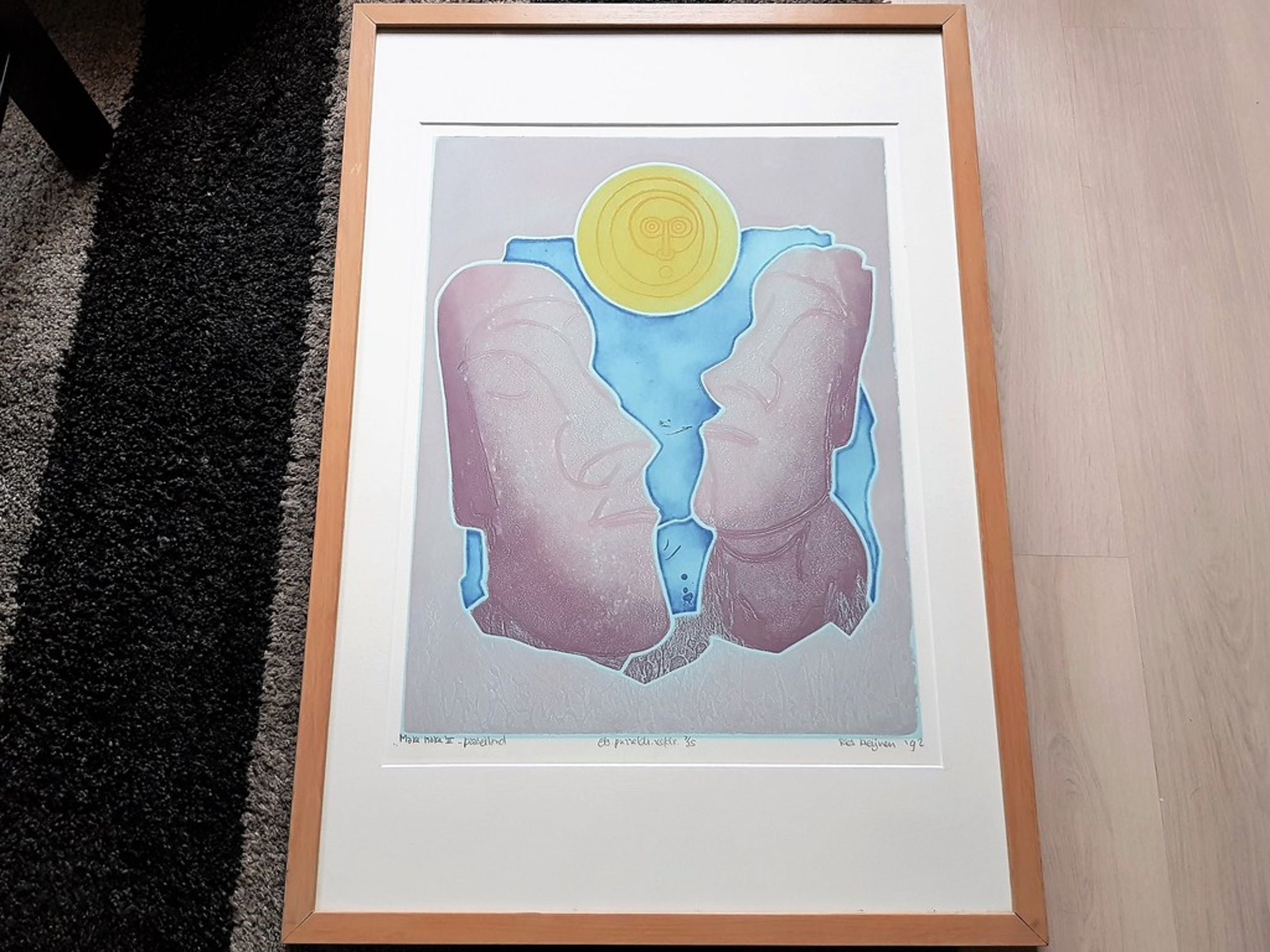 Ries Kleijnen. Geboren, Wijchen 1945. Ets, Puzzeldruk, Zeefdruk. Oplage: 7/35. Titel: Make Make ll - Paaseiland. Afm totaal: 99 x 69 cm. Beeldformaat: 68.5 x 52.5 cm. Het schilderij is erg zwaar en te groot om te versturen, kan alleen opgehaald worden. Conditie, perfect. Inclusief: glasplaat, ophangmogelijkheid en houten lijst.