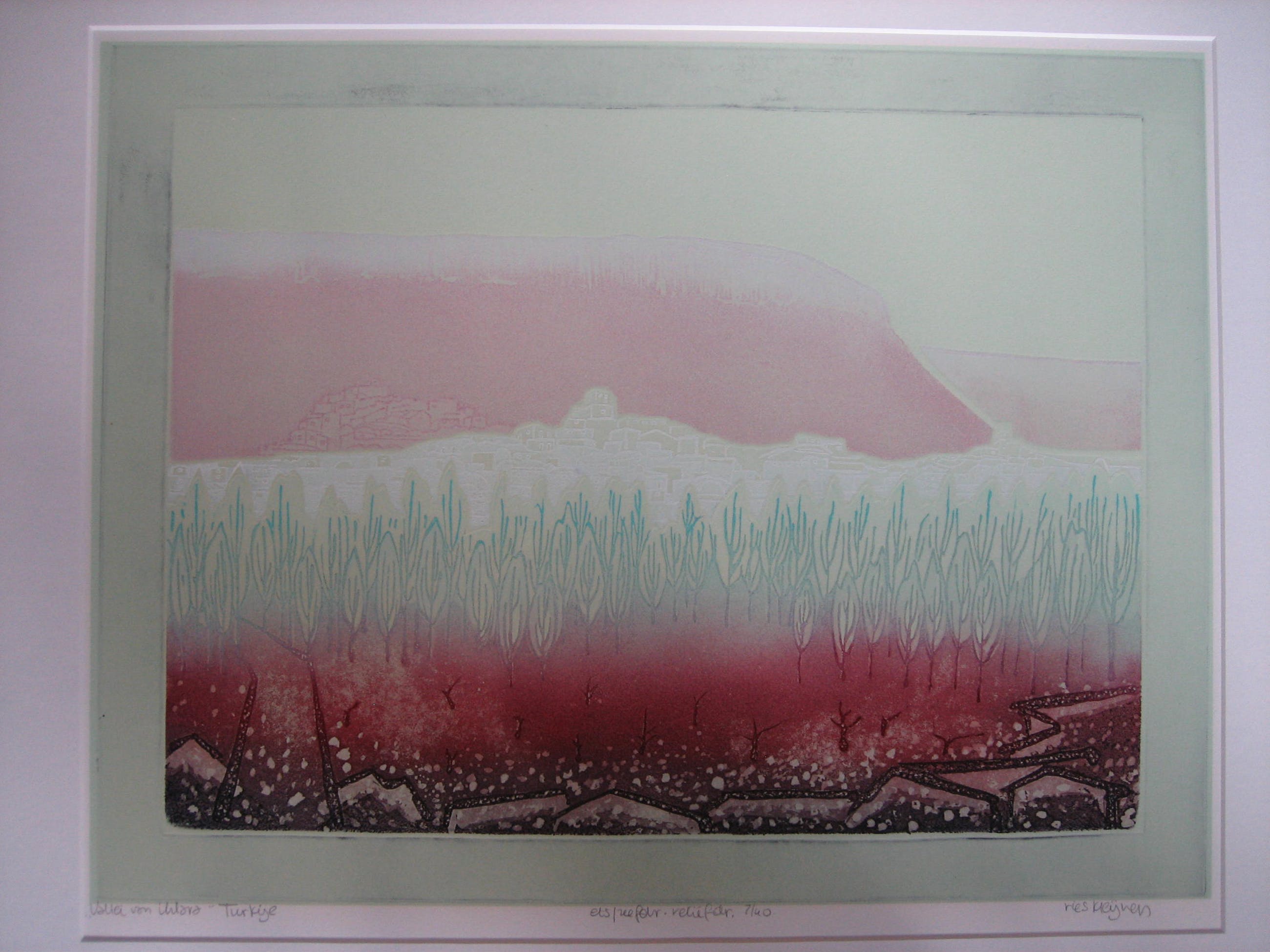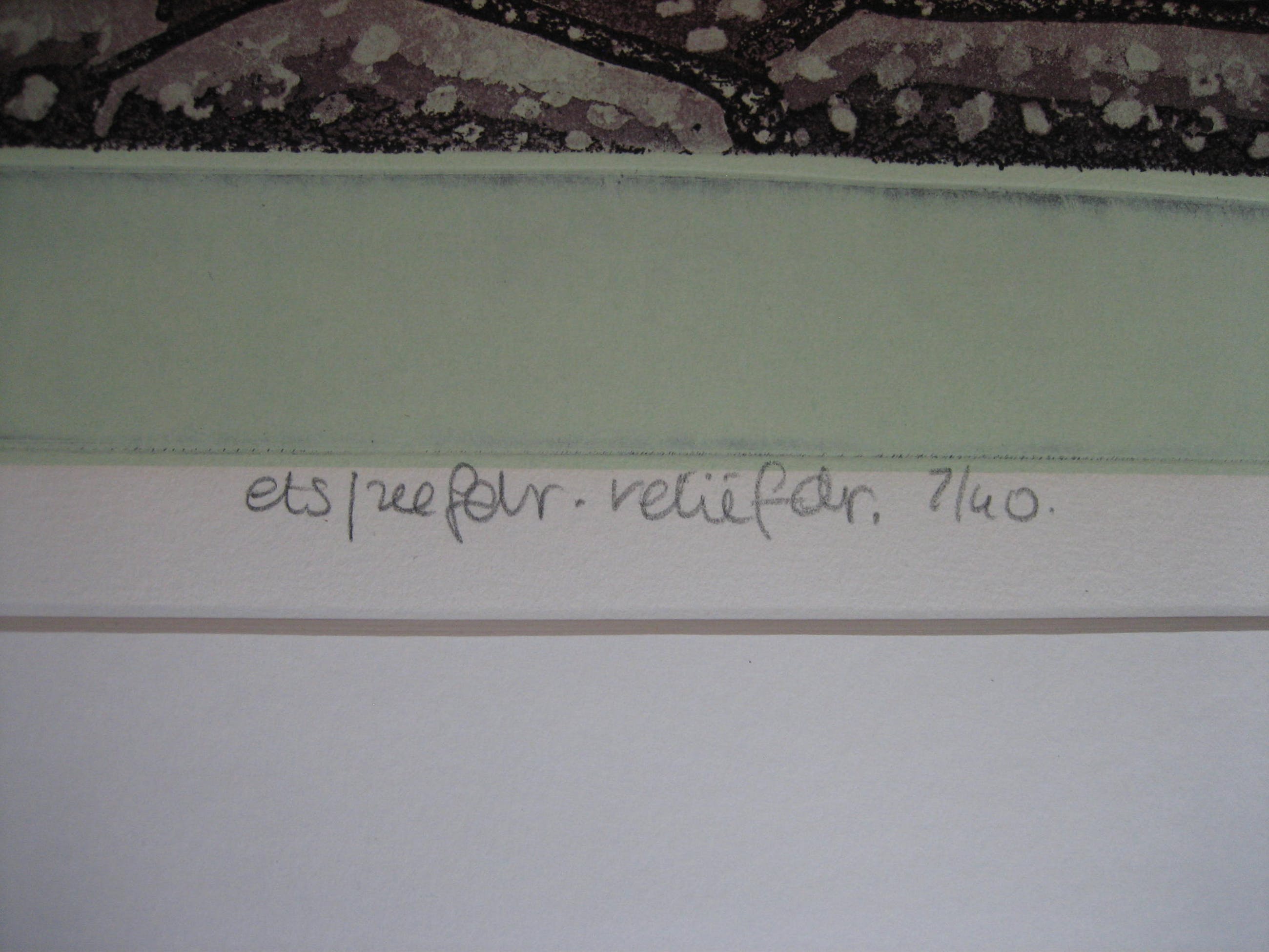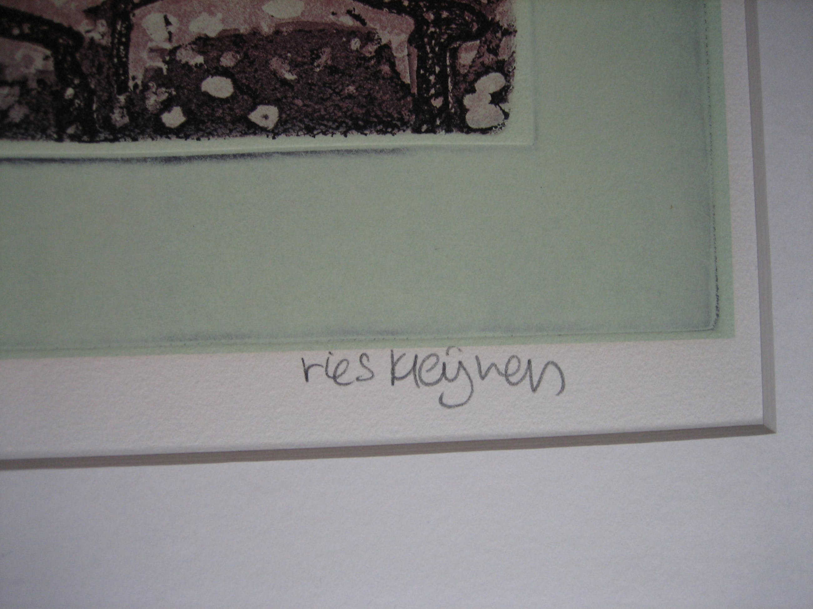 gecombineerde techniek van ets/zeefdruk/reliefdruk. genoemd ematen zijn de maten van de plaat/afbeelding. Tegen meerprijs van € 30,- kan het werk worden geleverd, ingelijst met passe-partout in in alu-wissellijst van 77x90 cm., in welke geval alleen afgehaald in Vlaardingen kwan worden geleverd i.v.m. breukrisico.