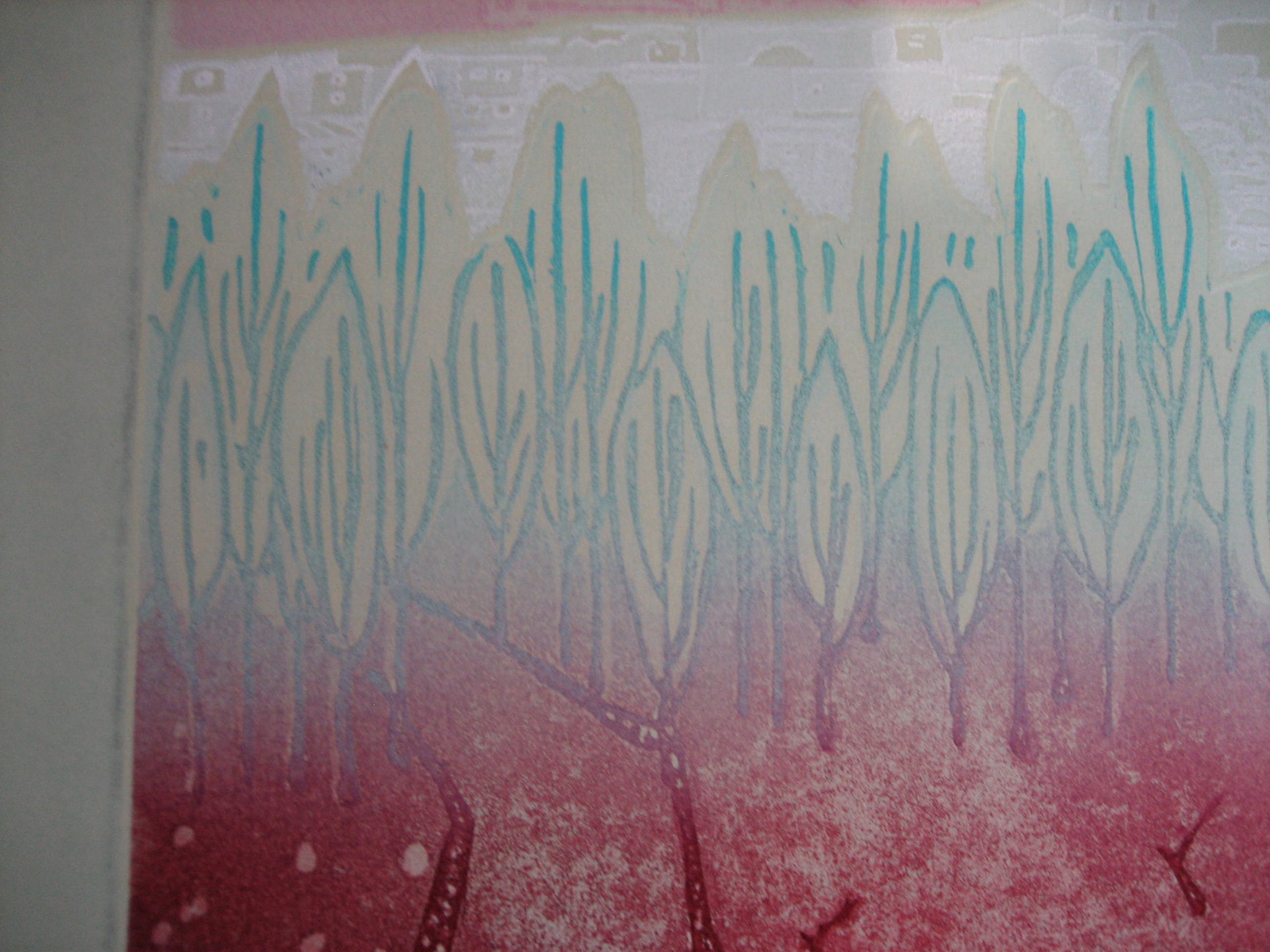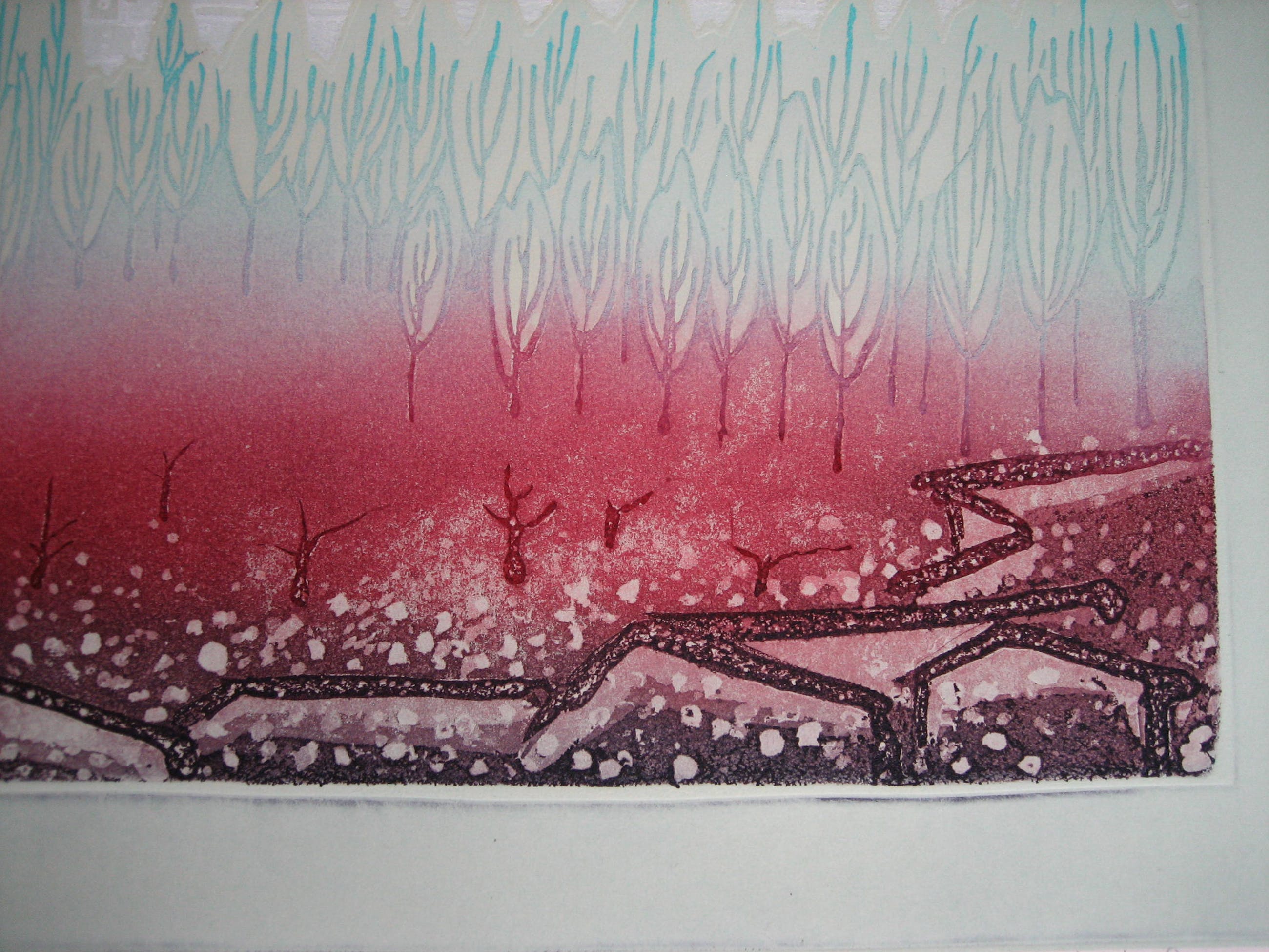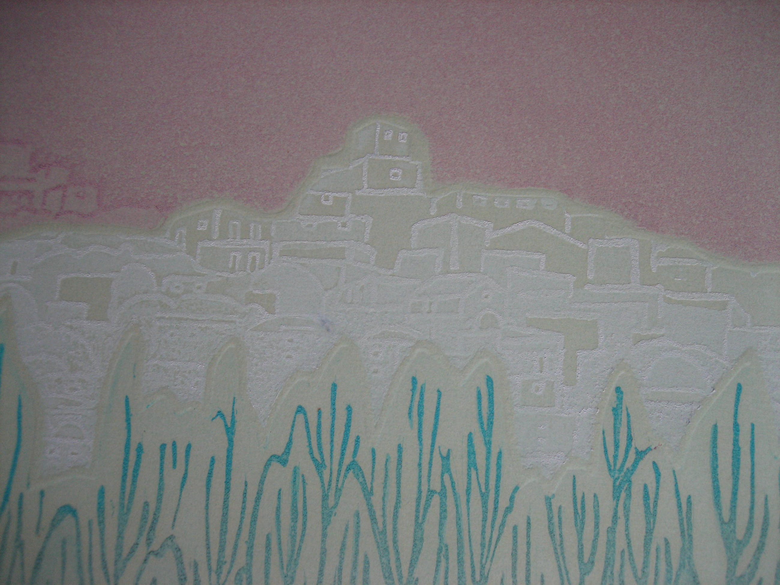 gecombineerde techniek van ets/zeefdruk/reliefdruk. genoemd ematen zijn de maten van de plaat/afbeelding. Tegen meerprijs van € 30,- kan het werk worden geleverd, ingelijst met passe-partout in in alu-wissellijst van 77x90 cm., in welke geval alleen afgehaald in Vlaardingen kwan worden geleverd i.v.m. breukrisico.