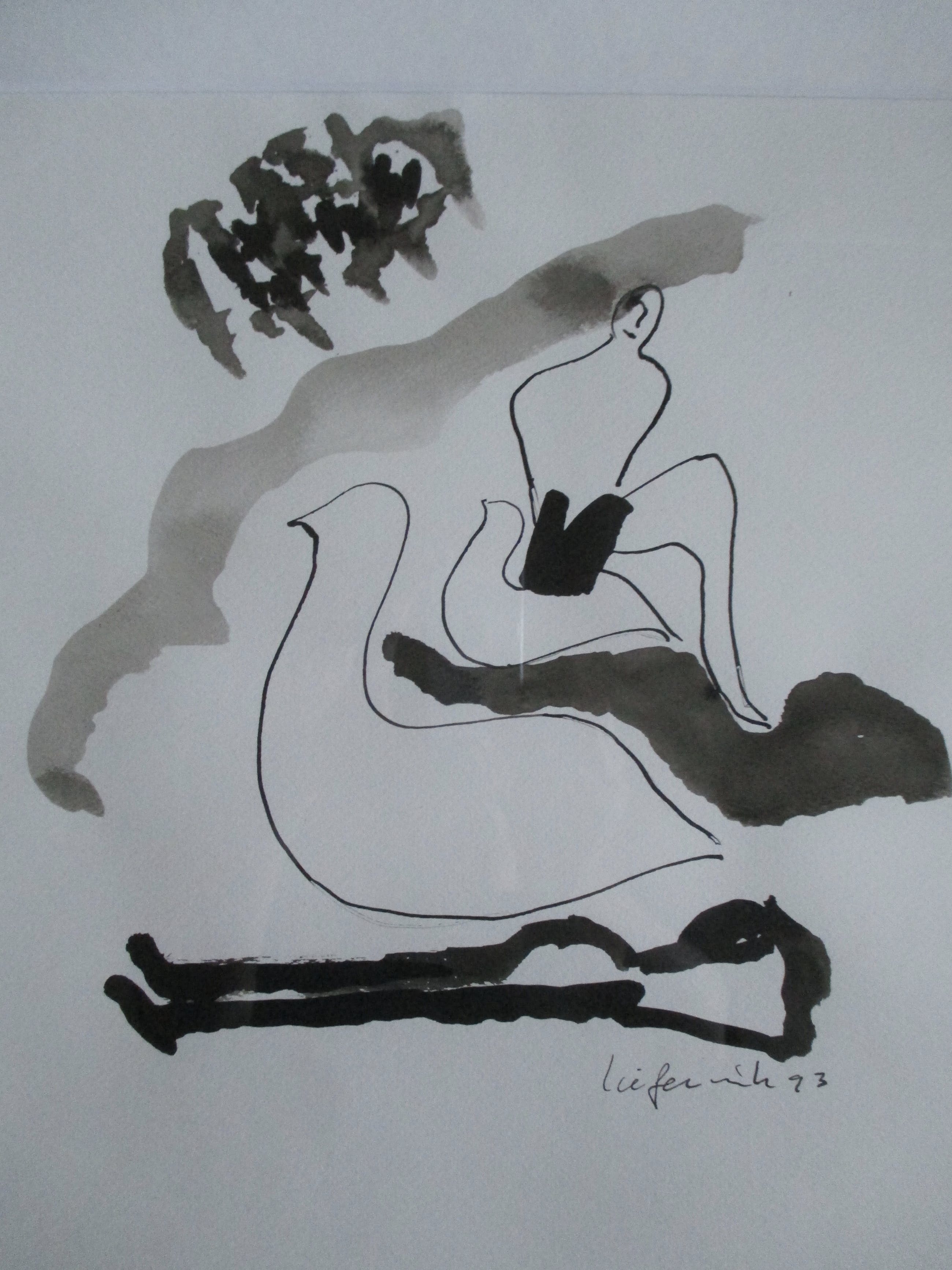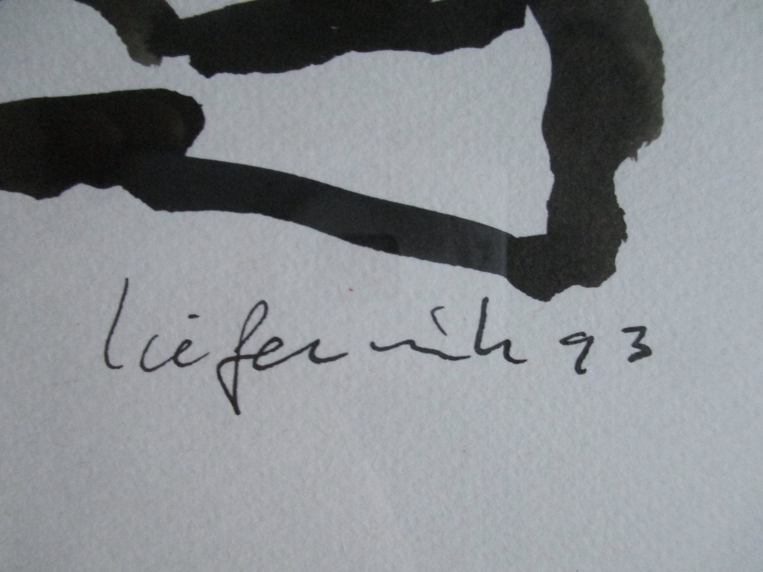 Penseeltekening van Riet Lieferink, gesigneerd en gedateerd r.o. Ingelijst achter passe-partout en glas in witte aluminium lijst.