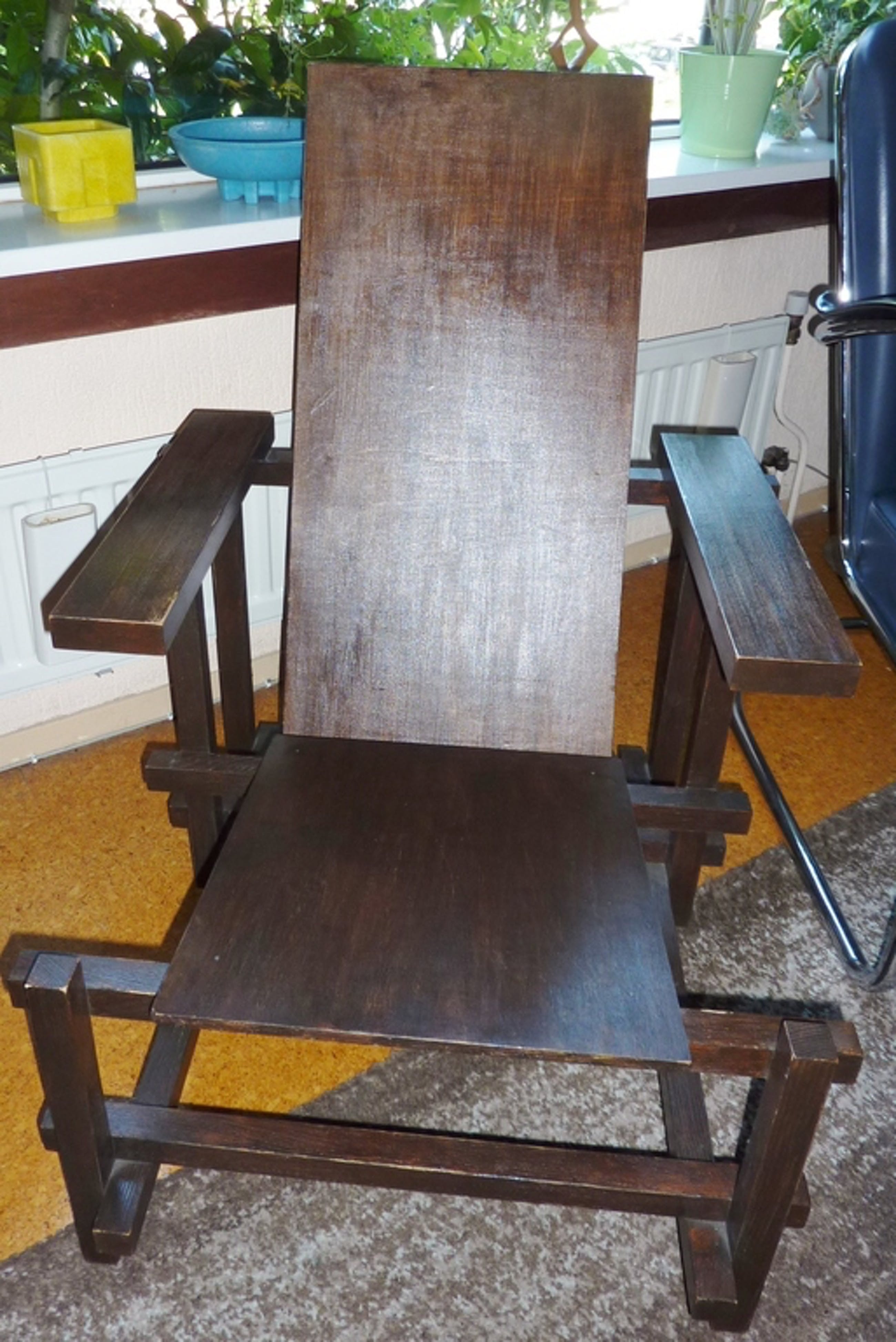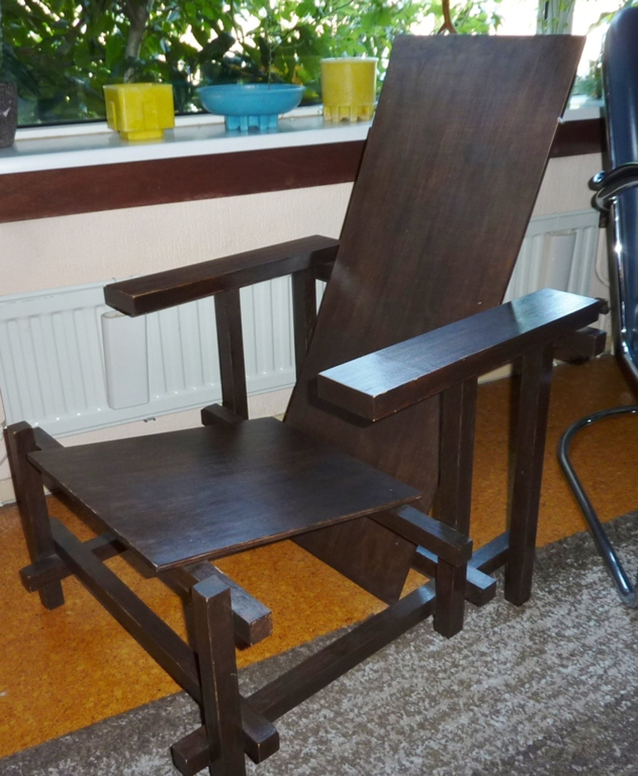 Oorspronkelijk werd de beroemde rood-blauwe Rietveldstoel (1918-1923) uitgevoerd in ongekleurd hout maar met twee zijpanelen.