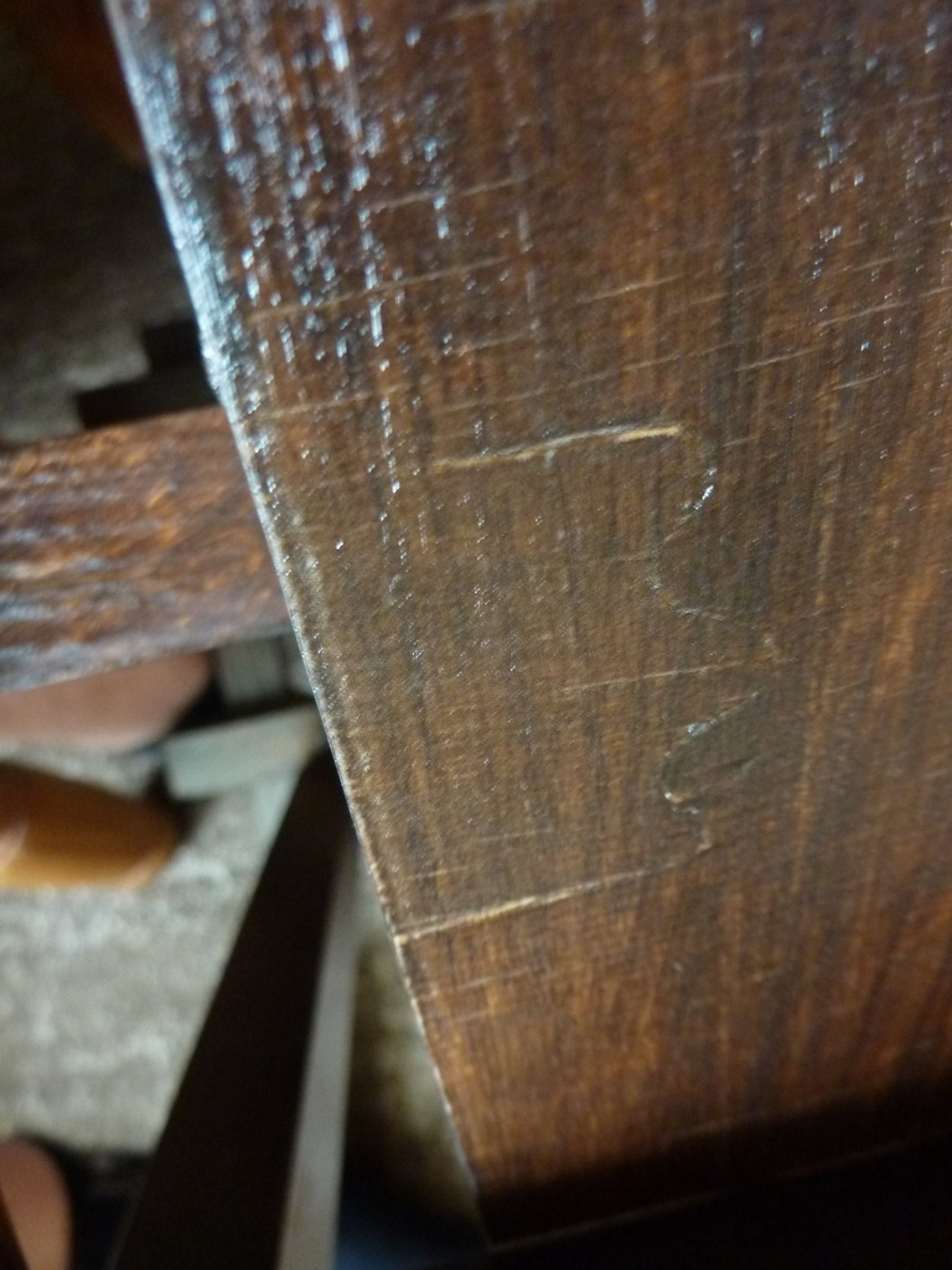 Zie afbeeldingen voor de staat. De stoel is in goede gebruikte staat. Mist een spijkertje in de rugleuning. Achterzijde rugleuning schijnt twee identieke merken(?) te hebben