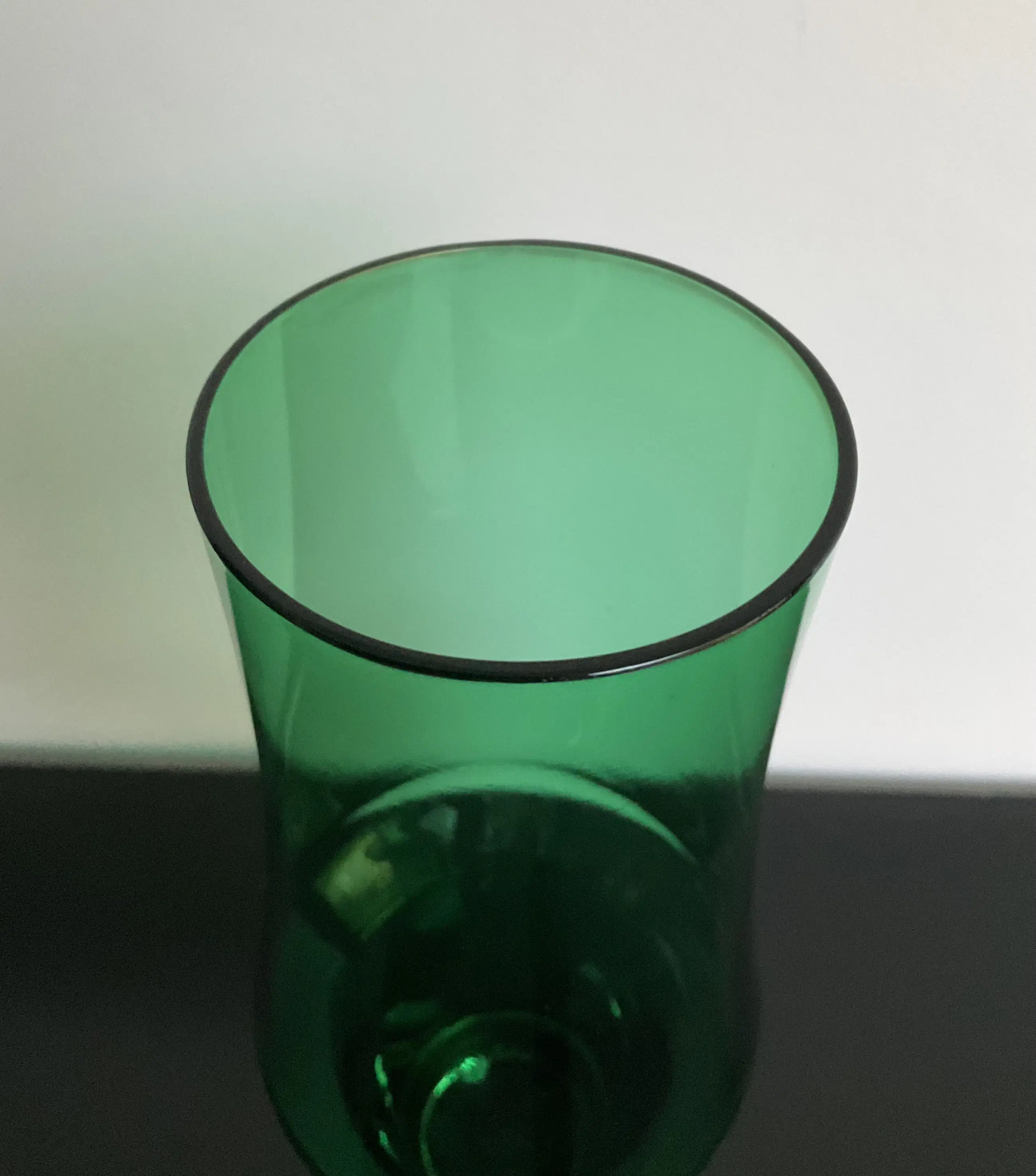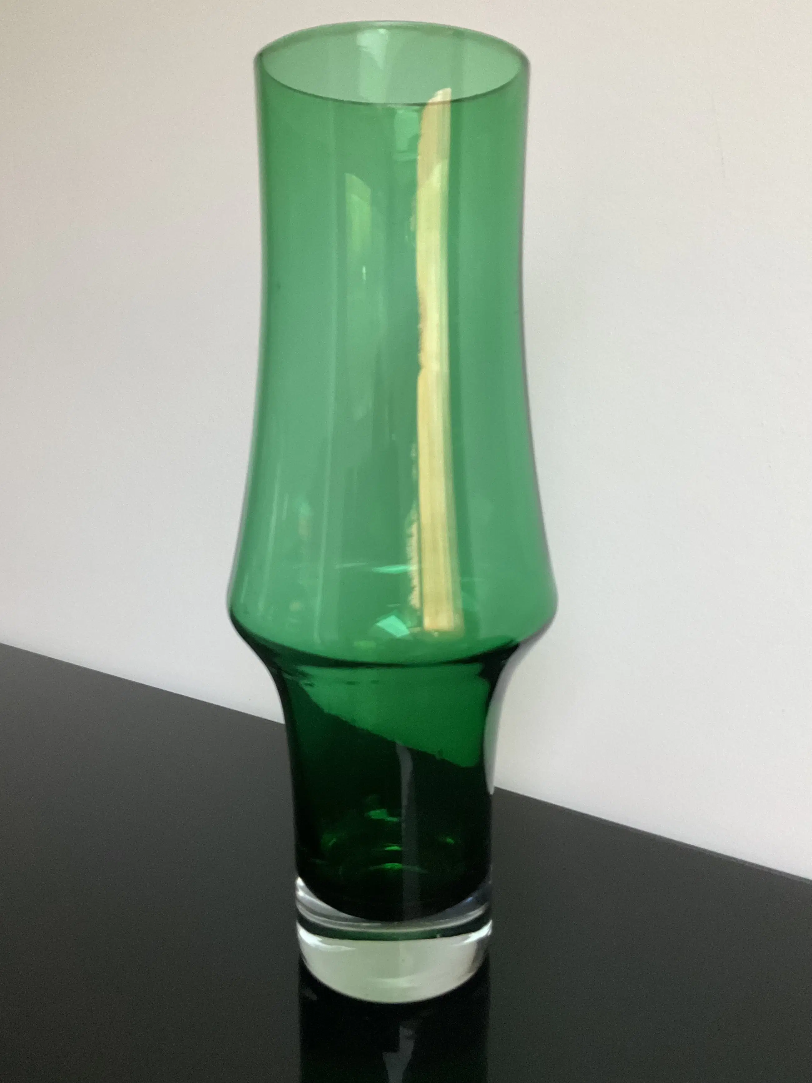 De groen glazen vaas uit de jaren ‘60 is ontworpen door Tamara Aladin voor Riihimaën Lasi. De hoogte van de vaas is 25 cm.