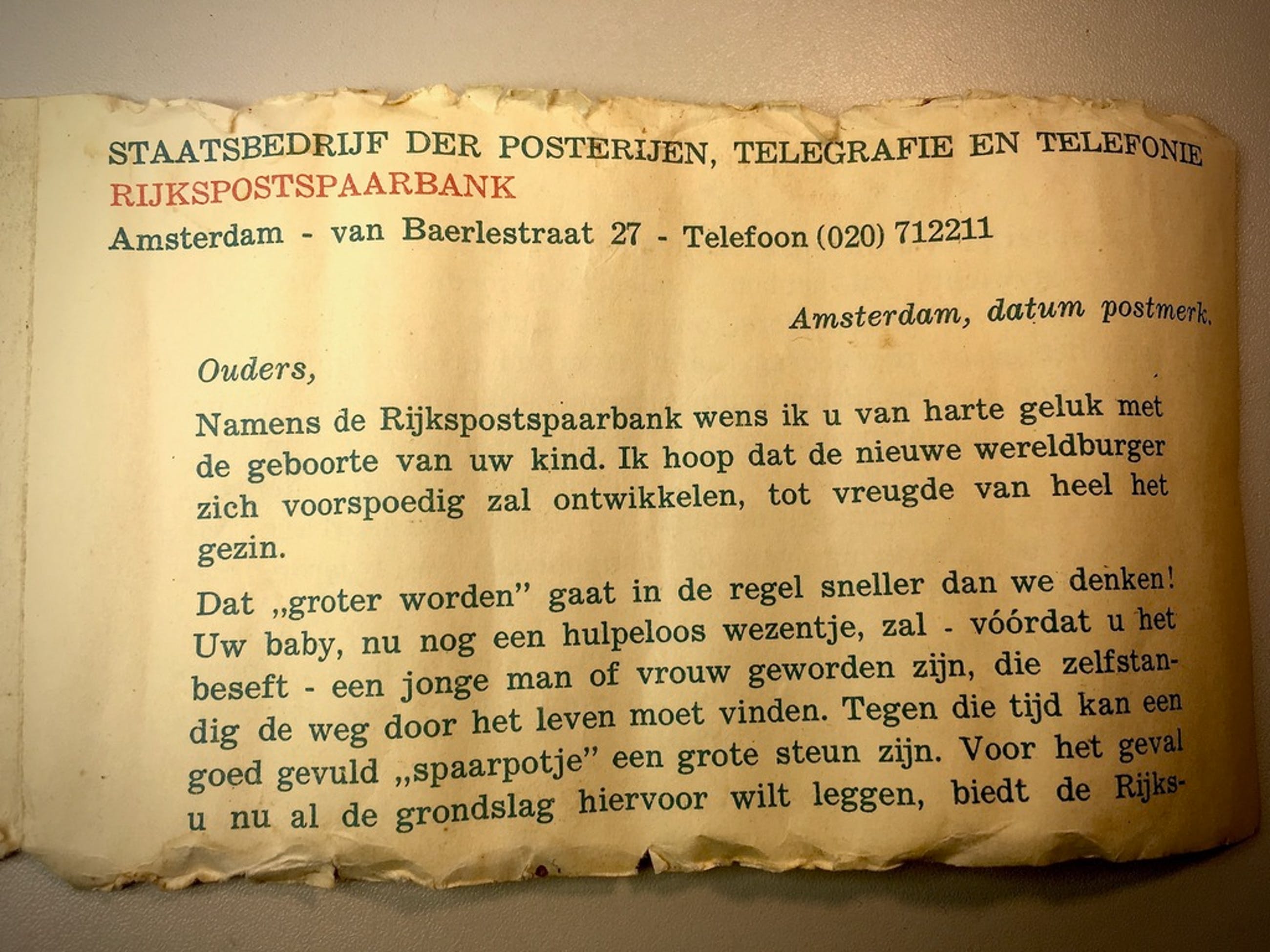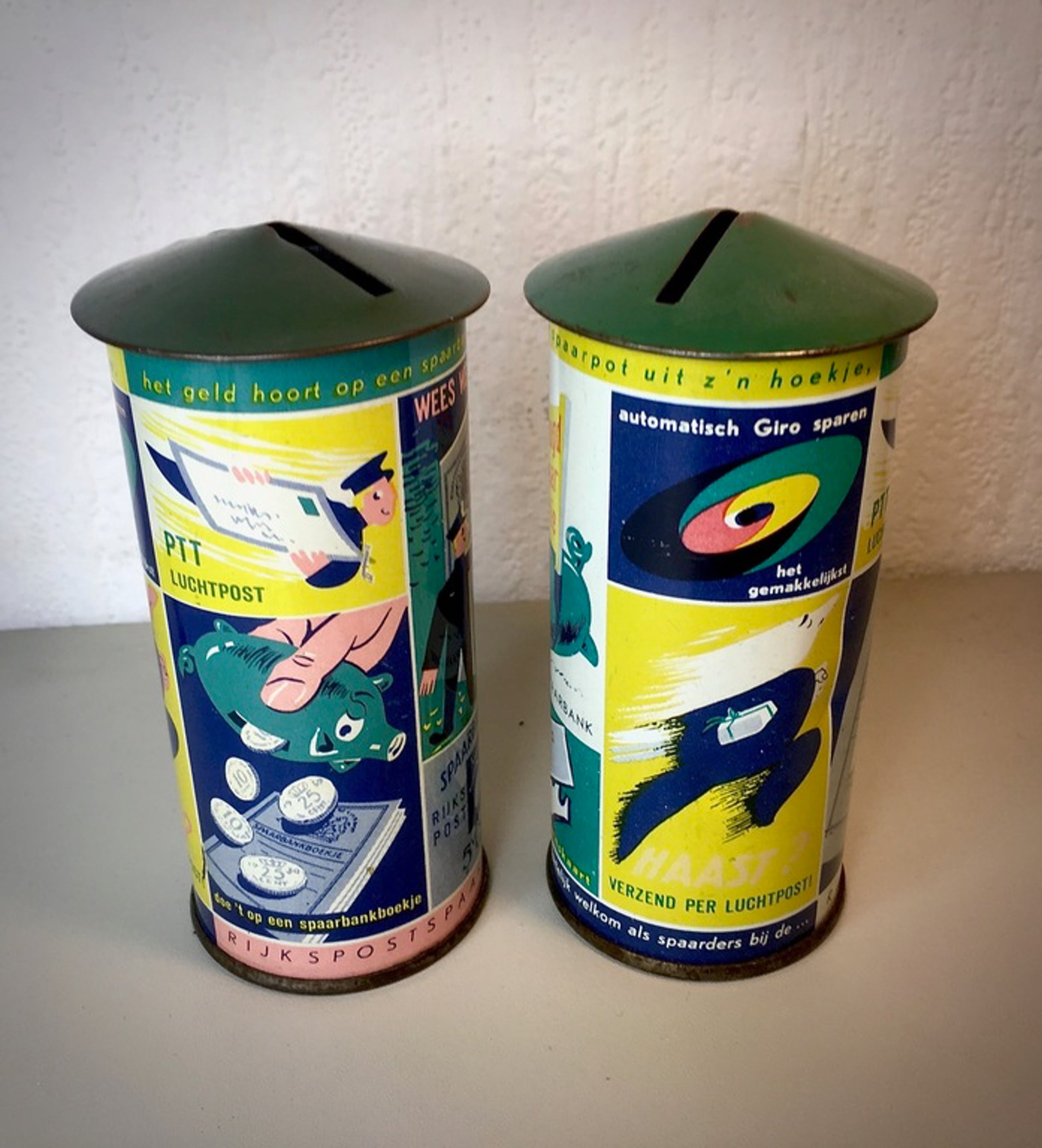 Ronde spaarpotten in de vorm van een reclamezuil met konische bovenzijde. Met de tekst: "haal de spaarpot uit zijn hoekje, het geld hoort op een spaarbankboekje" van de Rijkspostspaarbank. het gaat om twee verschillende versies. Inclusief originele waardebon van de Rijksspaarbank (zeldzaam).