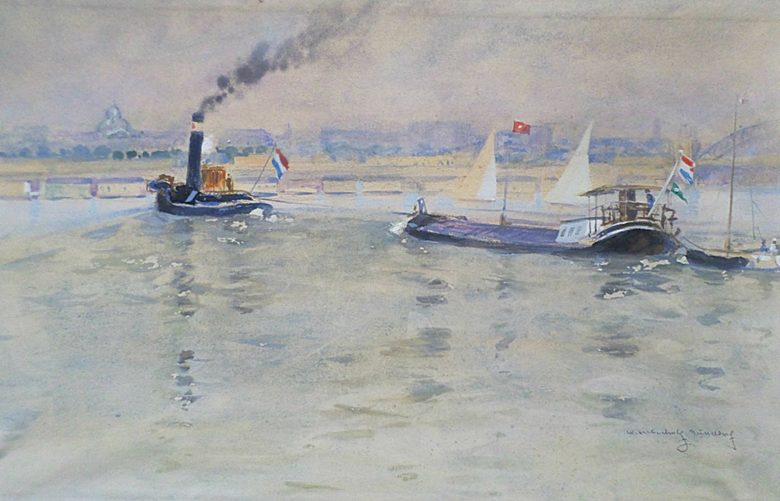 Leuke aquarel van rijnaak achter sleepboot in de Rijn bij Düsseldorf. In goede conditie, maar heeft ingelijst gezeten want resten van tape aan de achterkant. Signatuur niet te ontcijferen (door mij). Datering mogelijk van voor de oorlog want de brug aan de rechterzijde van de afbeelding is in de oorlog volkomen plat gebombardeerd (zie foto’s) en ik weet niet of die herbouwd is.