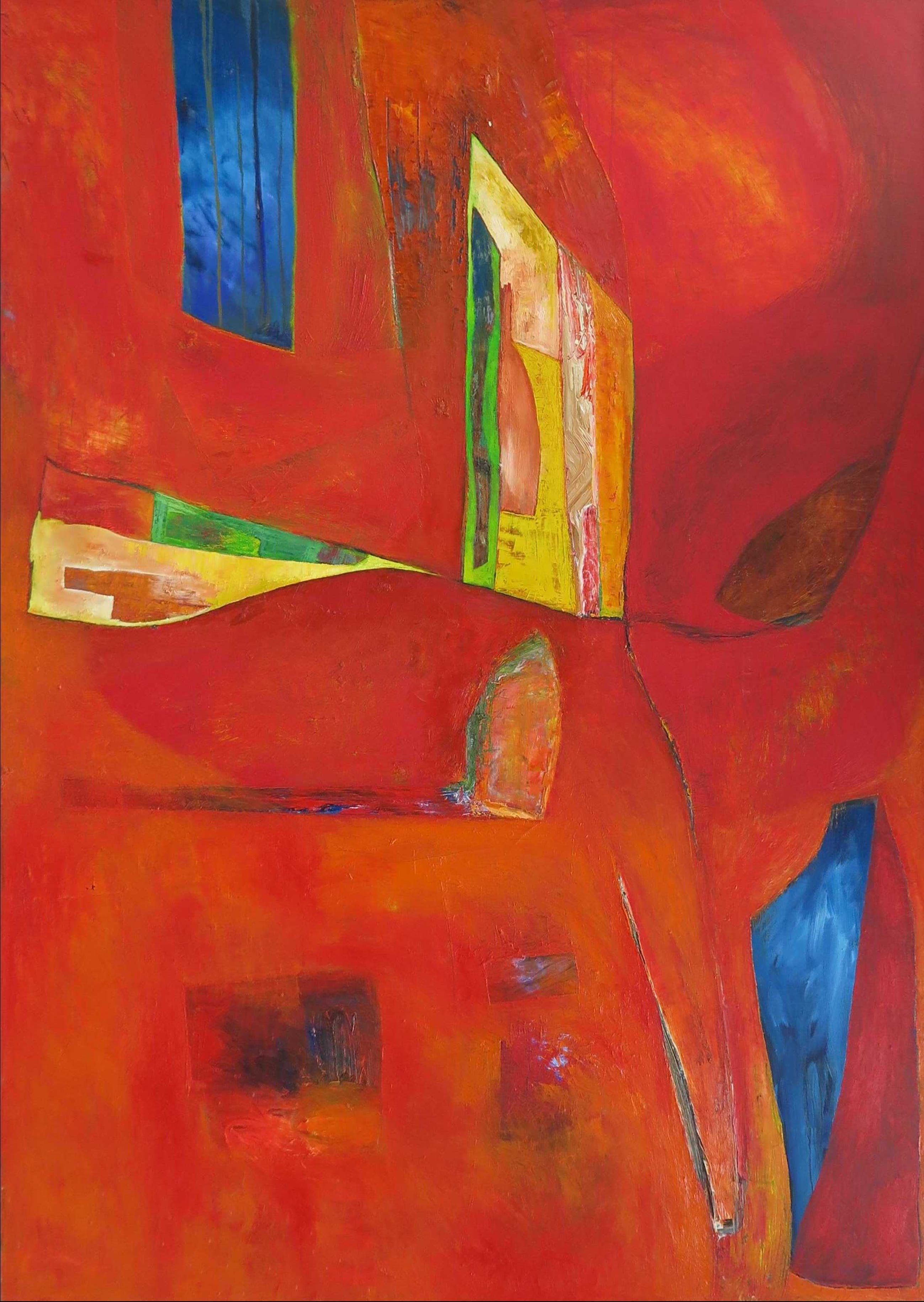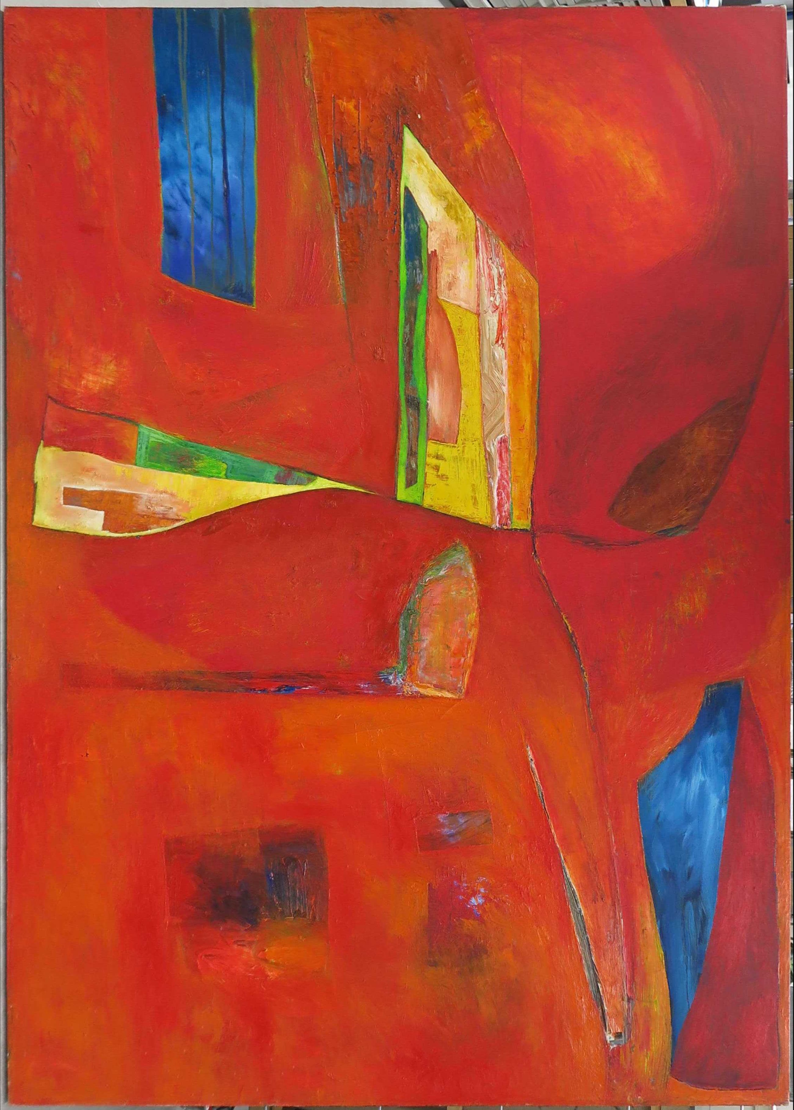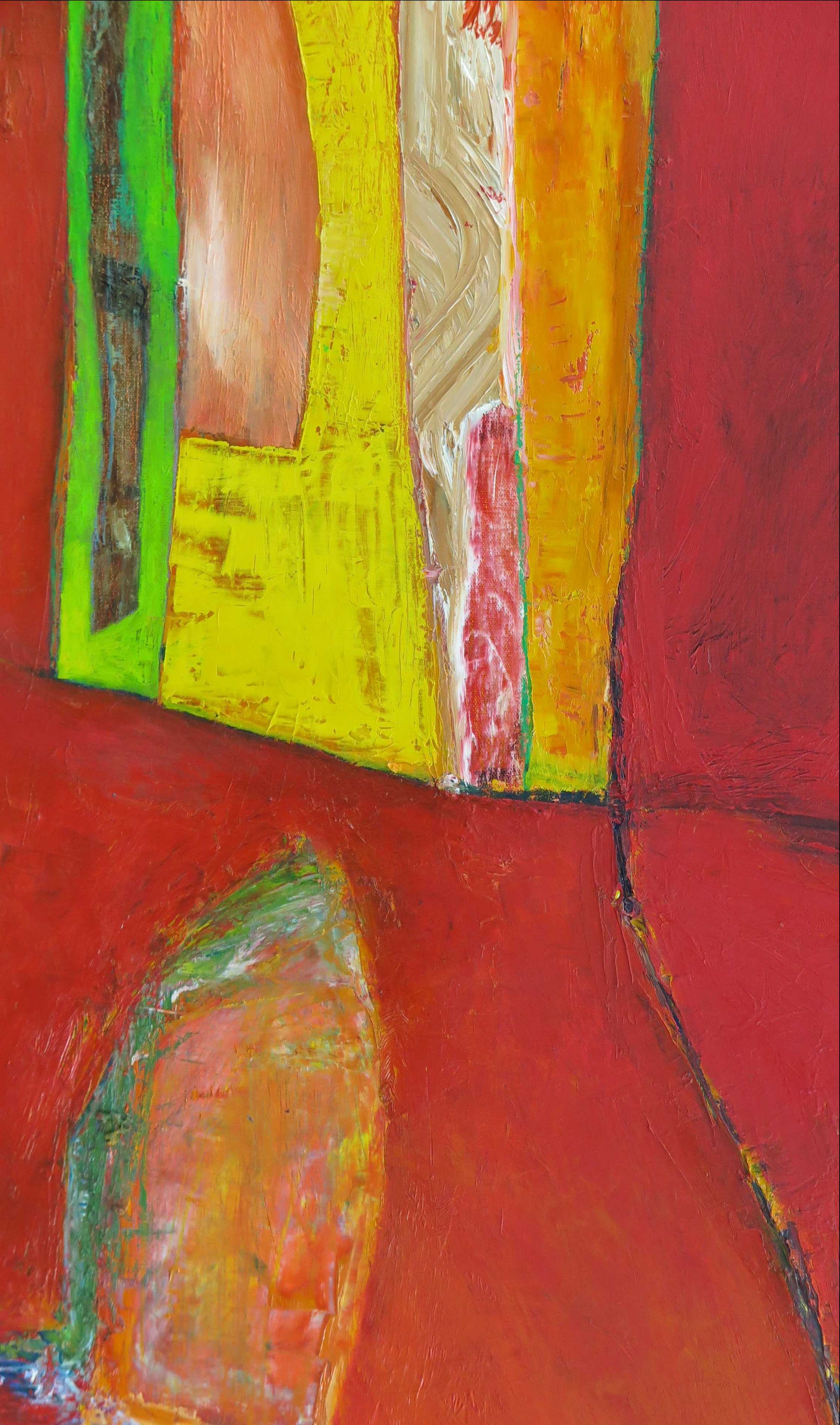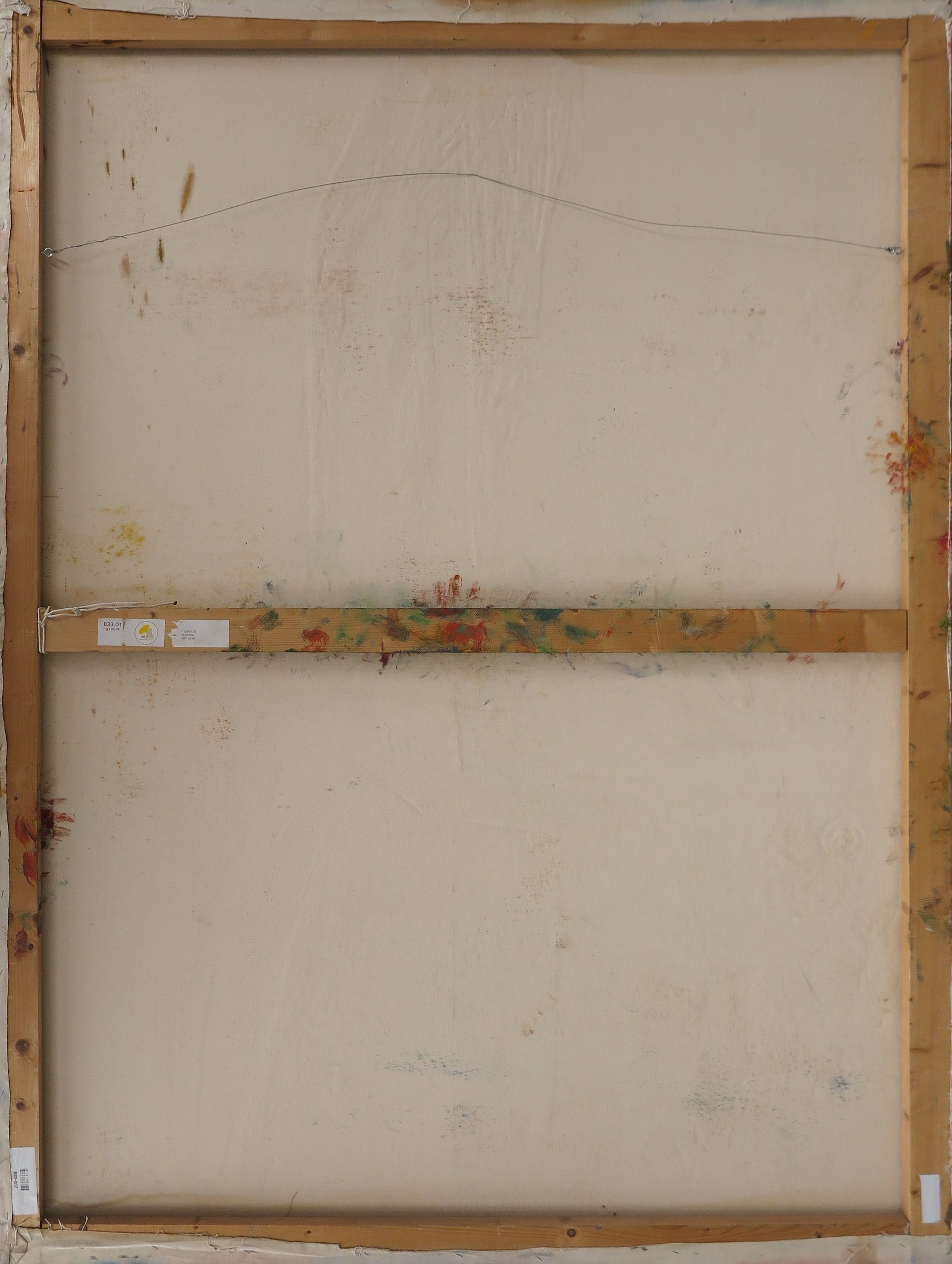 | Over het algemeen in goede staat. Hier en daar wel een paar barstjes in de verf, met name langs de randen/hoeken en in het onderste deel (boven de gele punt). Daar zit ook een wit plekje, dit is een stukje verfverlies waarbij het canvas zichtbaar is. Ook een paar lichte slijtageplekjes langs de randen en hoeken. | |