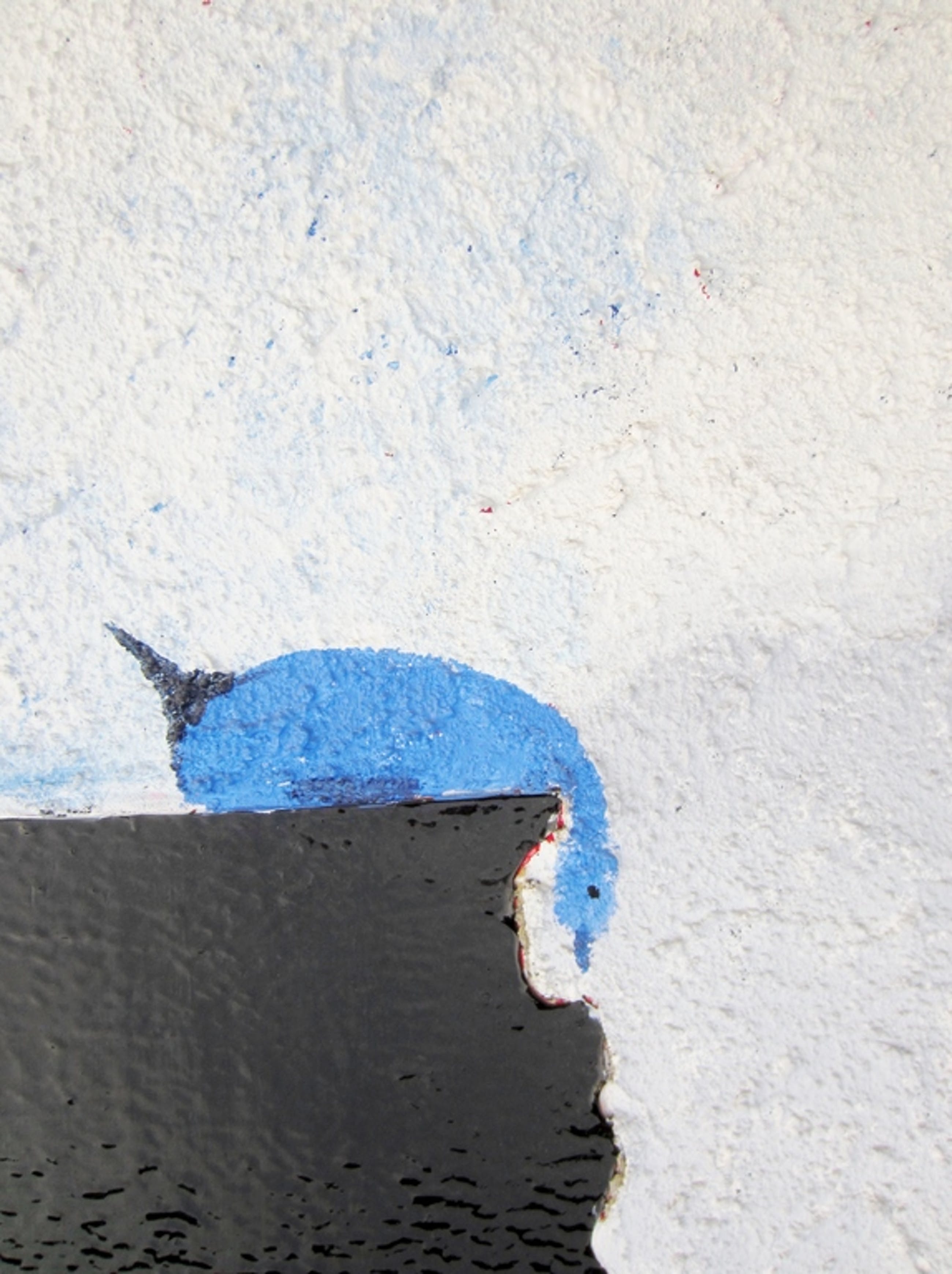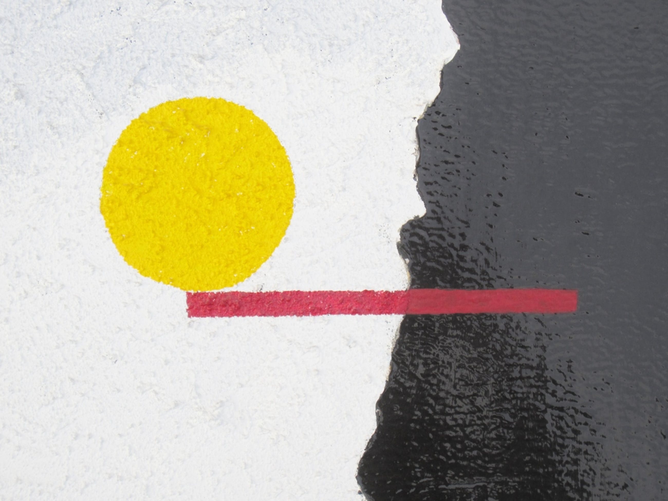In het zijn verschillende structuren aanwezig, het zwarte oppervlak is spiegelglad, de rest van het werk is ruw (materie).