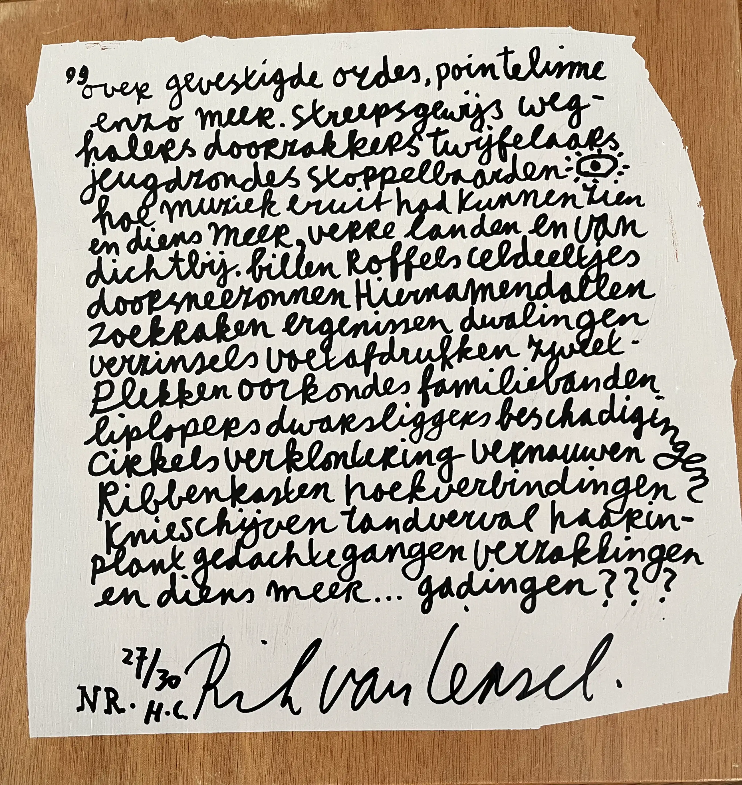 Fraaie luxe uitgave van Kempen Pers uit 1992. Het gesigneerde boek bevat twee, niet gesigneerde, zeefdrukken van 28 x 28 cm. Het boek zit in een eveneens gesigneerde houten slipcase. HC 27/30