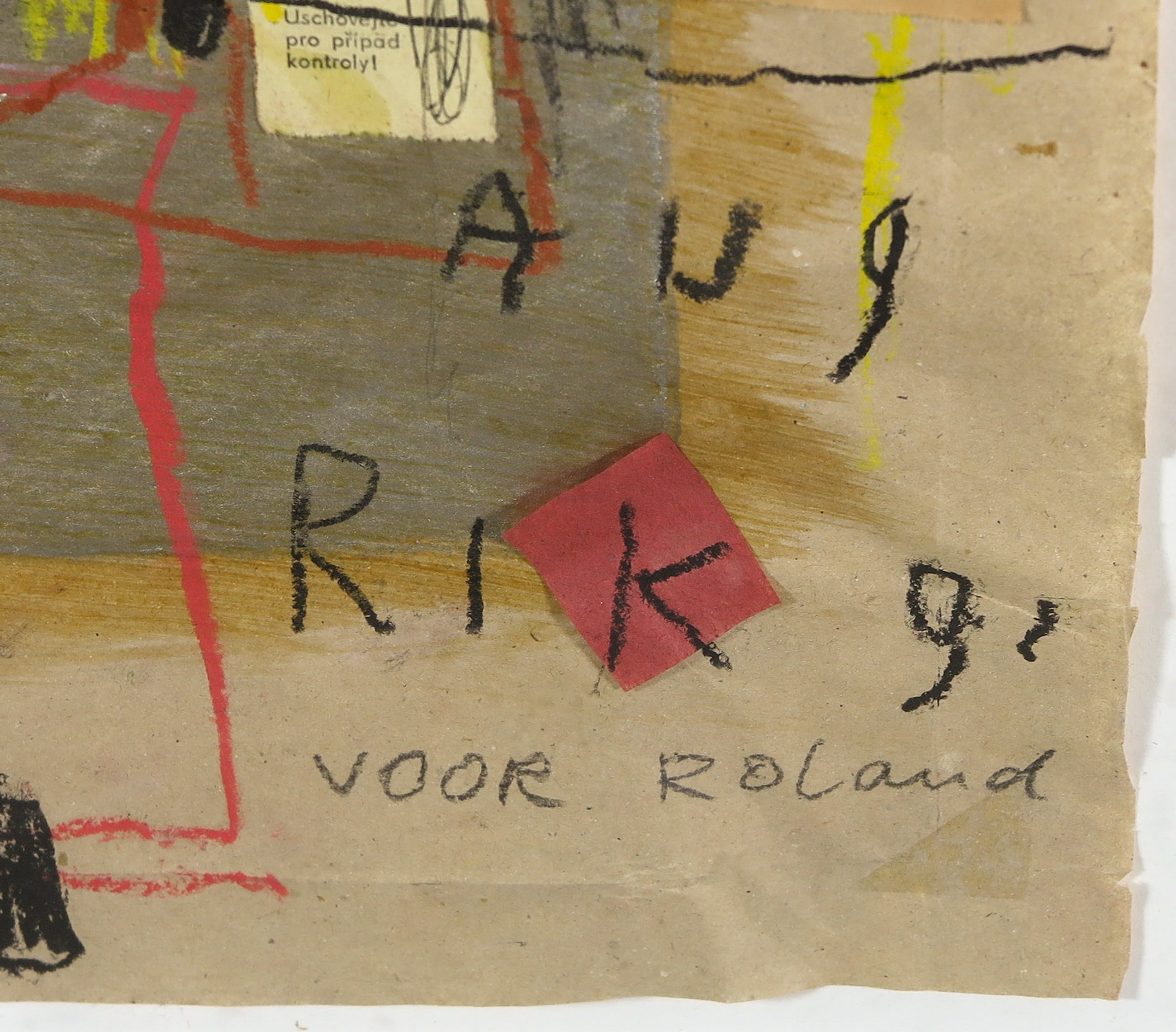 Gemengde techniek op papier, onder andere collage en pastelkrijt.
