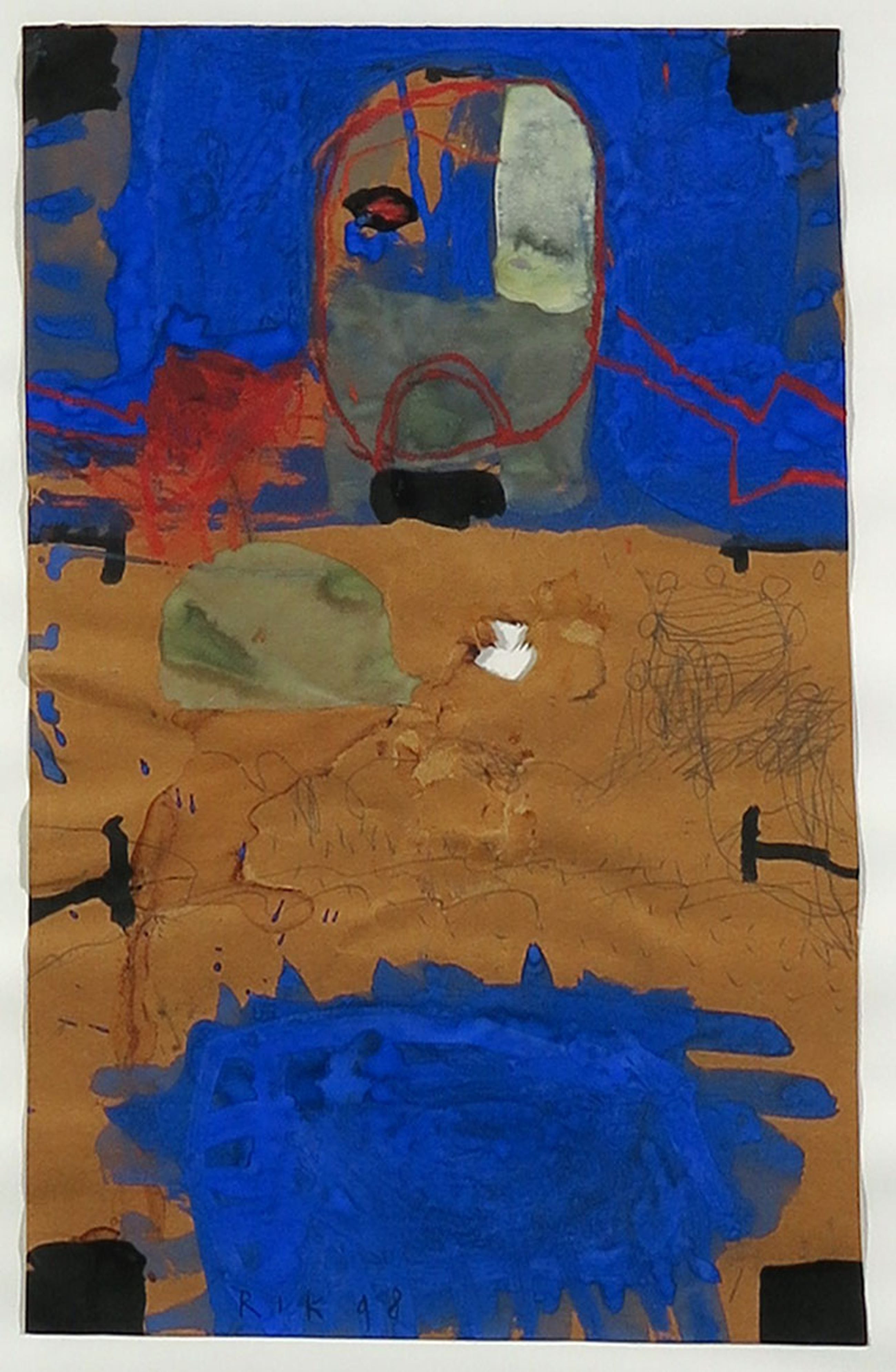 | Het werk zelf is in zeer goede staat (er zit een gat in het blad, maar dit hoort bij het werk). Blad heeft een lichte golving (door de gebruikte techniek). Achter het glas zit vrij veel stof/vuiligheid. Er zit een sterke golving in het achterblad. | |