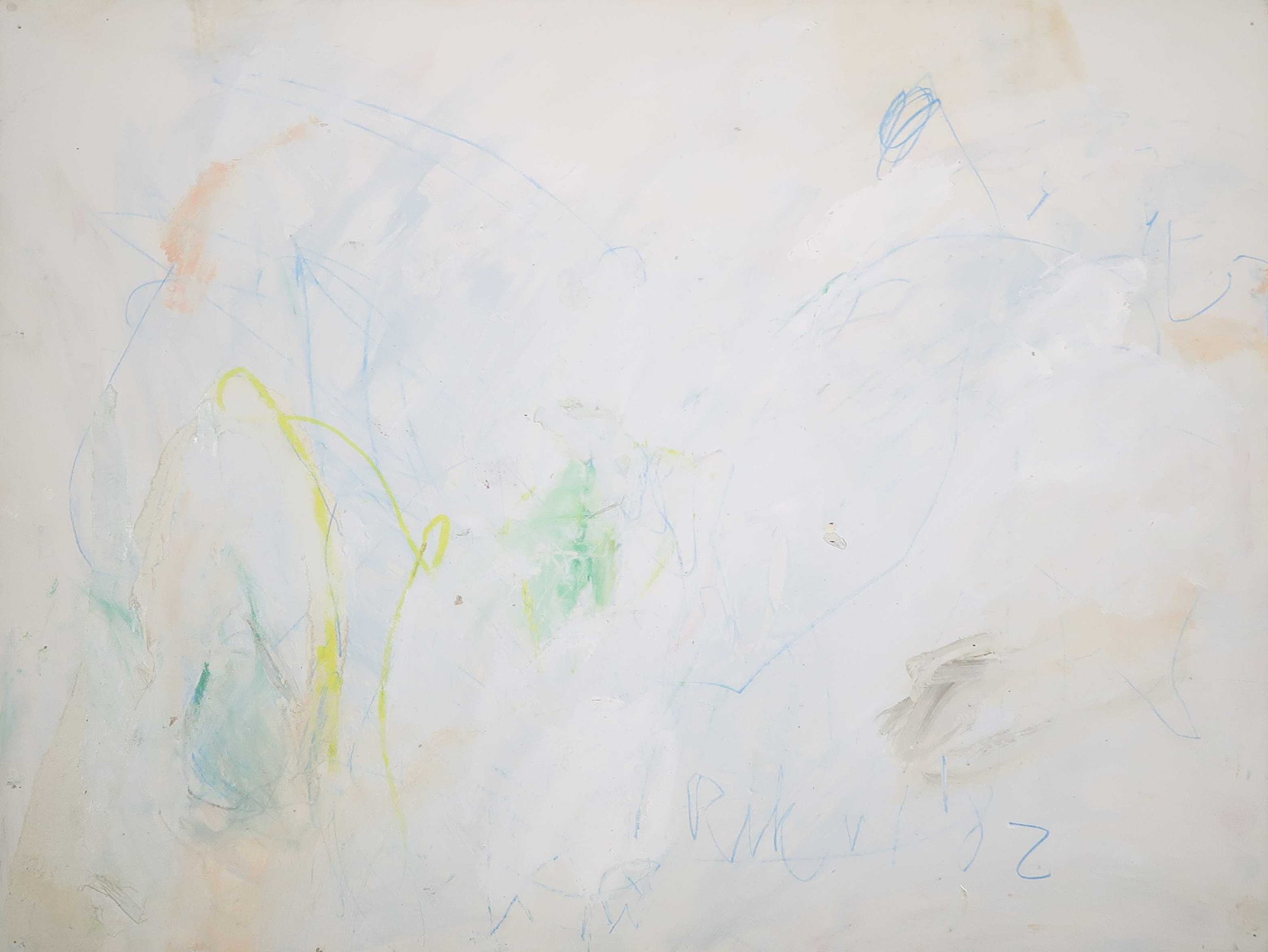 Het werk heeft enkele kleine beschadigingen, waaronder punaisegaatjes in de hoeken. Door de gebruikte techniek (verf en collage) doet het werk beschadigd aan, maar dit hoort bij het werk. | |||
