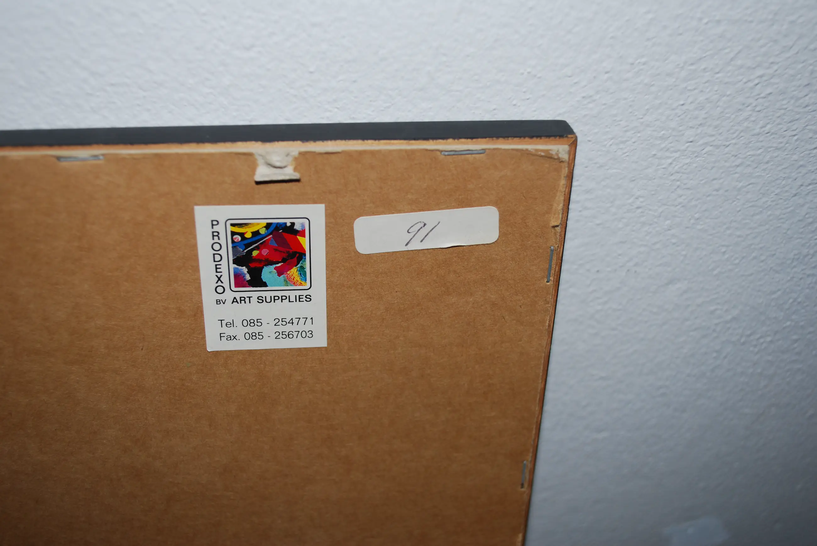 Achter glas, in een zwarte houten lijst met mooi smal profiel.