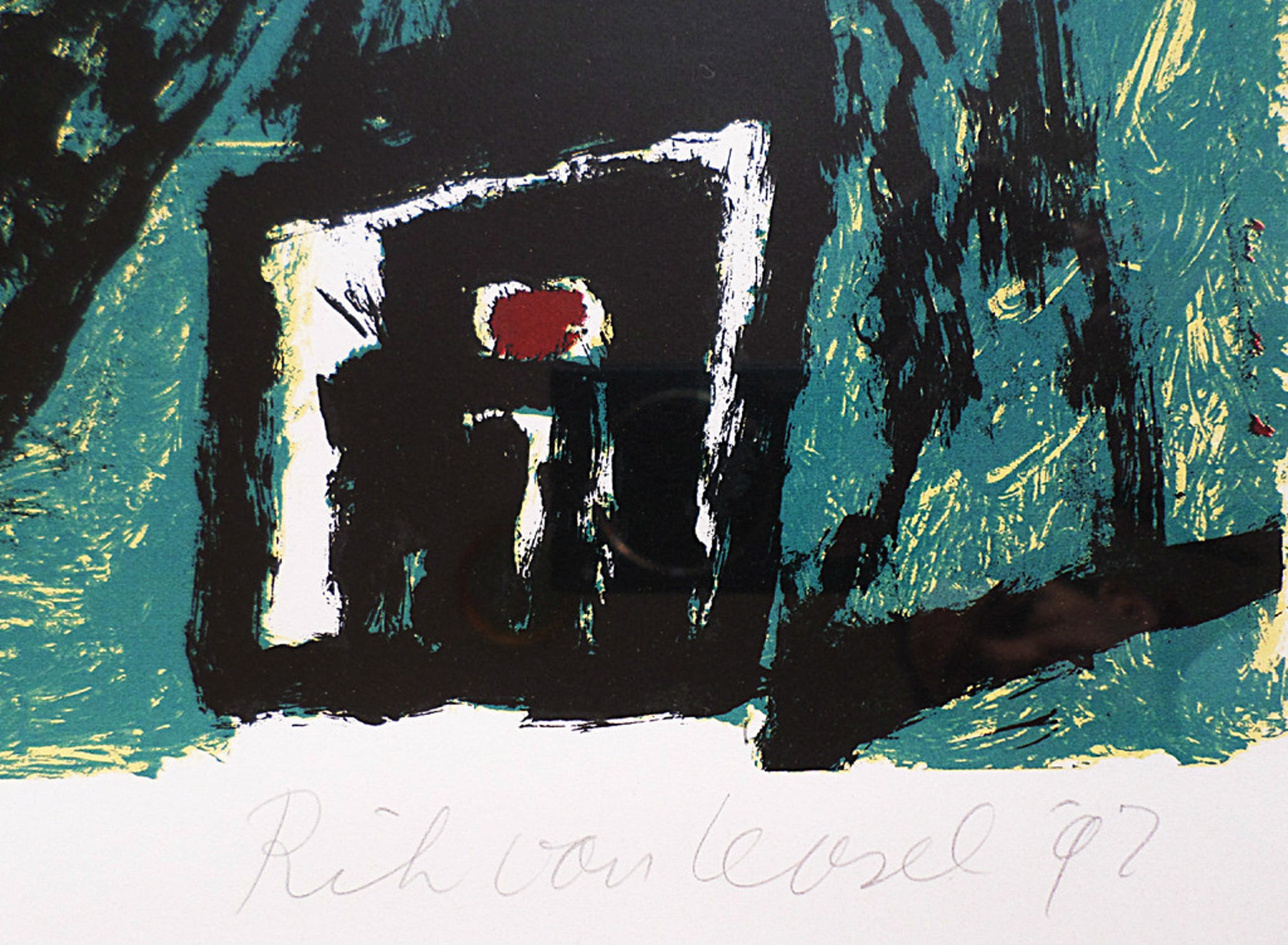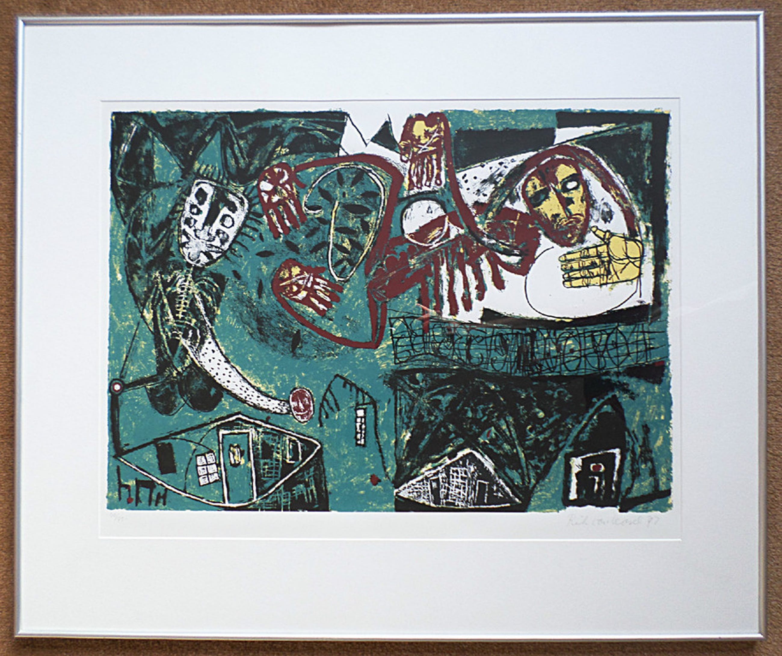 Mooie zeefdruk van Rik van Iersel in strakke aluminium lijst, achter glas en passe-partout. Handgesigneerd, gedateerd (1992) en genummerd (40 uit een oplage van 75 stuks. In zeer goede conditie.