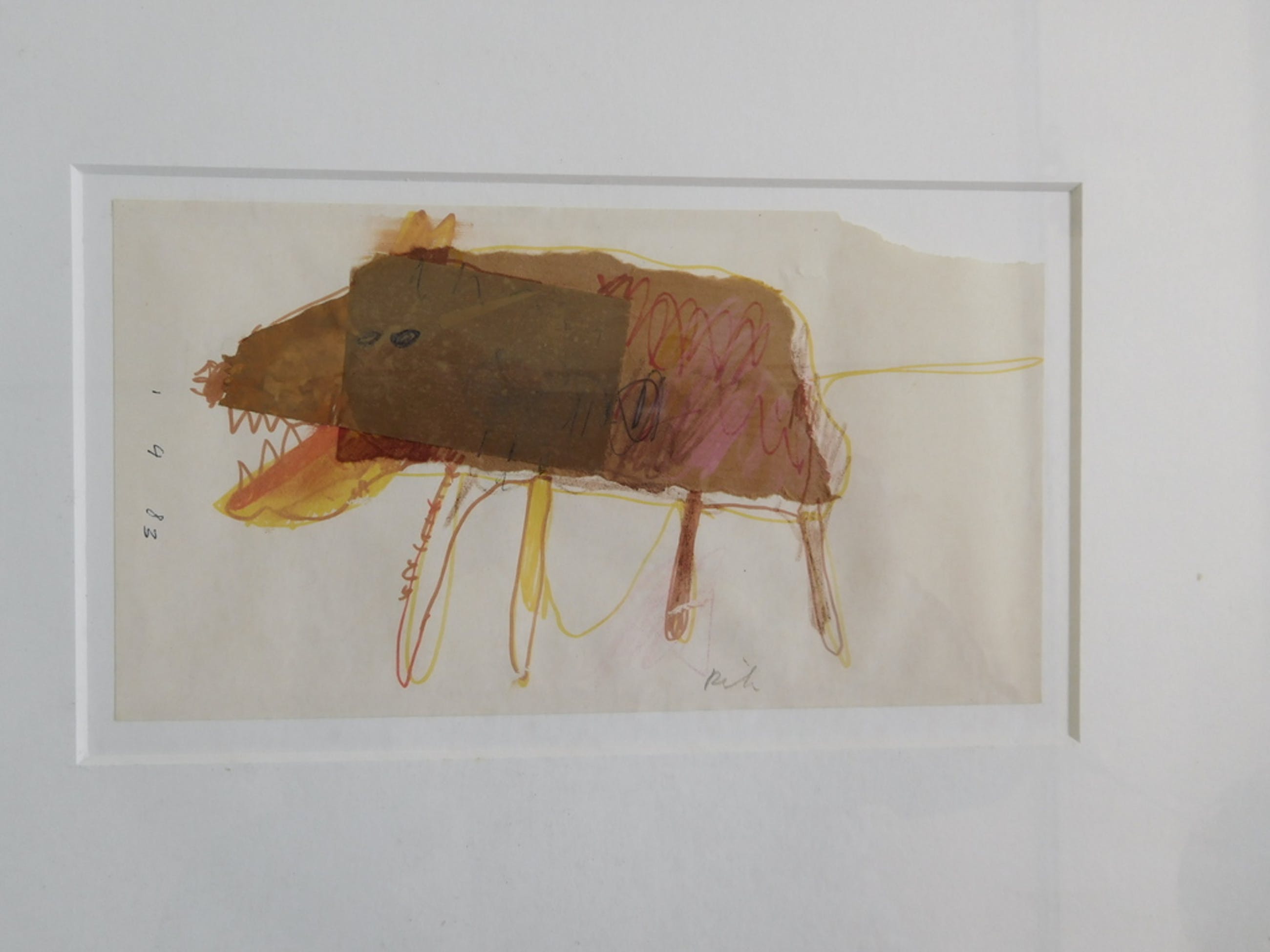 Origineel werk van Rik van Iersel uit 1983. Deze tekening met collage is ingelijst in een zwart houten laklijstje dat aan vervanging toe is. (Kost ongeveer 20,00) van 34 x 42 cm. Het werk zelf meet 11 x 20 cm.