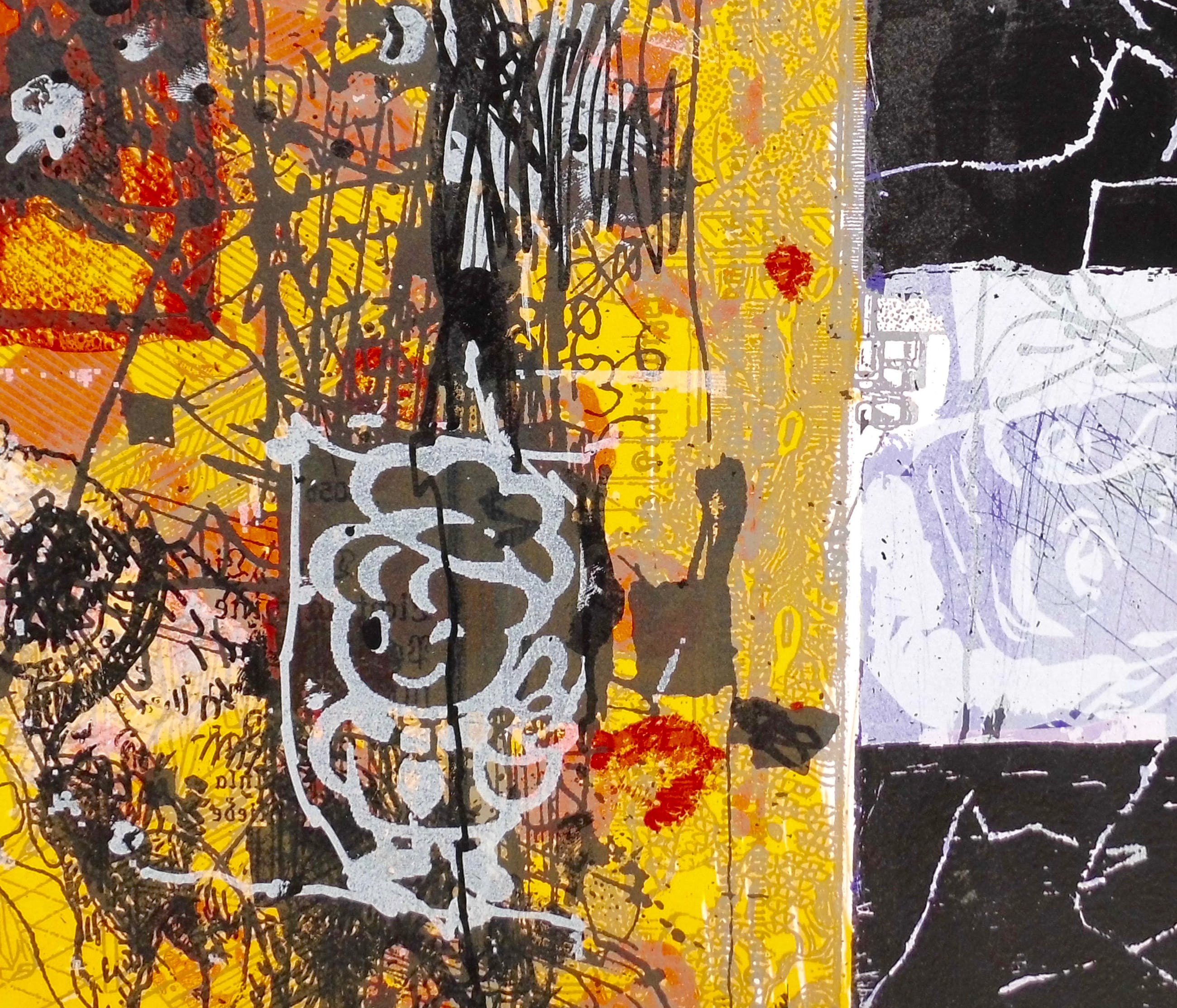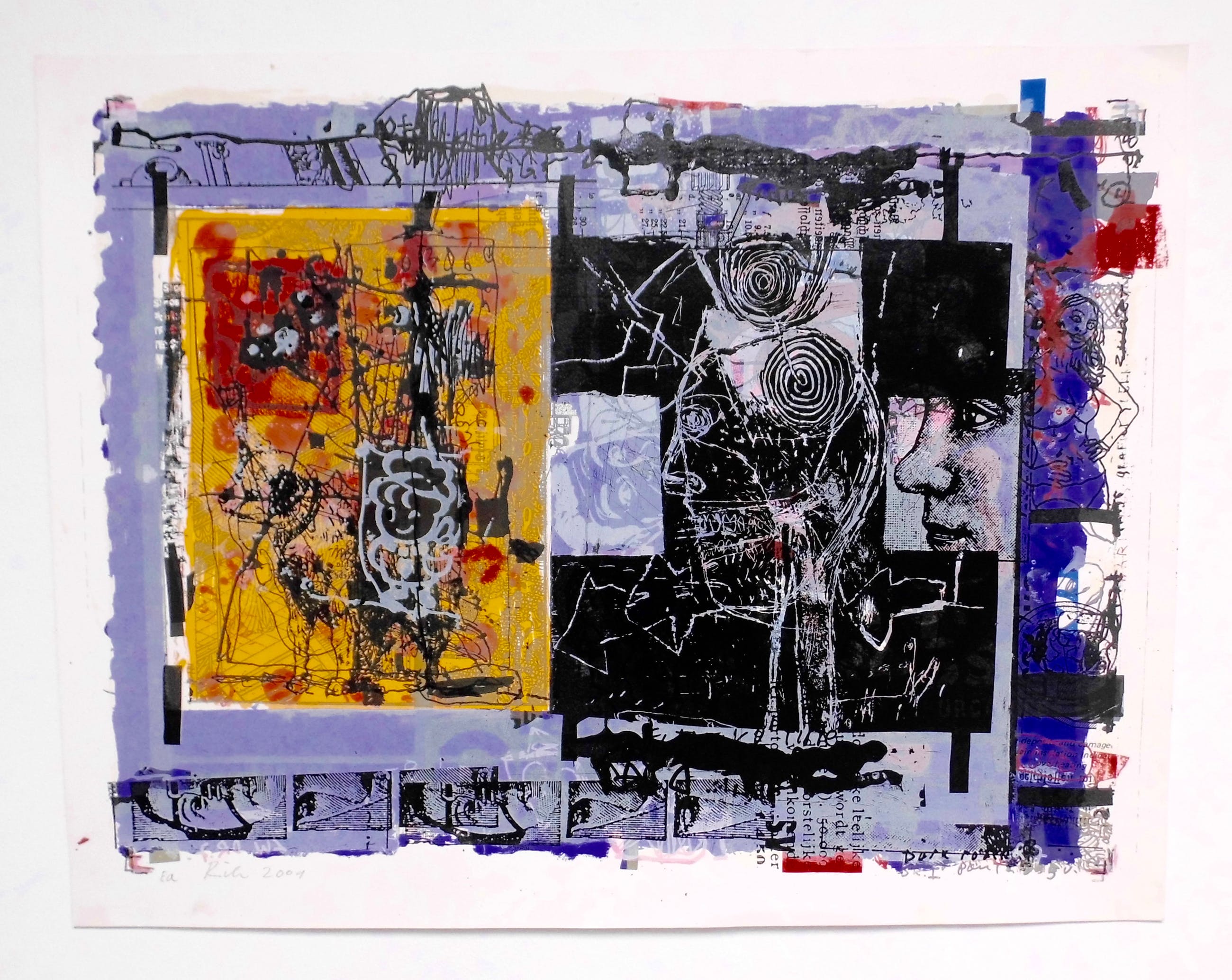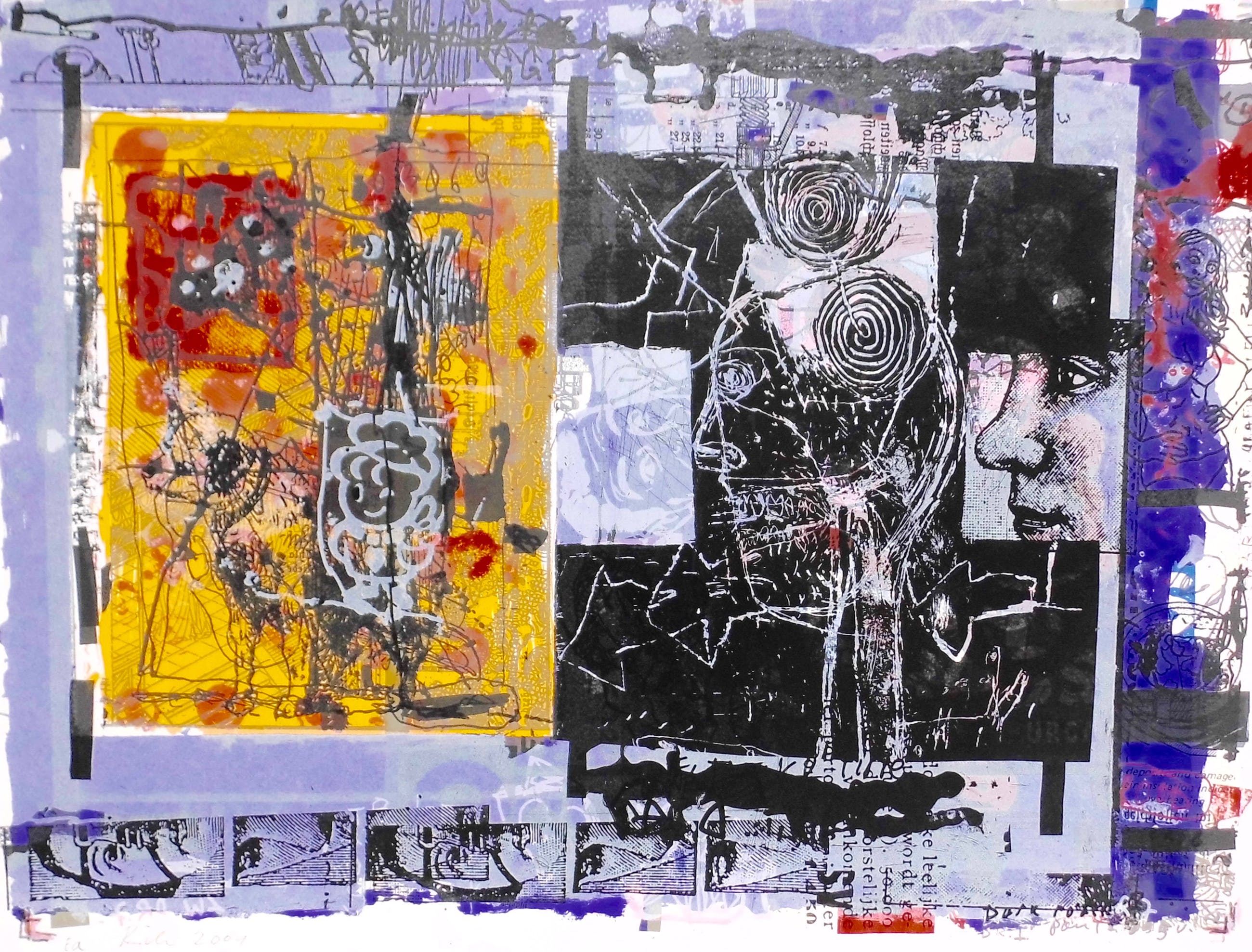 Meerkleurige prent in een grafische "collage"-techniek waarin figuren, gezichten, etc. zijn verwerkt. Mooie prent waarnaar je lang kunt kijken en steeds nieuwe dingen ontdekt!