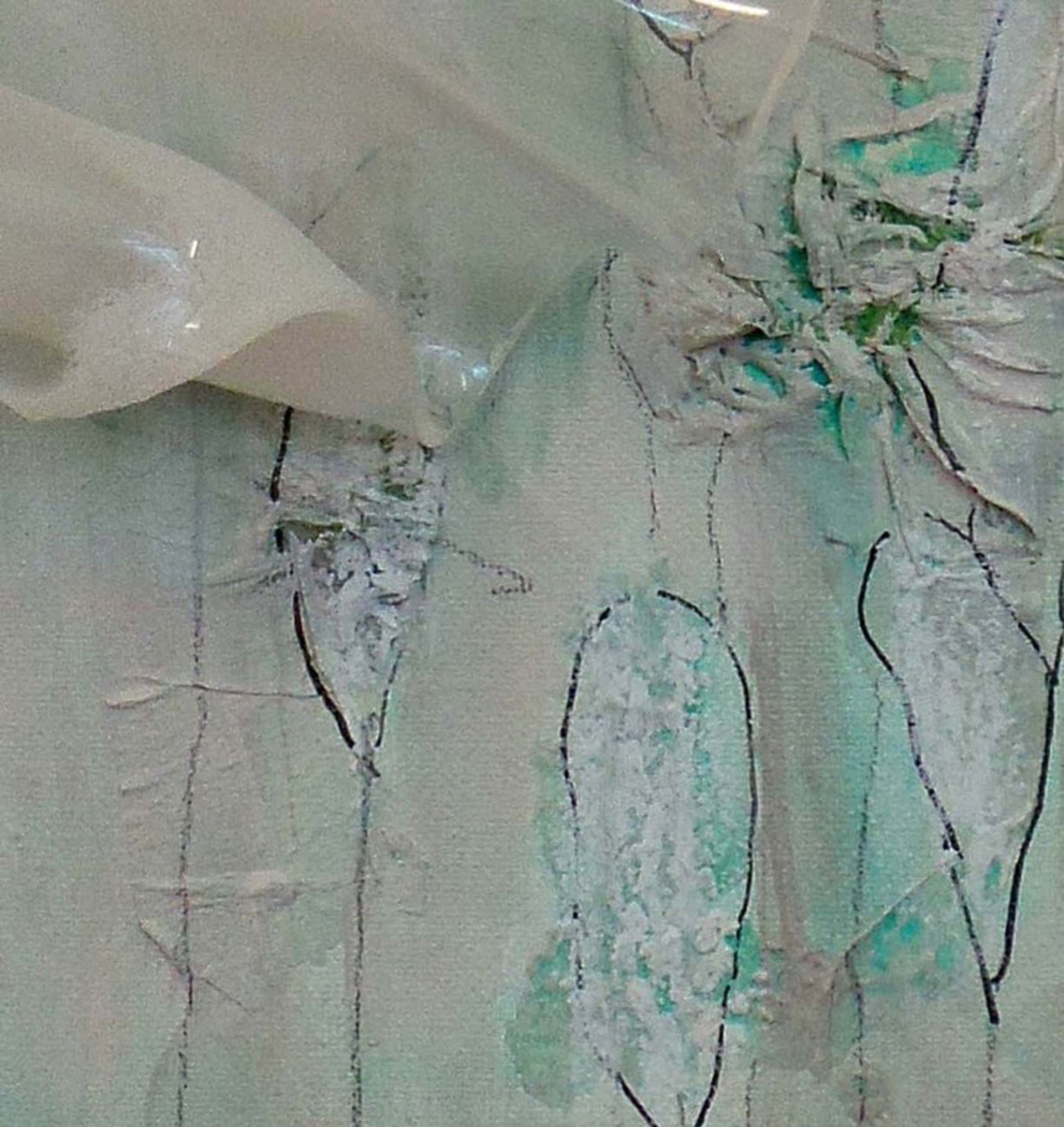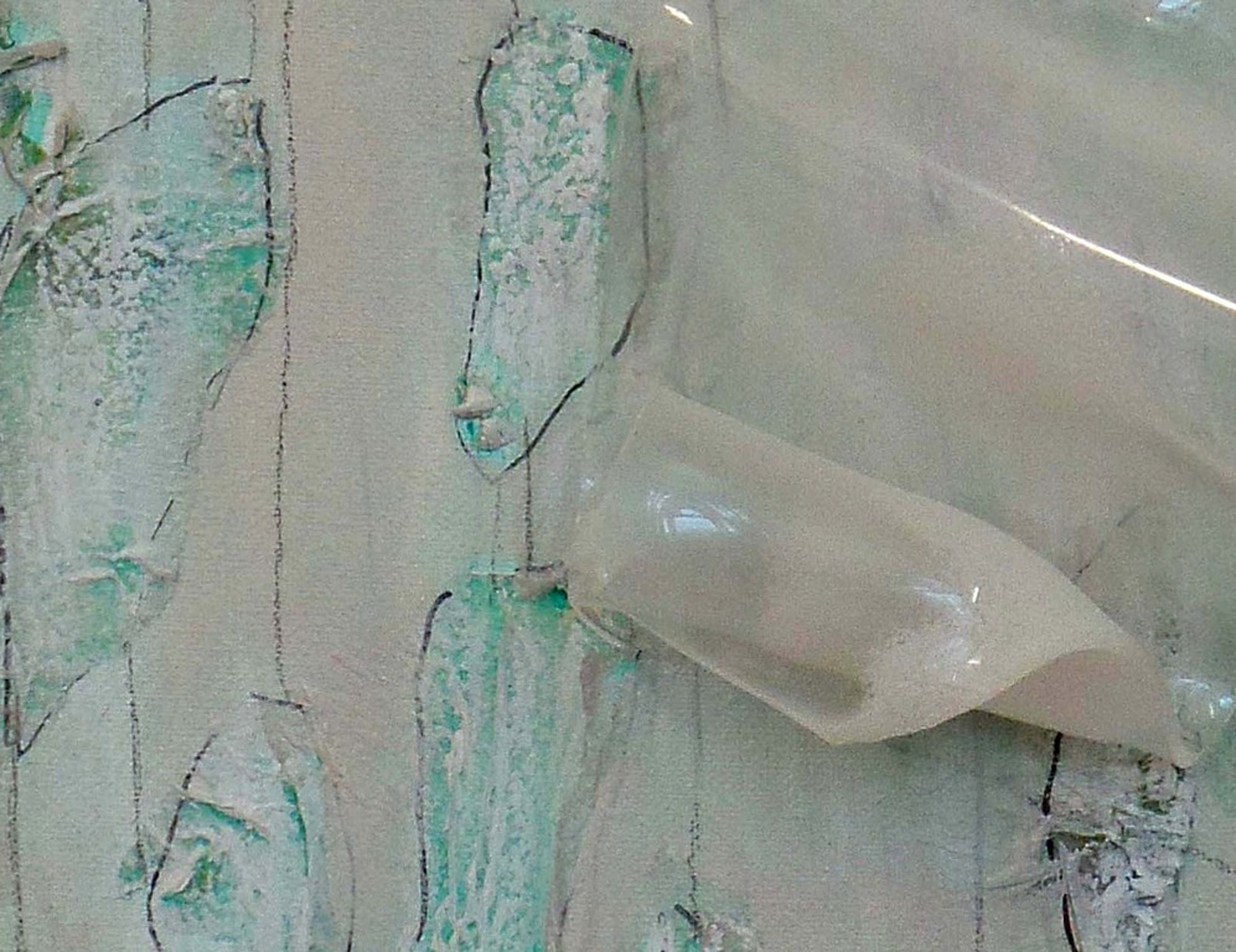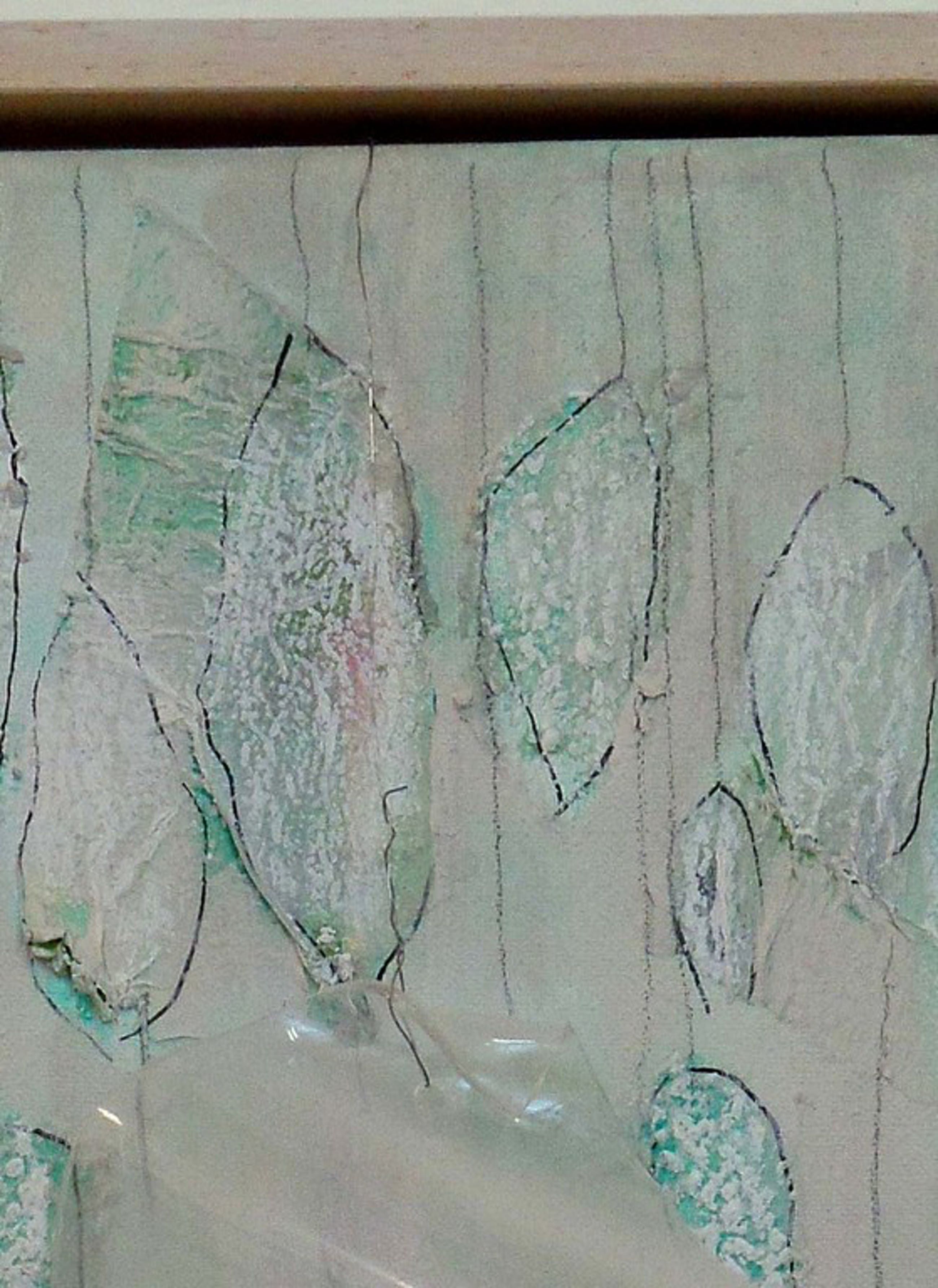 Bij deze serie LICHTSPEL is dat de  collagetechniek (papier,acryl,krijt,inkt) op doek met hangend er voor: gevormd plexiglas aan dun ijzerdraad.