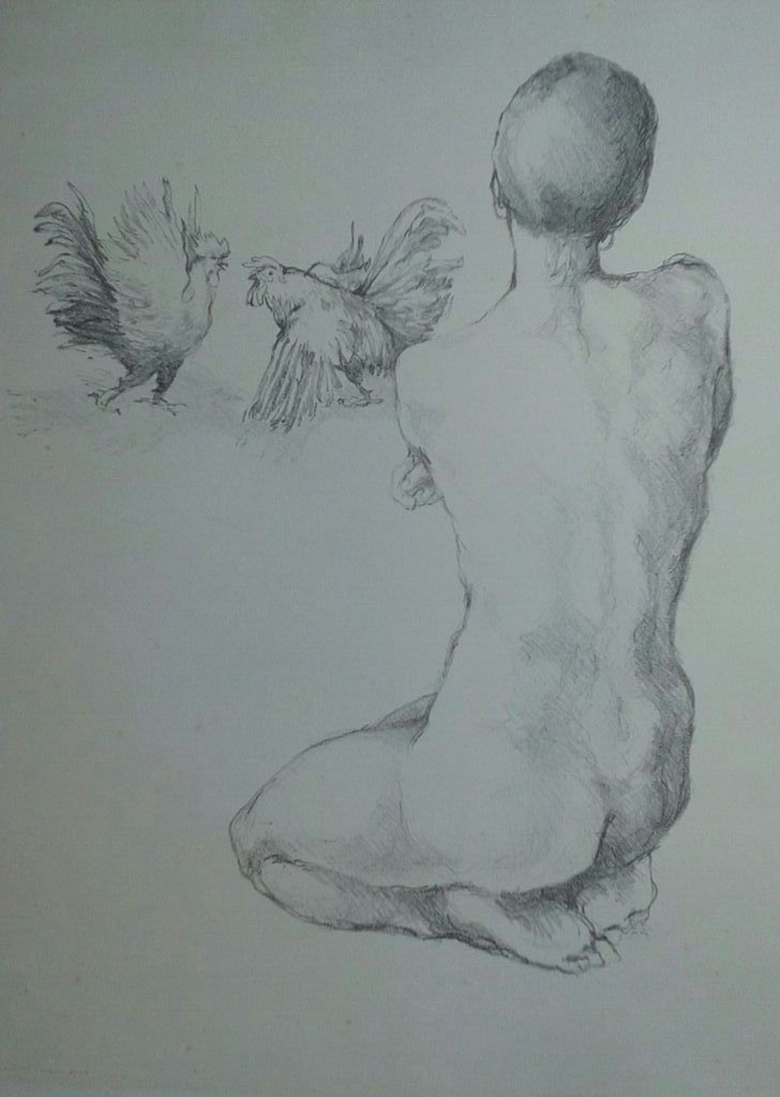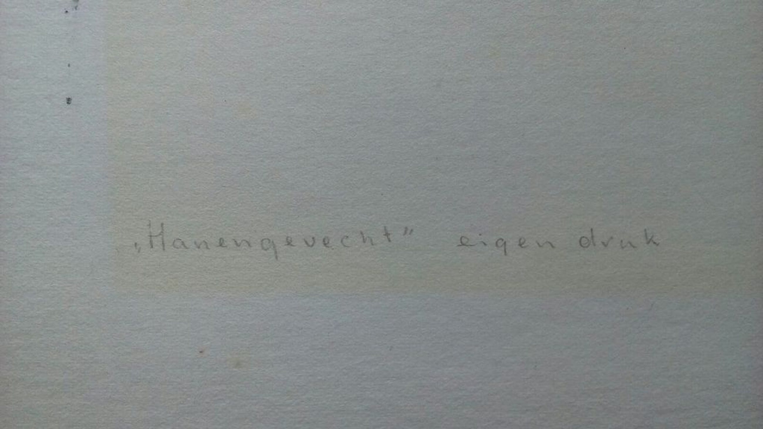 In potlood getiteld en gesigneerd: "Hanengevecht" Riky Schellart v Deursen.