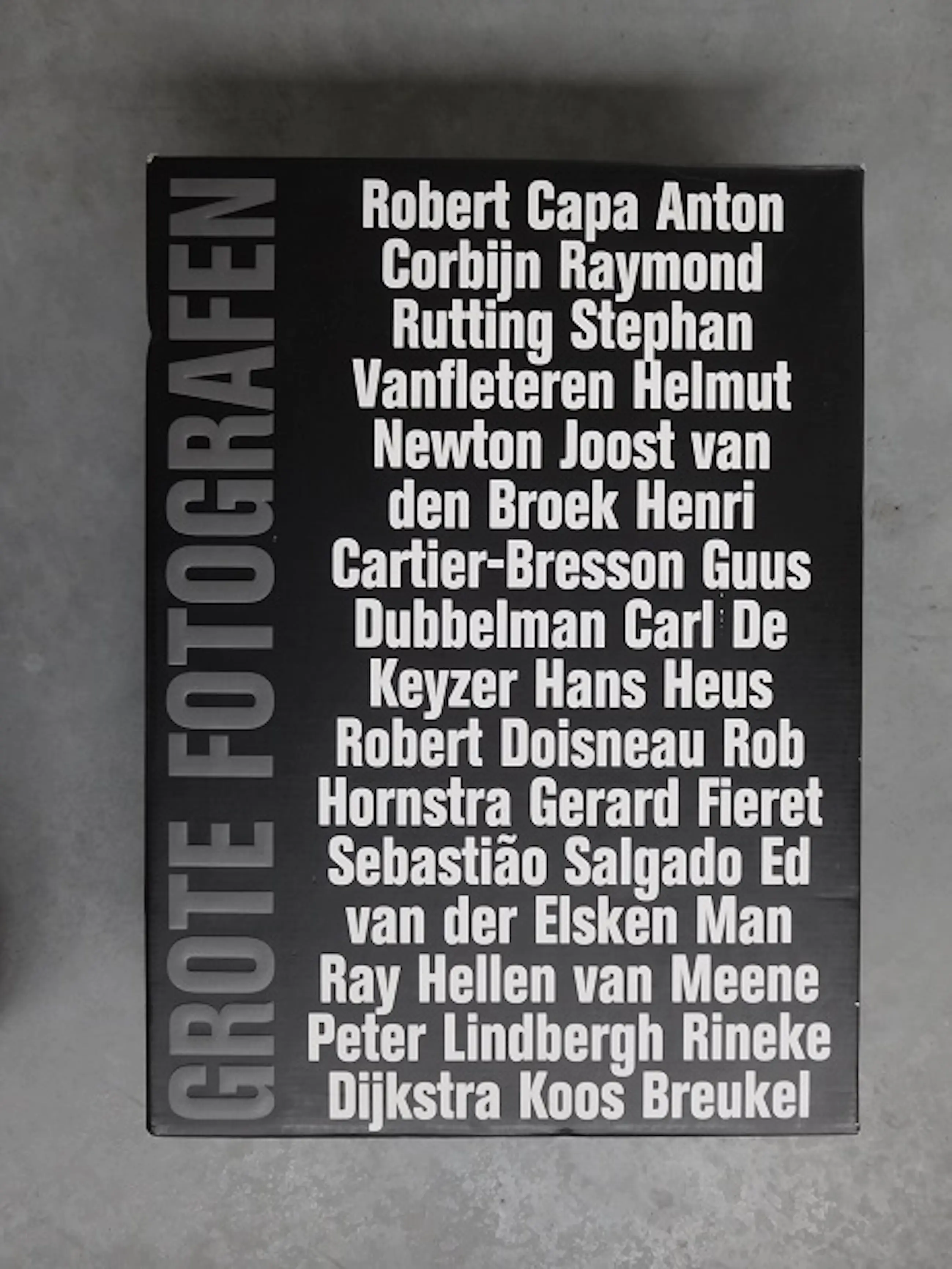 Indrukwekkende 20-delige "Grote Fotografen Collectie" (Uitgave Volkskrant 2011) die bestaat uit verzameld werk van 20 top fotografen uit binnen- en buitenland. De complete collectie van 20 afleveringen wordt geleverd in een luxe bewaarbox. (Koffie tafel formaat van 45 x 33 x 11 cm) Fotografen: Rieneke Dijkstra, Gerard Fieret, Carl De Keyzer, Peter Lindbergh, Man Ray, Robert Doisneau, Henri Cartier-Bresson, Ed van der Elsken, Helmut Newton, Joost van den Broek, Robert Capa, Hellen van Meene, Guus Dubbelman, Hans Heus, Koos Breukel, Stephan Vanfleteren, Anton Corbijn, Raymond Rutting, Rob Hornstra, Sebastião Salgado,De aparte fotoboeken zijn in nieuwstaat. De box heeft wat gebruikssporen. Wordt aangetekend verstuurd.