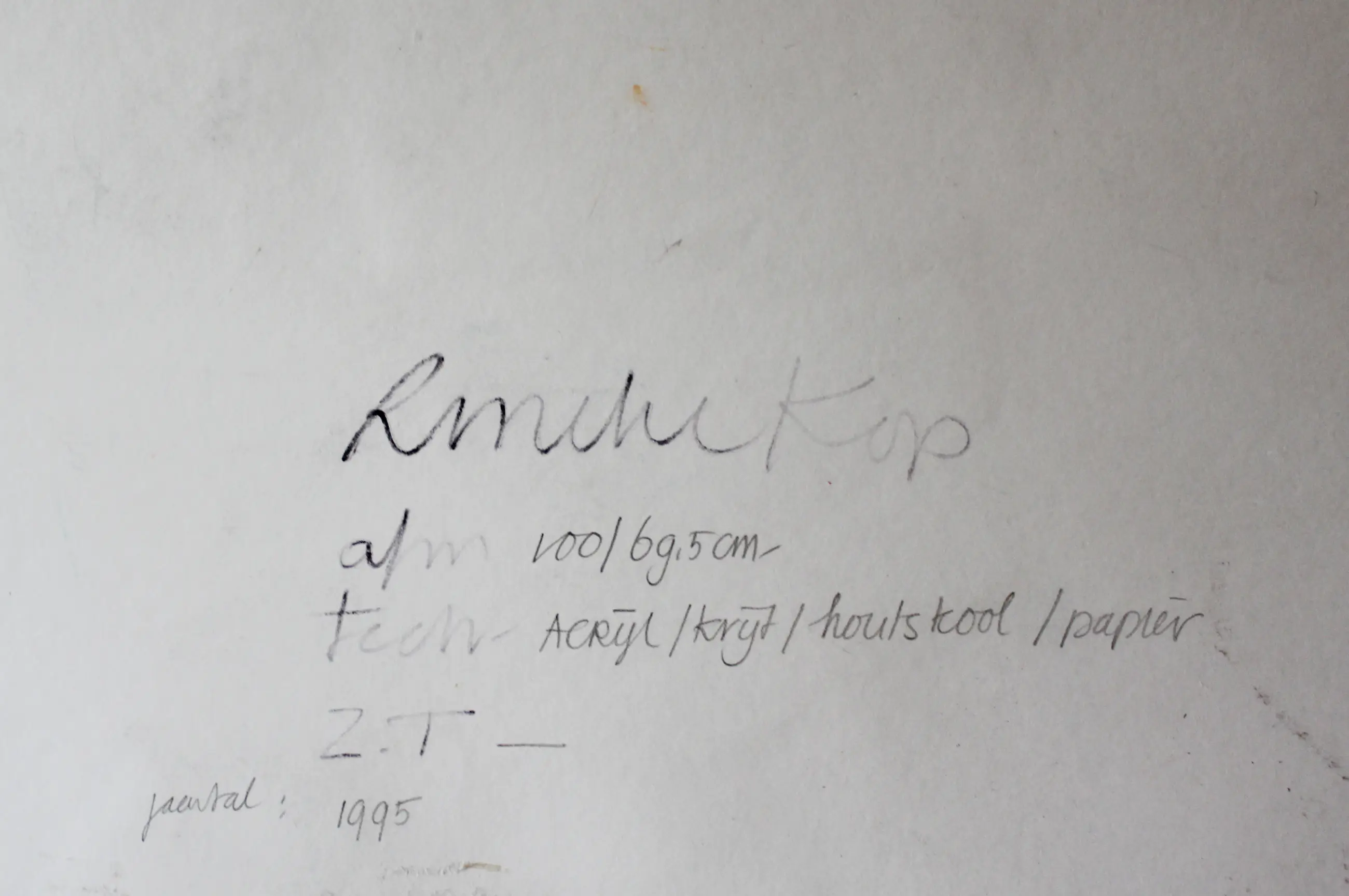 Werk uit 1995. Acryl, houtskool, krijt en inkt op zwaar papier. Bladmaat: 100 x 70 cm. Niet in lijst of passepartout. Wordt verzonden in een koker.