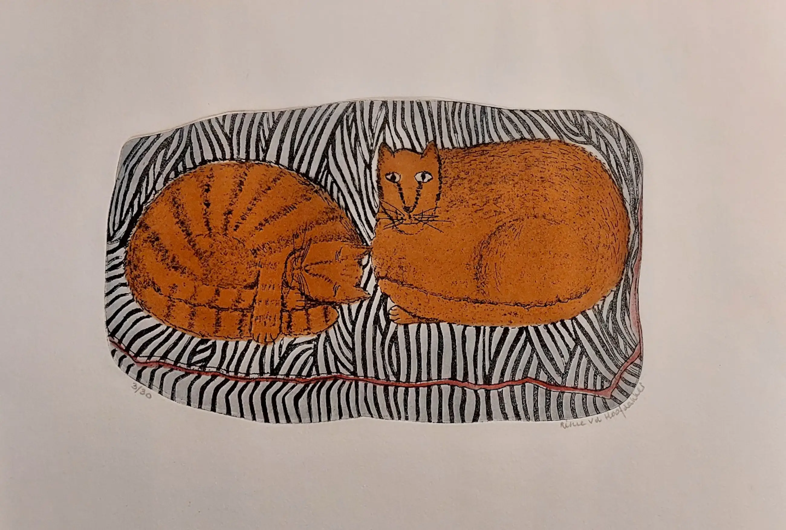 Mooie kleurets met de fraaie titel : twee poezen op een sofa