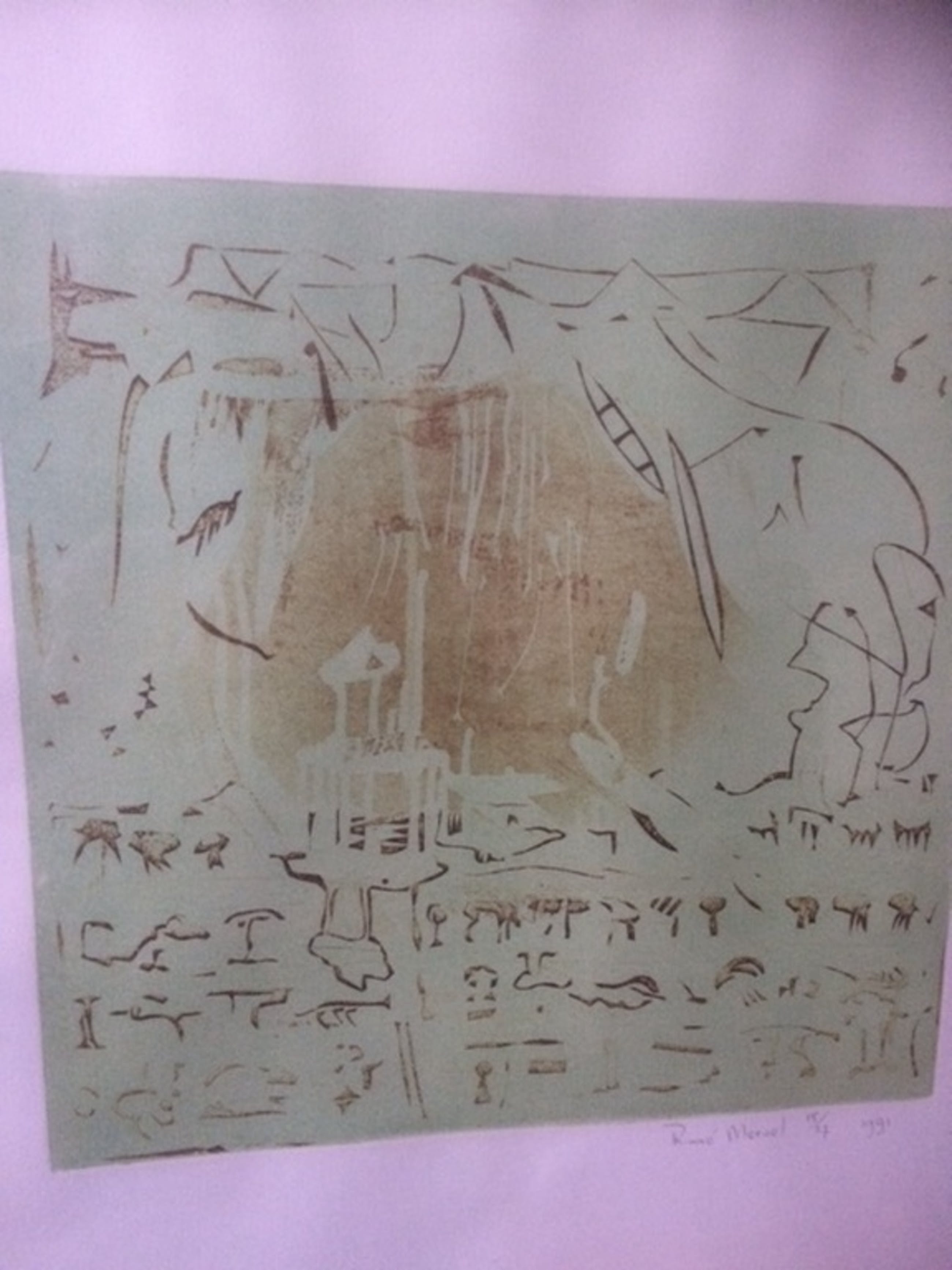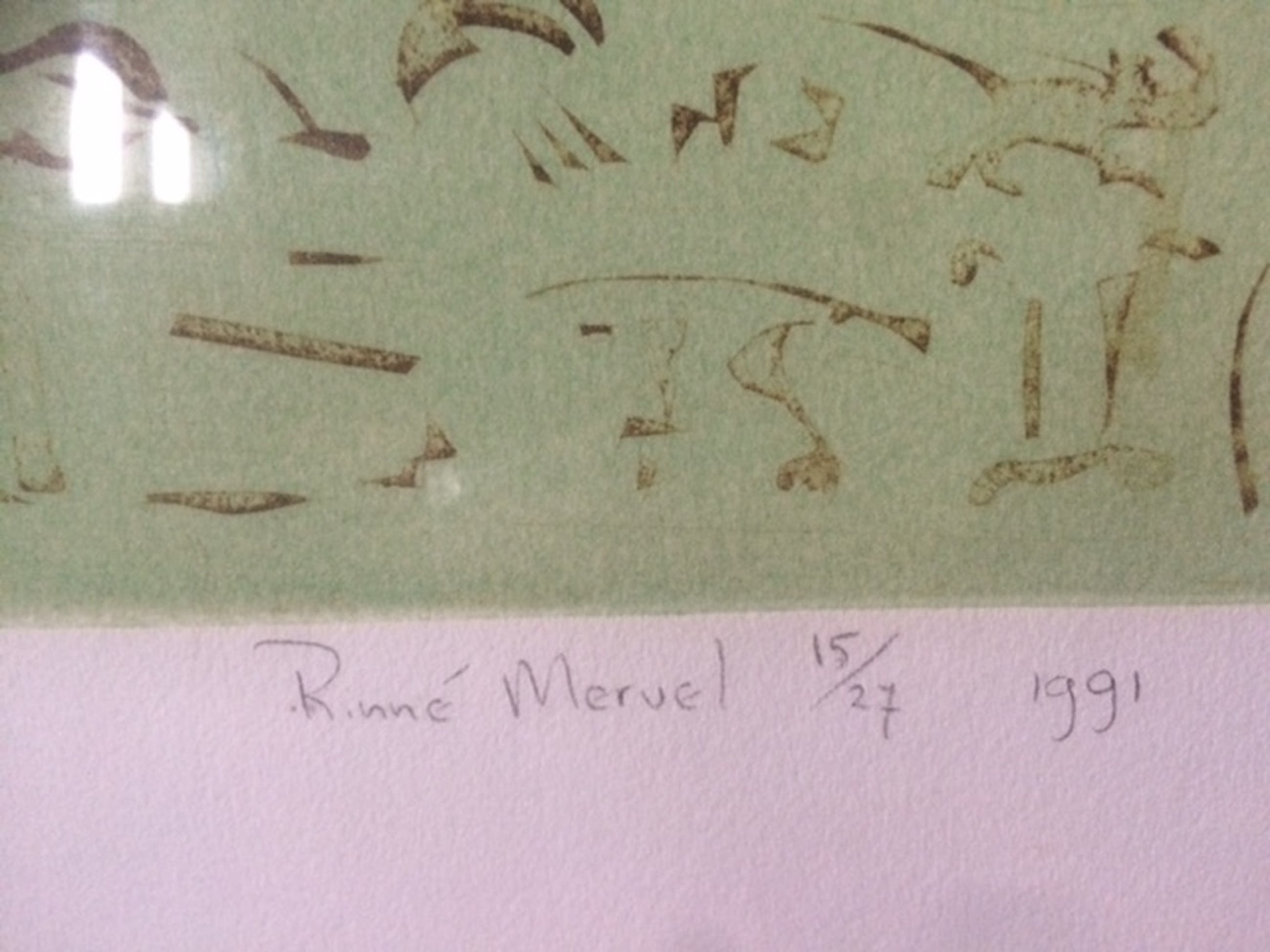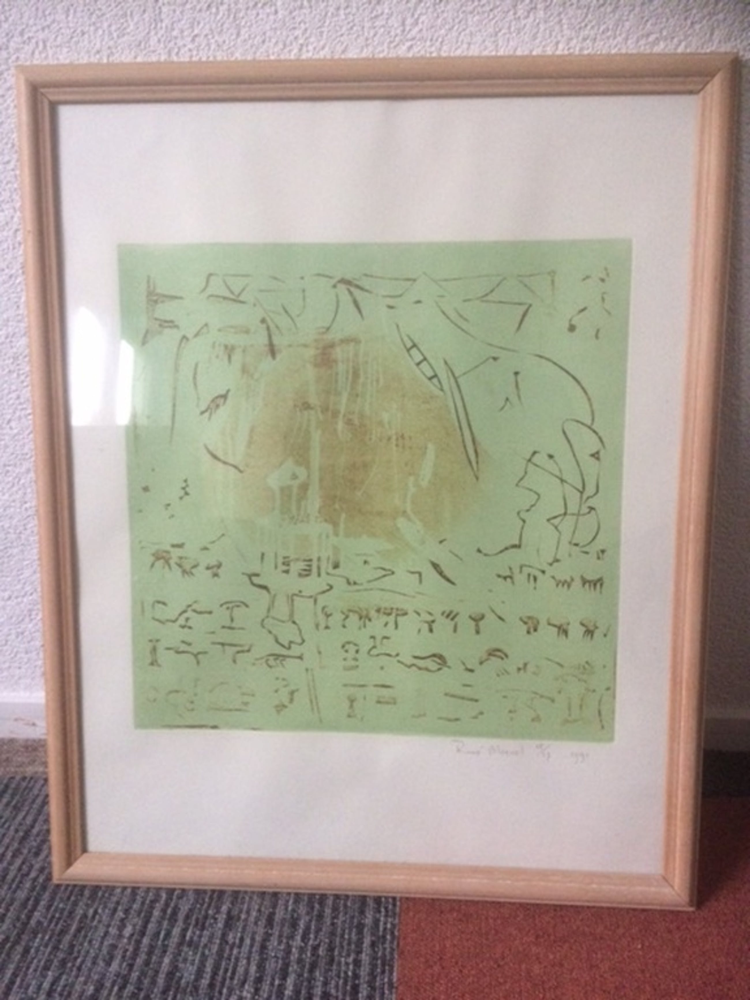 De afmetingen zijn 53x42cm en het is ingelijst. De afdruk zelf is 32x32cm en in goede staat. het is nummer 15 uit een oplage van 27uit het jaar 1991.