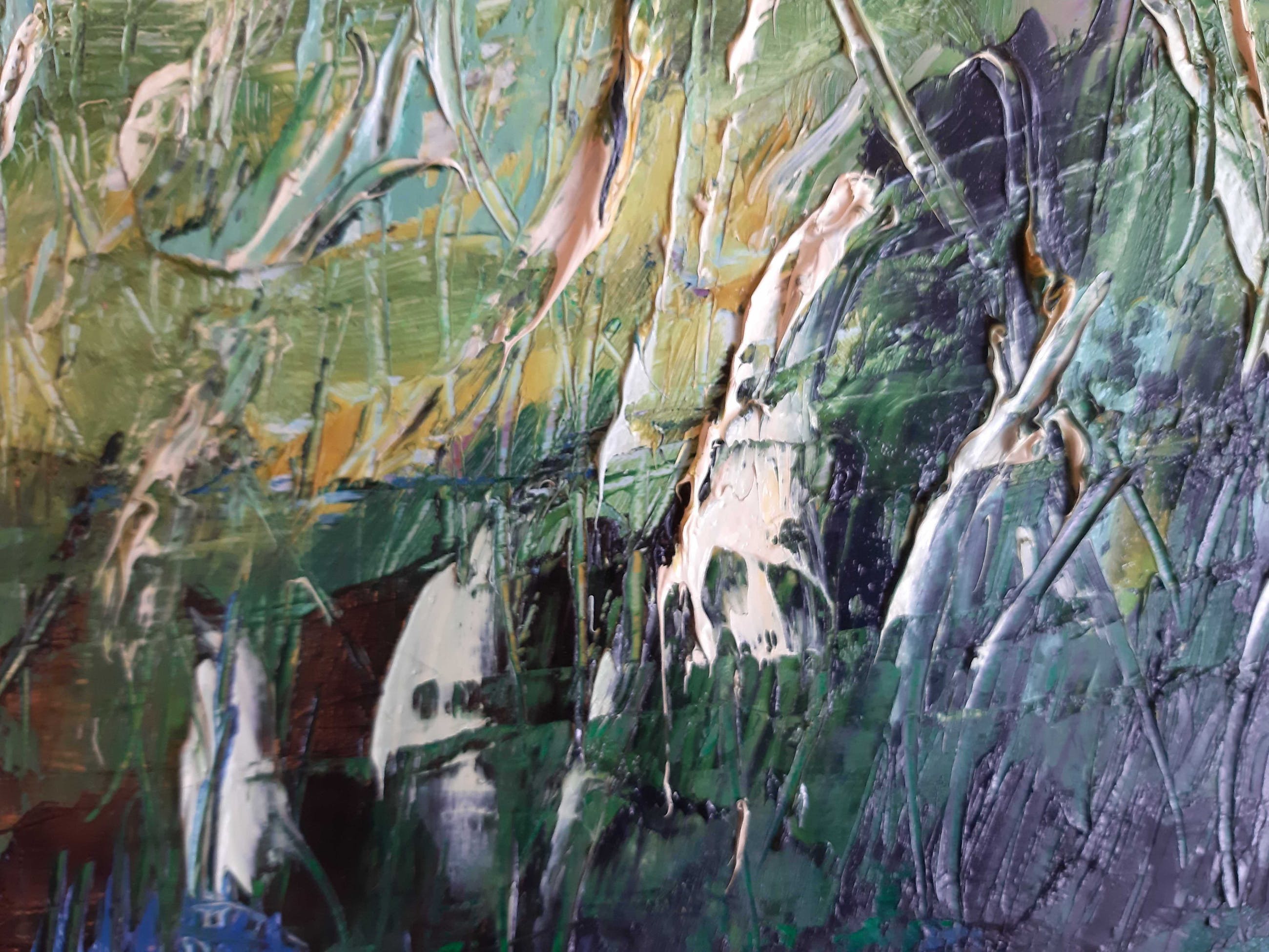 Fraai karakteristiek werk van deze Rotterdamse kunstenaar - ongetiteld: landschap met water. Hij heeft kwistig in de dikke verf geboetseerd, zoals altijd. Afmeting 50 x 70 cm over het canvas gemeten. Een wat ouder werk, eenvoudig ingelijst. Het werk verdient een betere en fraaie lijst, die kunt u naar eigen smaak zelf uitzoeken bij uw lijstenmaker. Linksonder gesigneerd. Rinus Blomsteel heeft geen stijl hij is de stijl zelf. Een schilder die zijn inspiratie haalt uit het leven. Terugkomend van zijn fietstochten vol van gevoelens en blikvelden op de aarde. Hij schildert als een beest, dikke lagen met volle kwast streken vullen zijn doeken. Expressief gebruik van licht geven zijn werk diepte en gevoel. De emoties komen los van de werkelijkheid. Zijn doeken moet je betasten met je ogen....