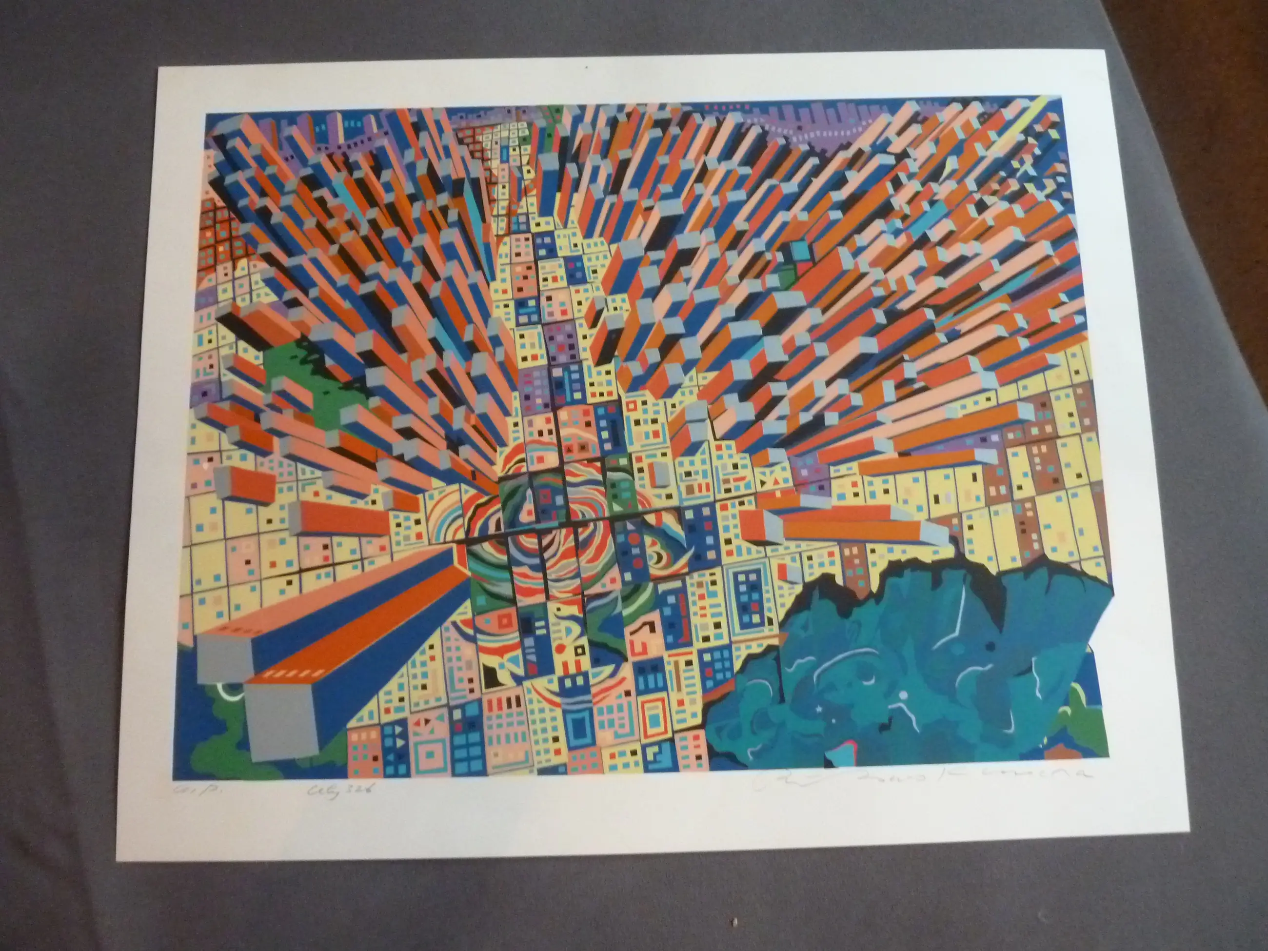 Fantastische zeefdruk van de gerenommeerde kunstenaar en meester van het perspectief. Handtekening rechtsonder. Ook getiteld "City 326" linksonder.