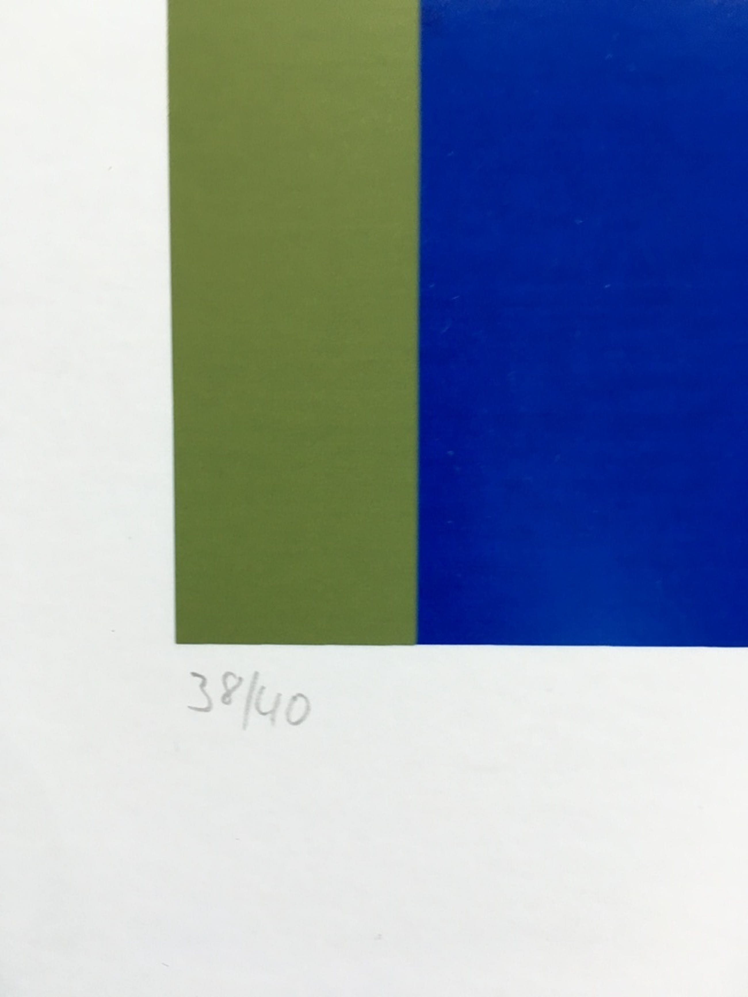 Ingelijst (met of zonder Passe Partout) een zeer modern strak werk in mooie kleuren litho-druk.