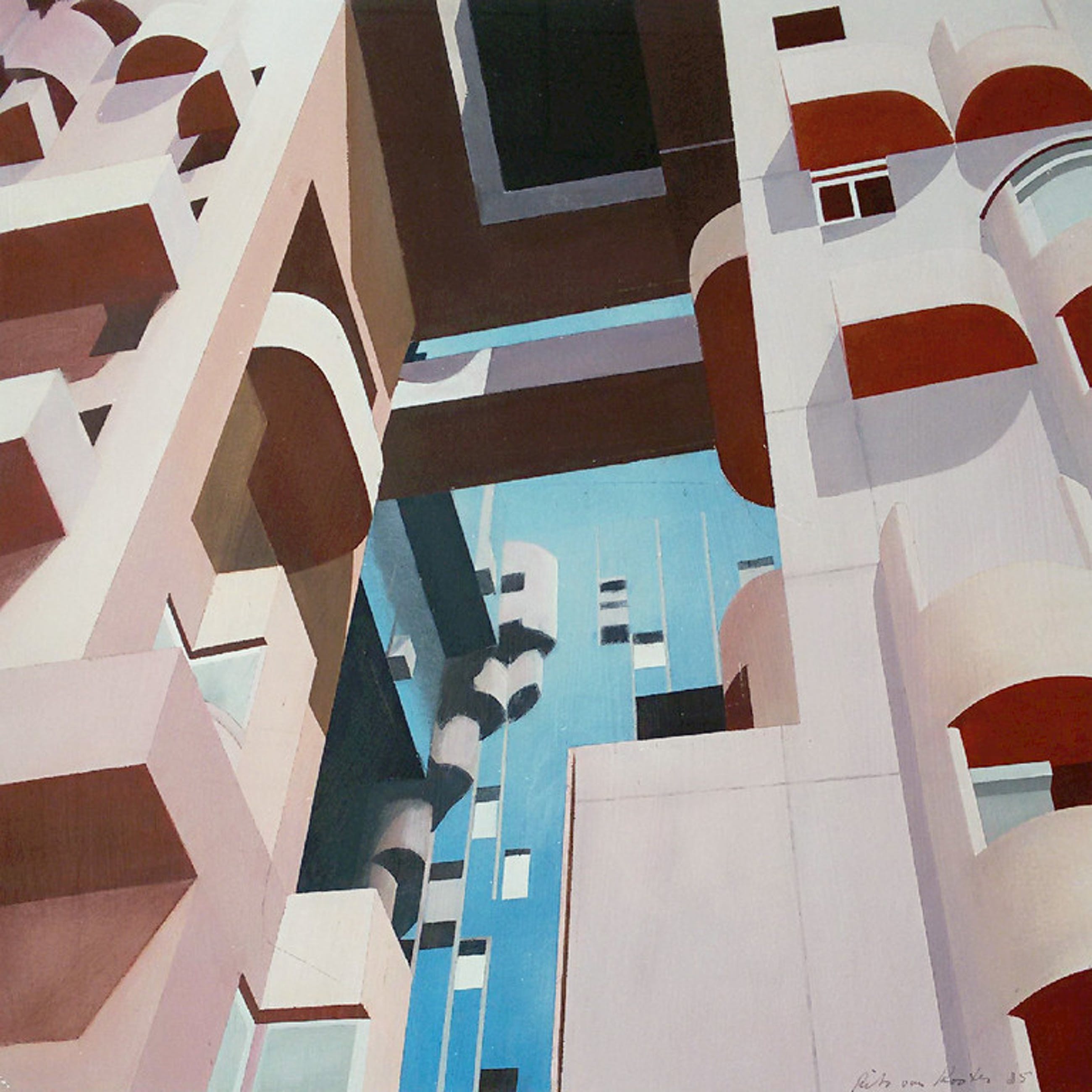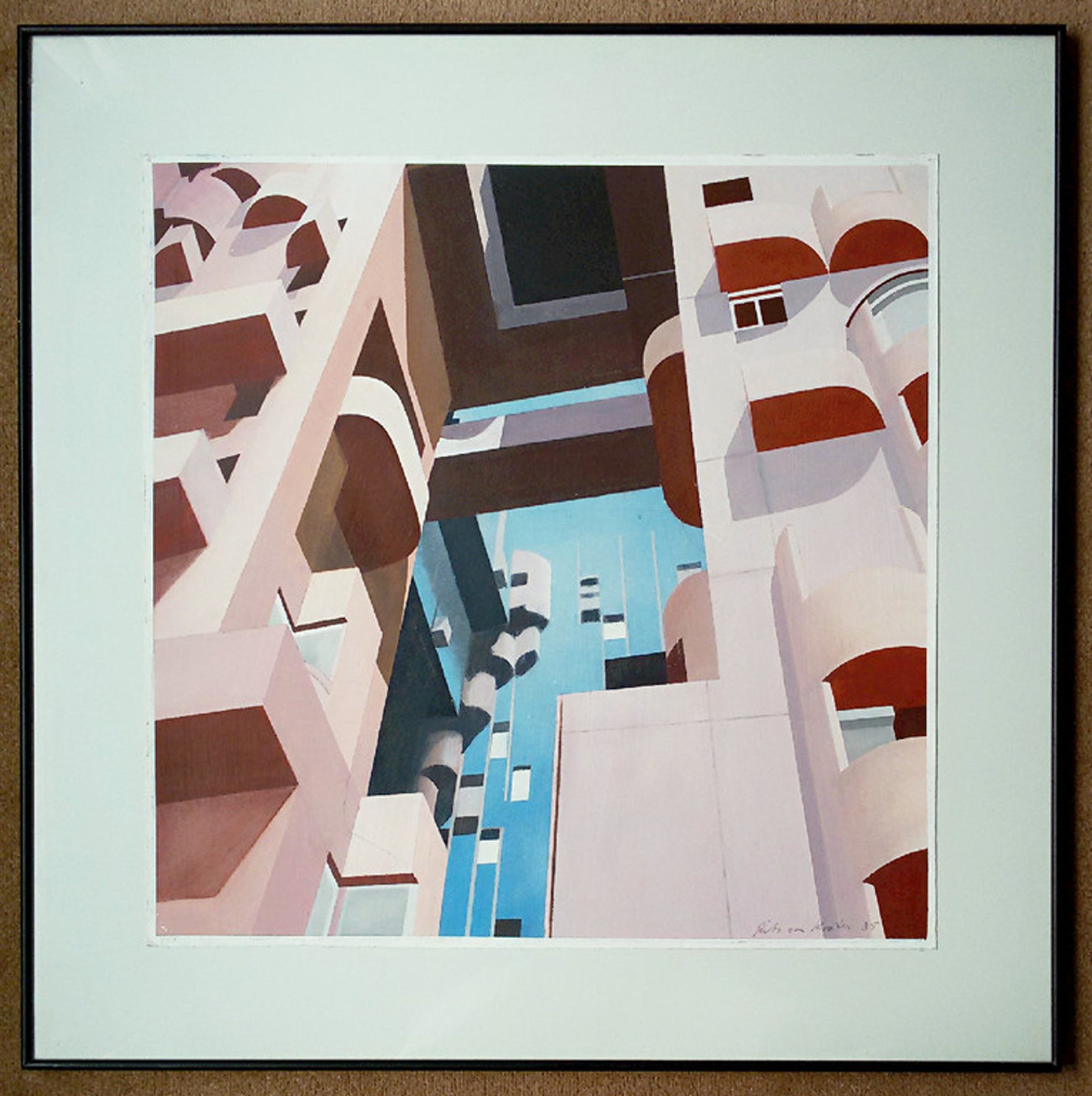 Zeer mooi werk van Rits van Kooten, die zowel architect als kunstenaar was. Het schilderij geeft een detail weer van het door de Catalaanse architect Ricardo Bofill ontworpen complex Walden 7 vlakbij Barcelona. Gemengde techniek (gouacheverf, olieverf, collage?) op papier, gesigneerd en gedateerd (85) rechtsonder. In strakke lijst, achter glas. Alles in zeer goede conditie.